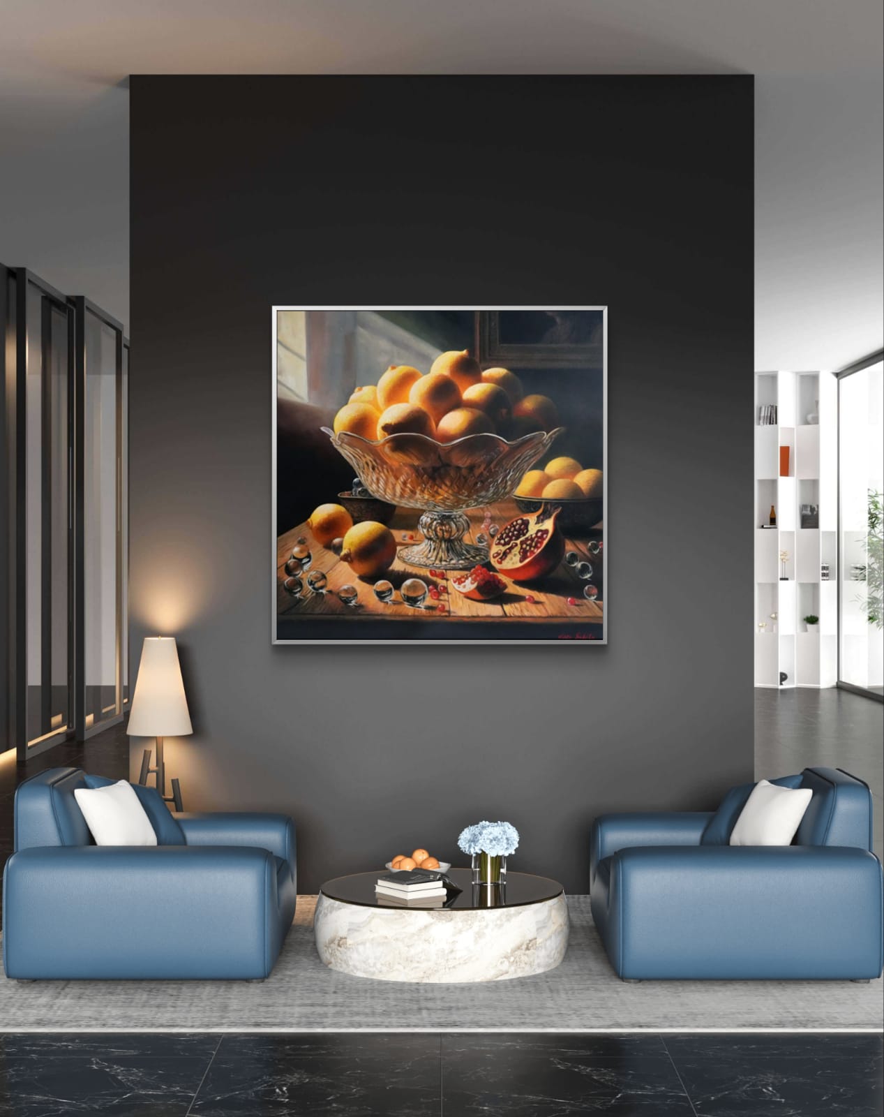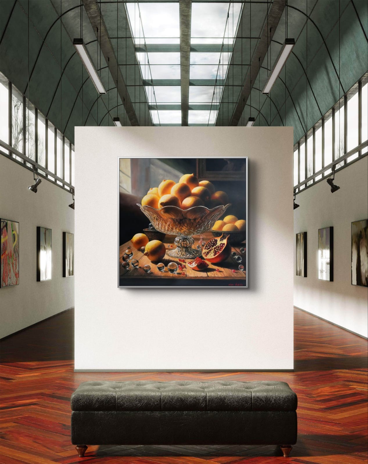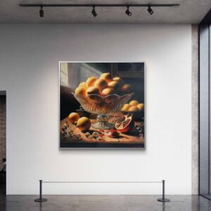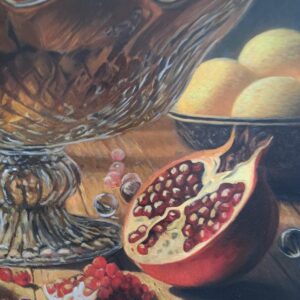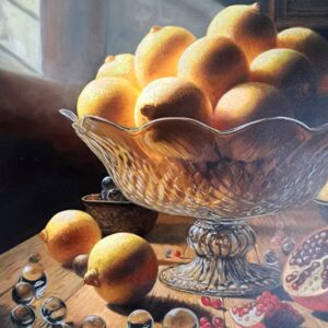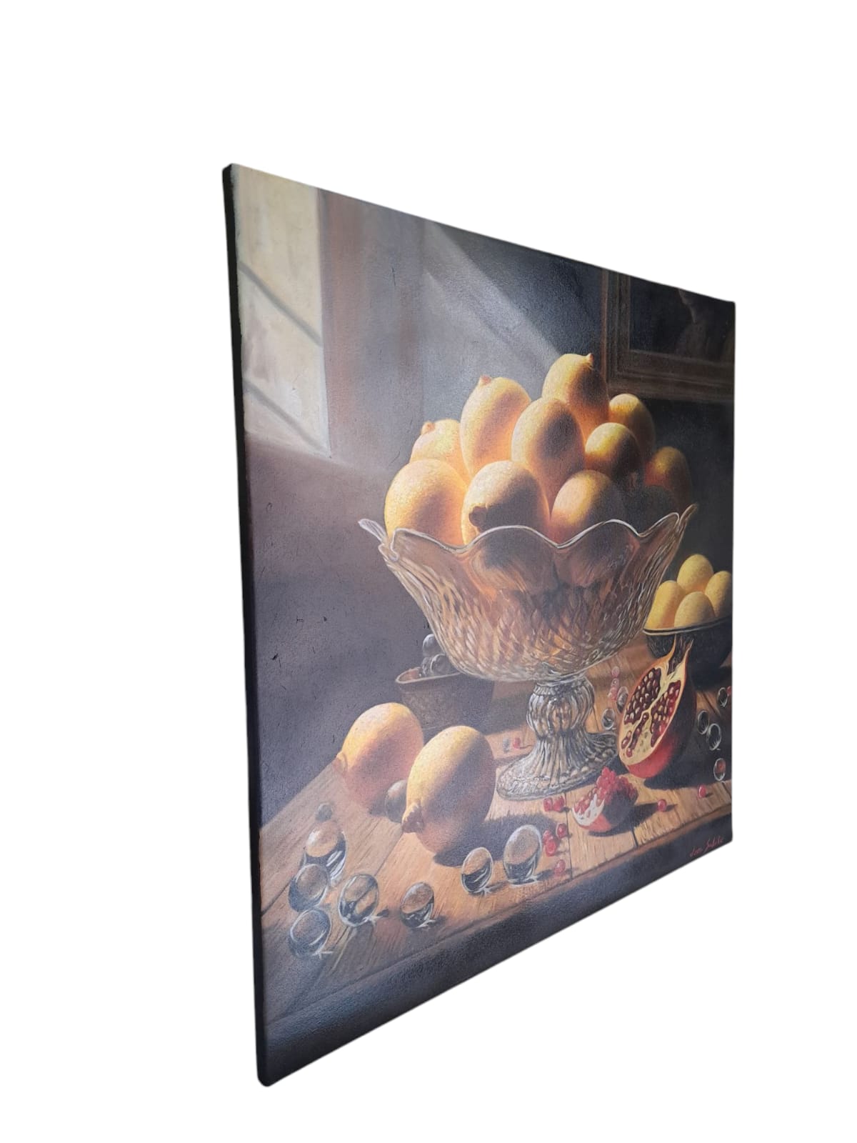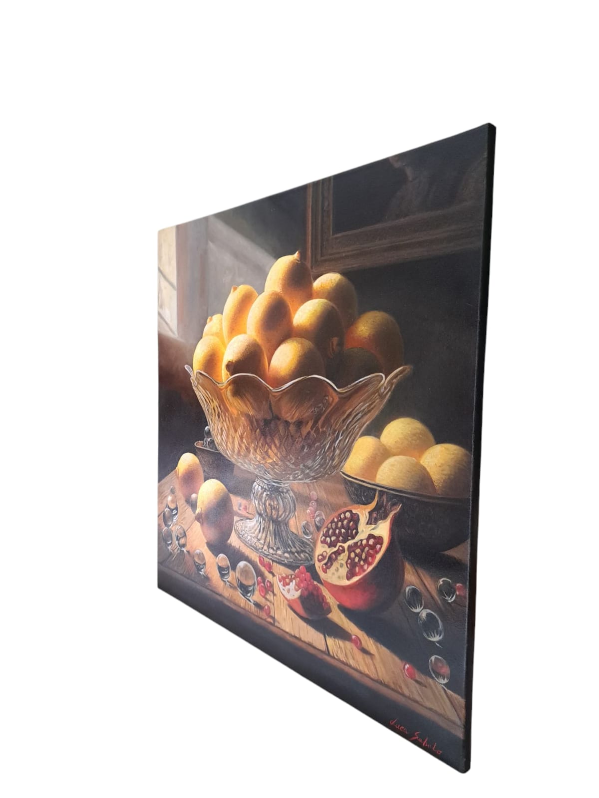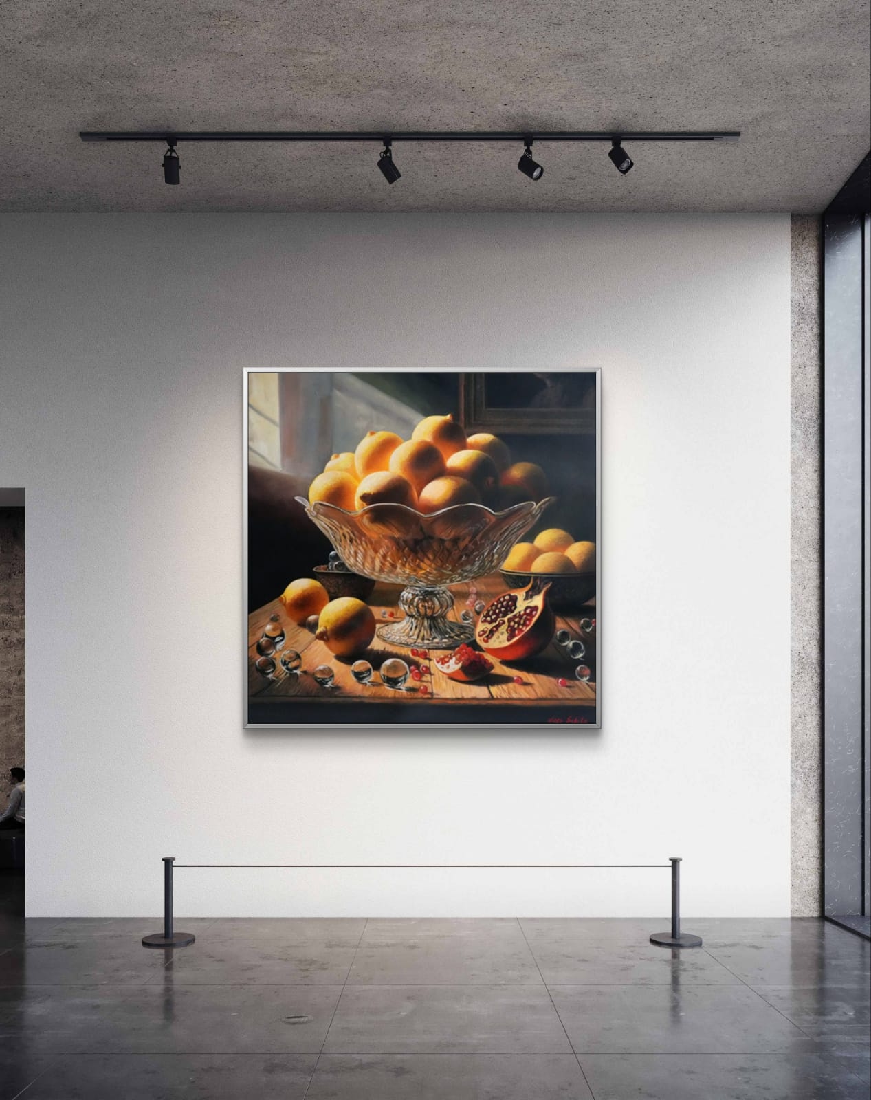 “Dialogo di Ombre e Colori nasce dal mio desiderio di esplorare il sottile equilibrio tra gli oggetti e lo spazio circostante, creando una composizione che catturi non solo l’aspetto visivo, ma anche una narrazione più profonda. La tela presenta un centrotavola con alzata colmo di limoni, il cui giallo vivace contrasta con le tonalità più morbide e calde dello sfondo. Un melograno aperto rivela i suoi semi brillanti, introducendo una nota di rosso che aggiunge un tocco di intensità alla scena.