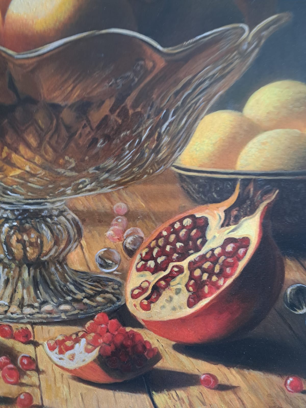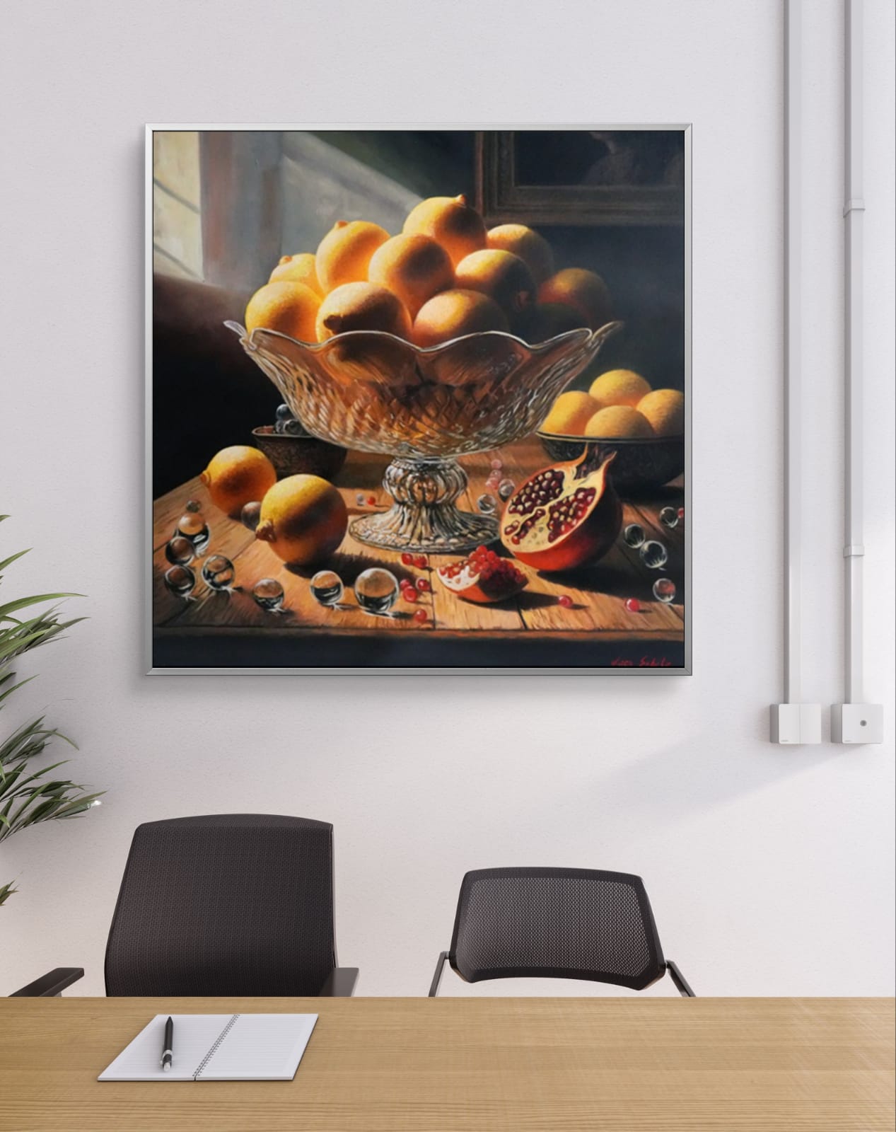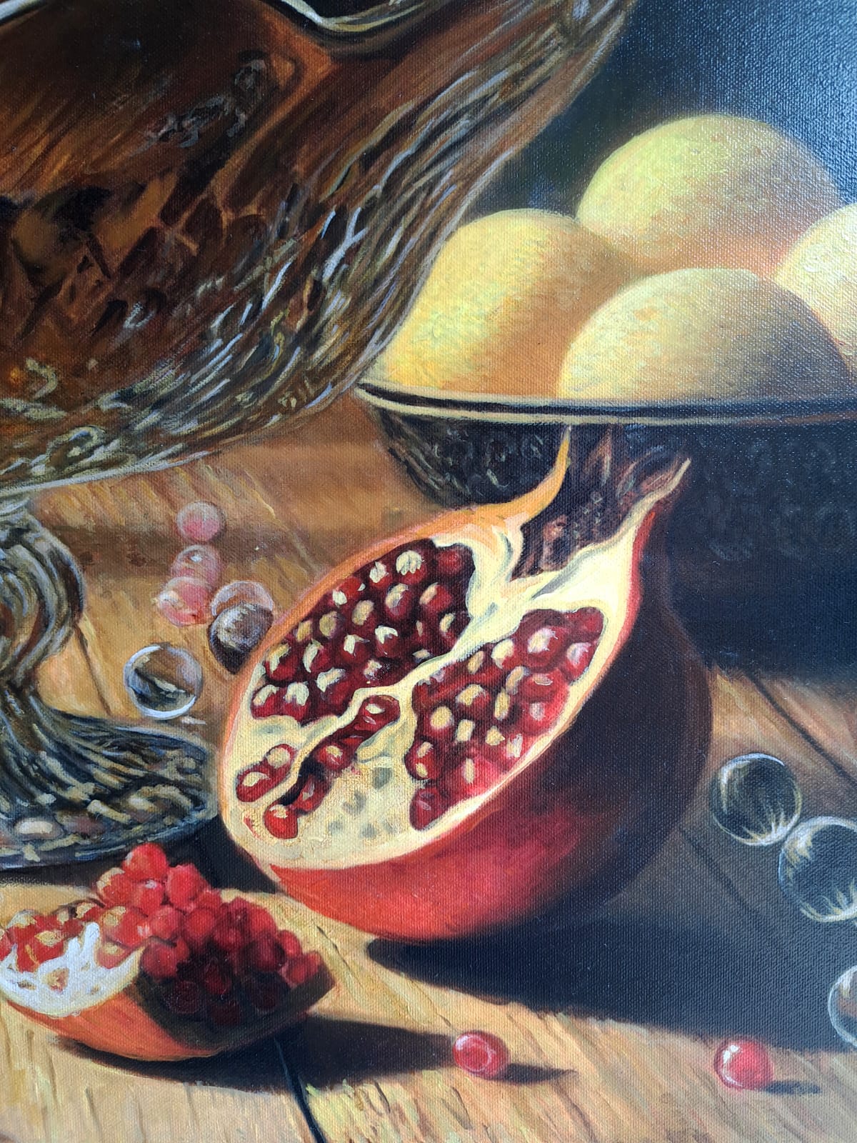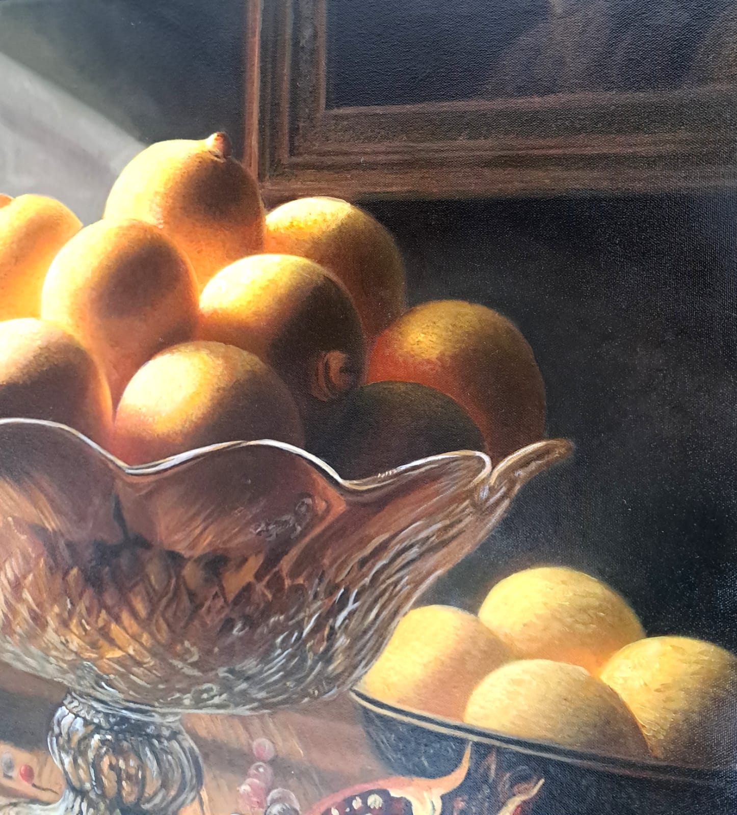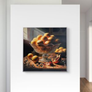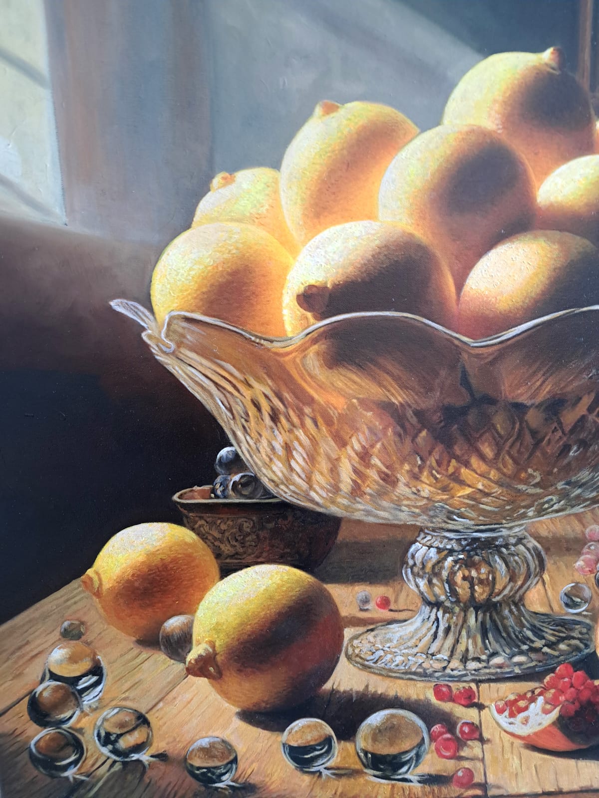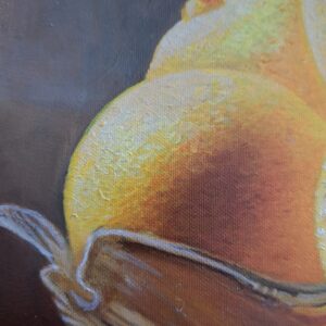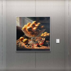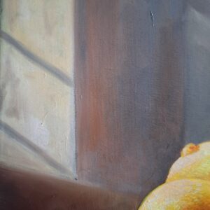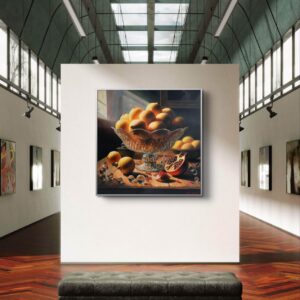 “Dialogo di Ombre e Colori nasce dal mio desiderio di esplorare il sottile equilibrio tra gli oggetti e lo spazio circostante, creando una composizione che catturi non solo l’aspetto visivo, ma anche una narrazione più profonda. La tela presenta un centrotavola con alzata colmo di limoni, il cui giallo vivace contrasta con le tonalità più morbide e calde dello sfondo. Un melograno aperto rivela i suoi semi brillanti, introducendo una nota di rosso che aggiunge un tocco di intensità alla scena.