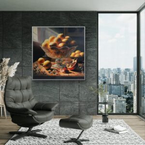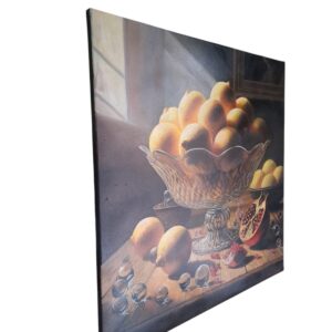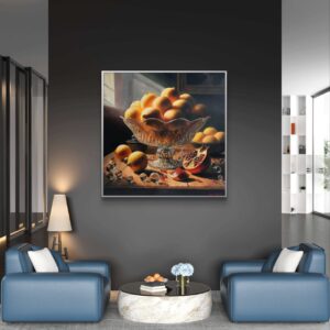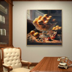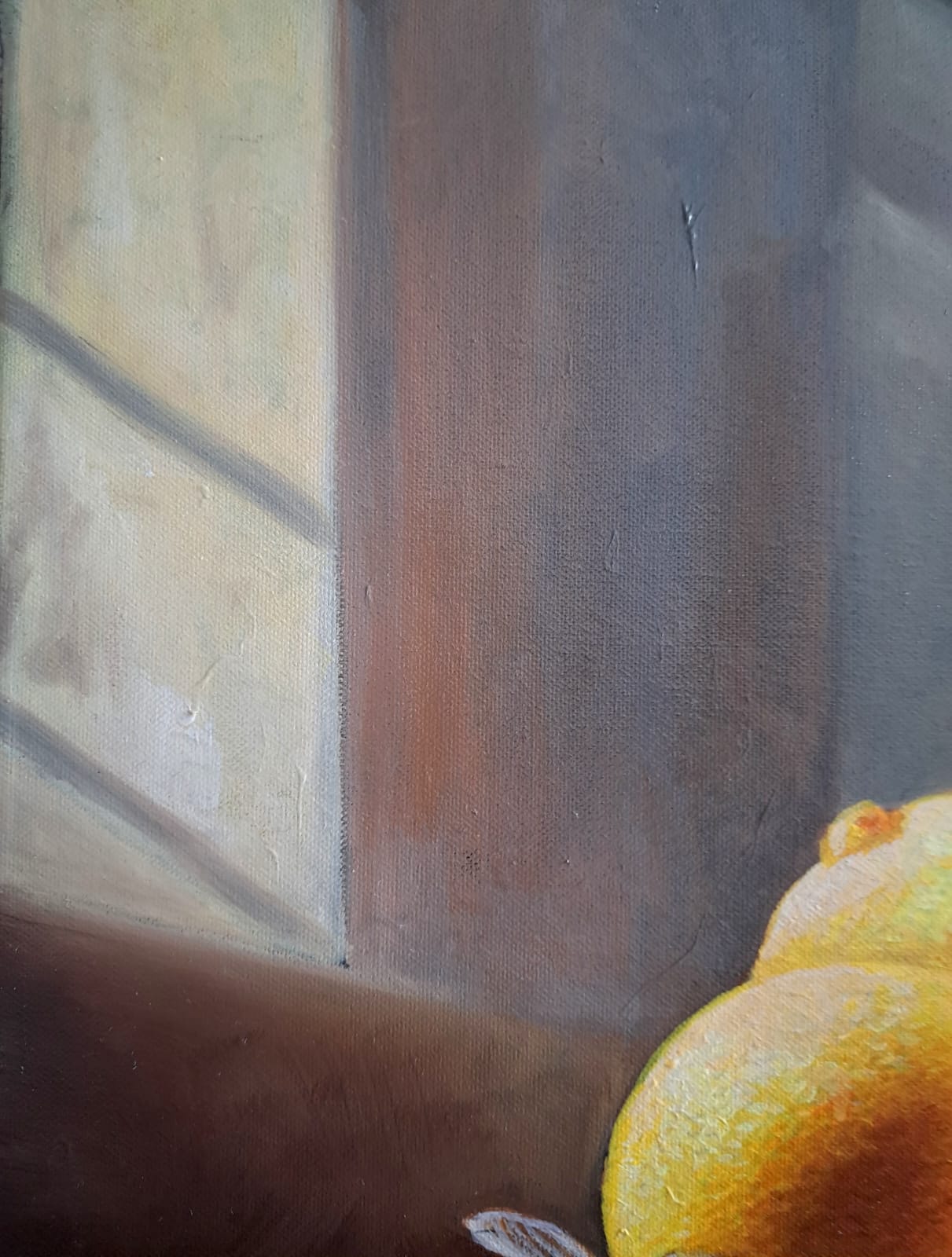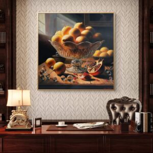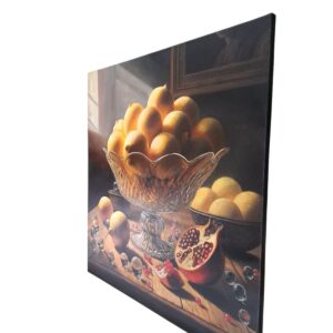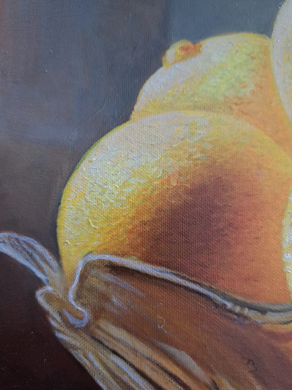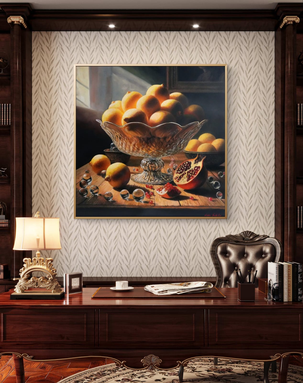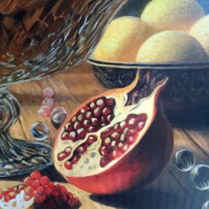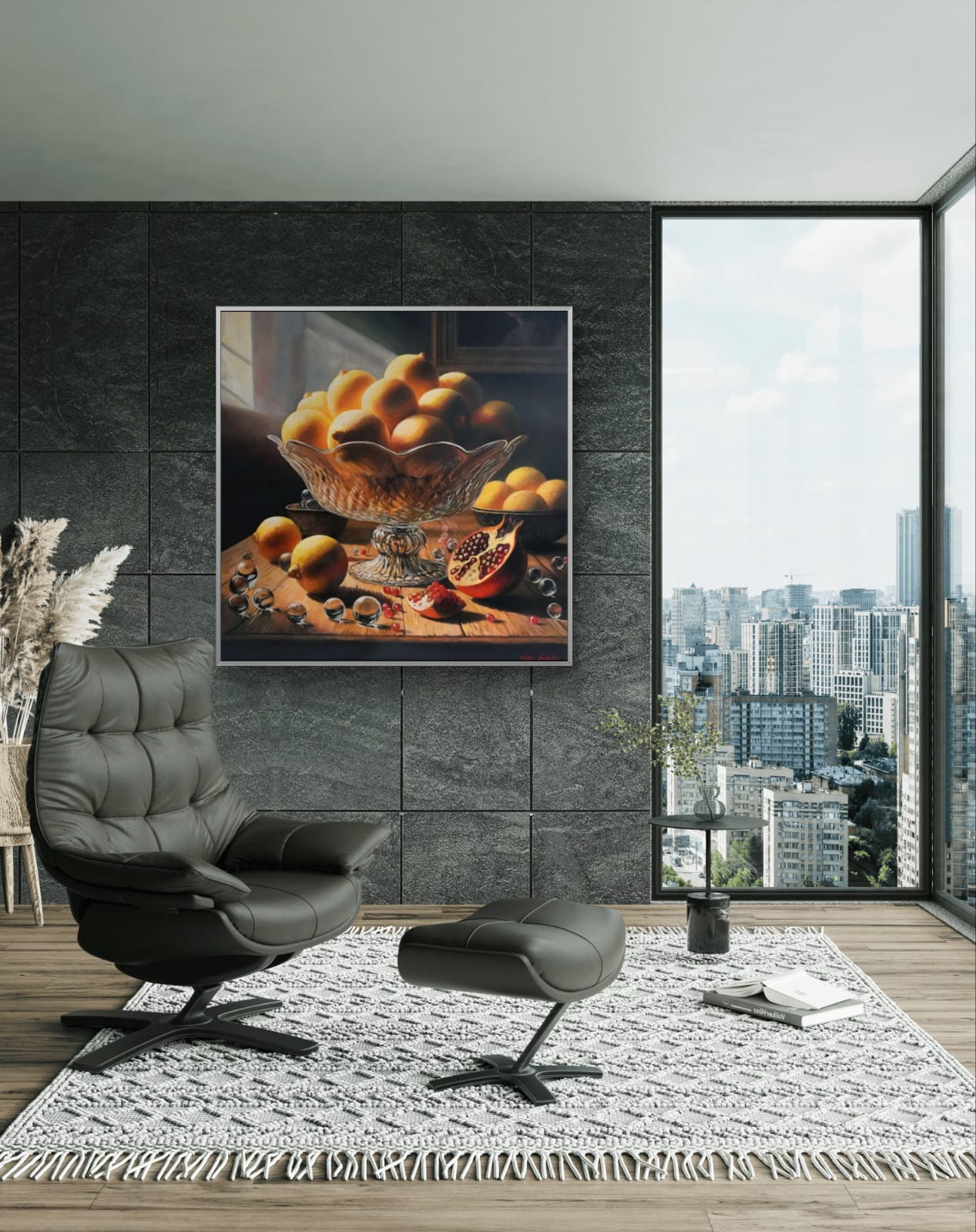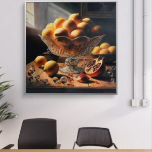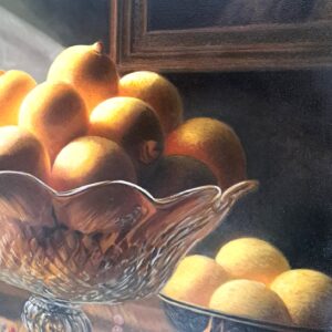 “Dialogo di Ombre e Colori nasce dal mio desiderio di esplorare il sottile equilibrio tra gli oggetti e lo spazio circostante, creando una composizione che catturi non solo l’aspetto visivo, ma anche una narrazione più profonda. La tela presenta un centrotavola con alzata colmo di limoni, il cui giallo vivace contrasta con le tonalità più morbide e calde dello sfondo. Un melograno aperto rivela i suoi semi brillanti, introducendo una nota di rosso che aggiunge un tocco di intensità alla scena.