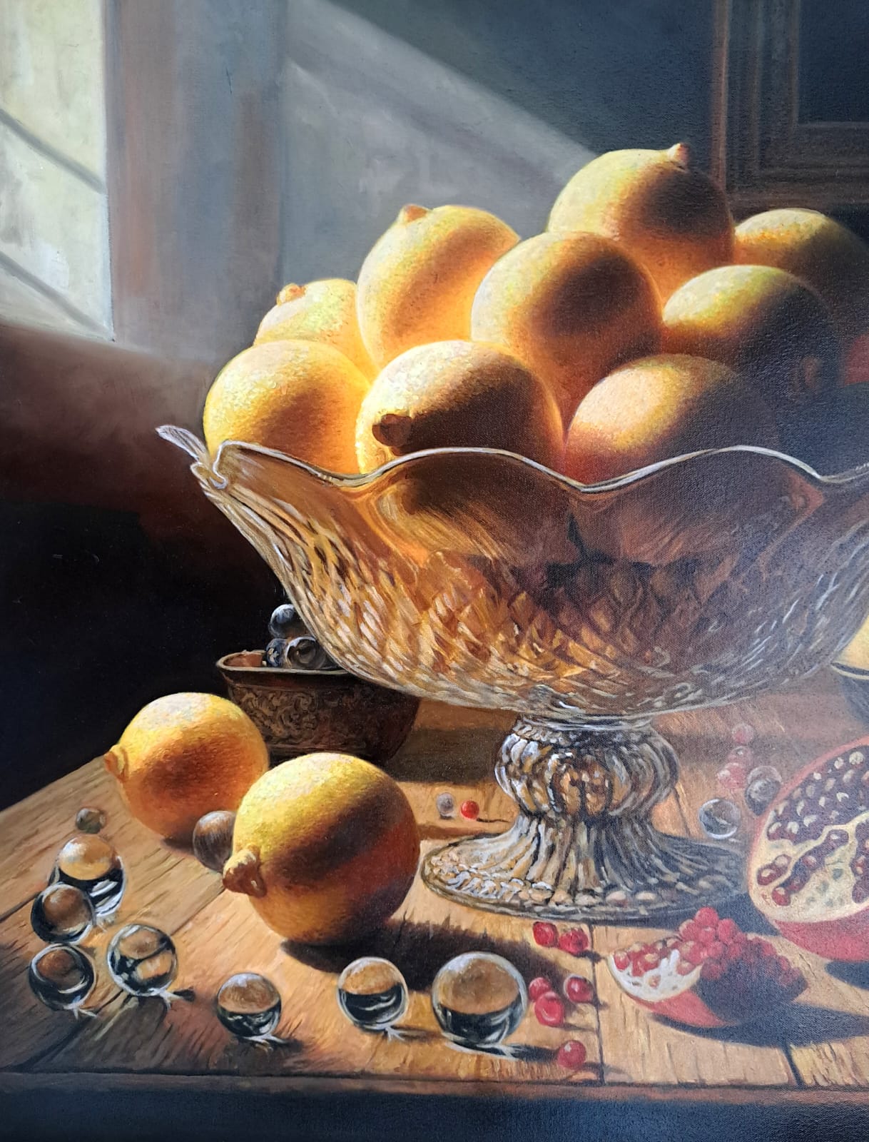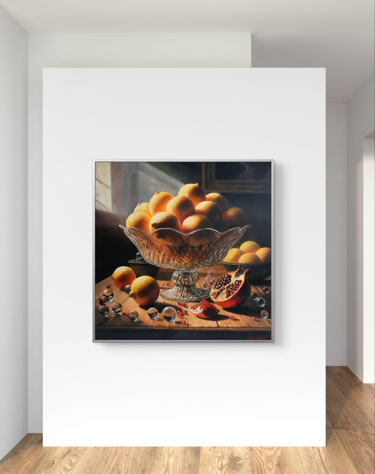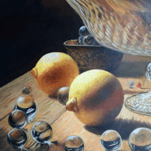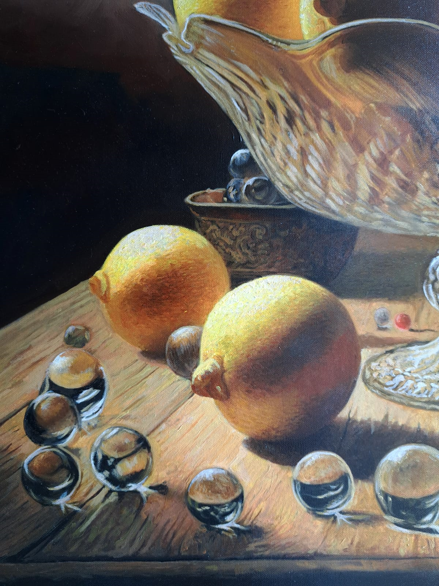 Ogni elemento, dalla disposizione dei frutti ai riflessi delle biglie, è stato studiato per creare un dialogo visivo tra luce e ombra, tra colore e silenzio. Non considero questa opera un confronto con i grandi maestri che ammiro, ma un’umile ricerca di quel dialogo che essi hanno saputo instaurare con la realtà e con lo spirito del loro tempo.