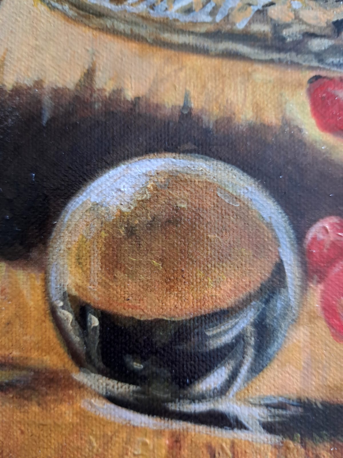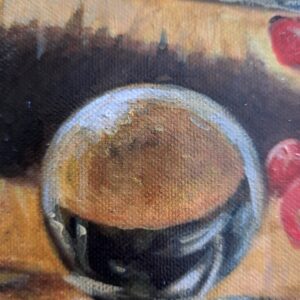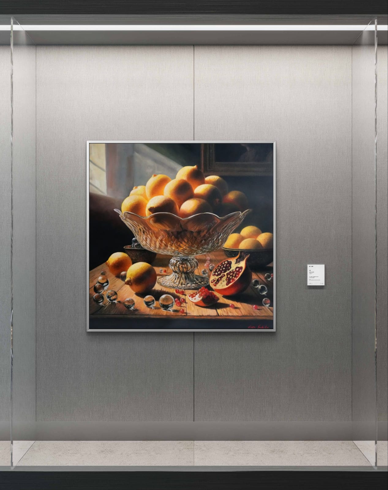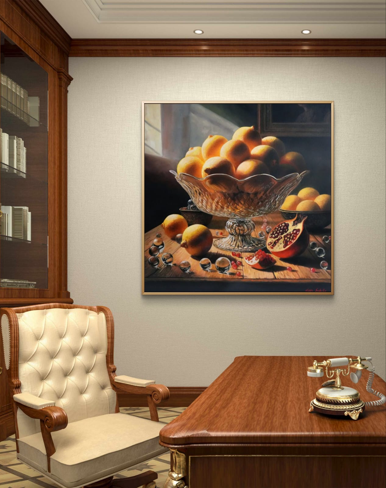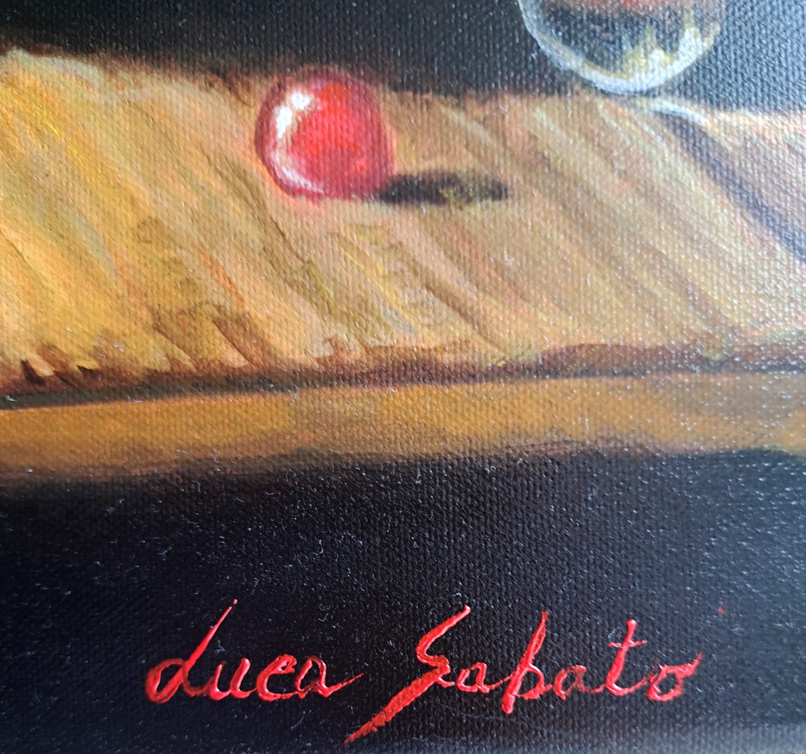 Ogni elemento, dalla disposizione dei frutti ai riflessi delle biglie, è stato studiato per creare un dialogo visivo tra luce e ombra, tra colore e silenzio. Non considero questa opera un confronto con i grandi maestri che ammiro, ma un’umile ricerca di quel dialogo che essi hanno saputo instaurare con la realtà e con lo spirito del loro tempo.