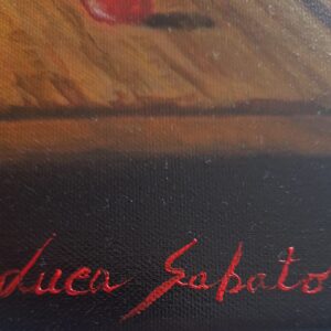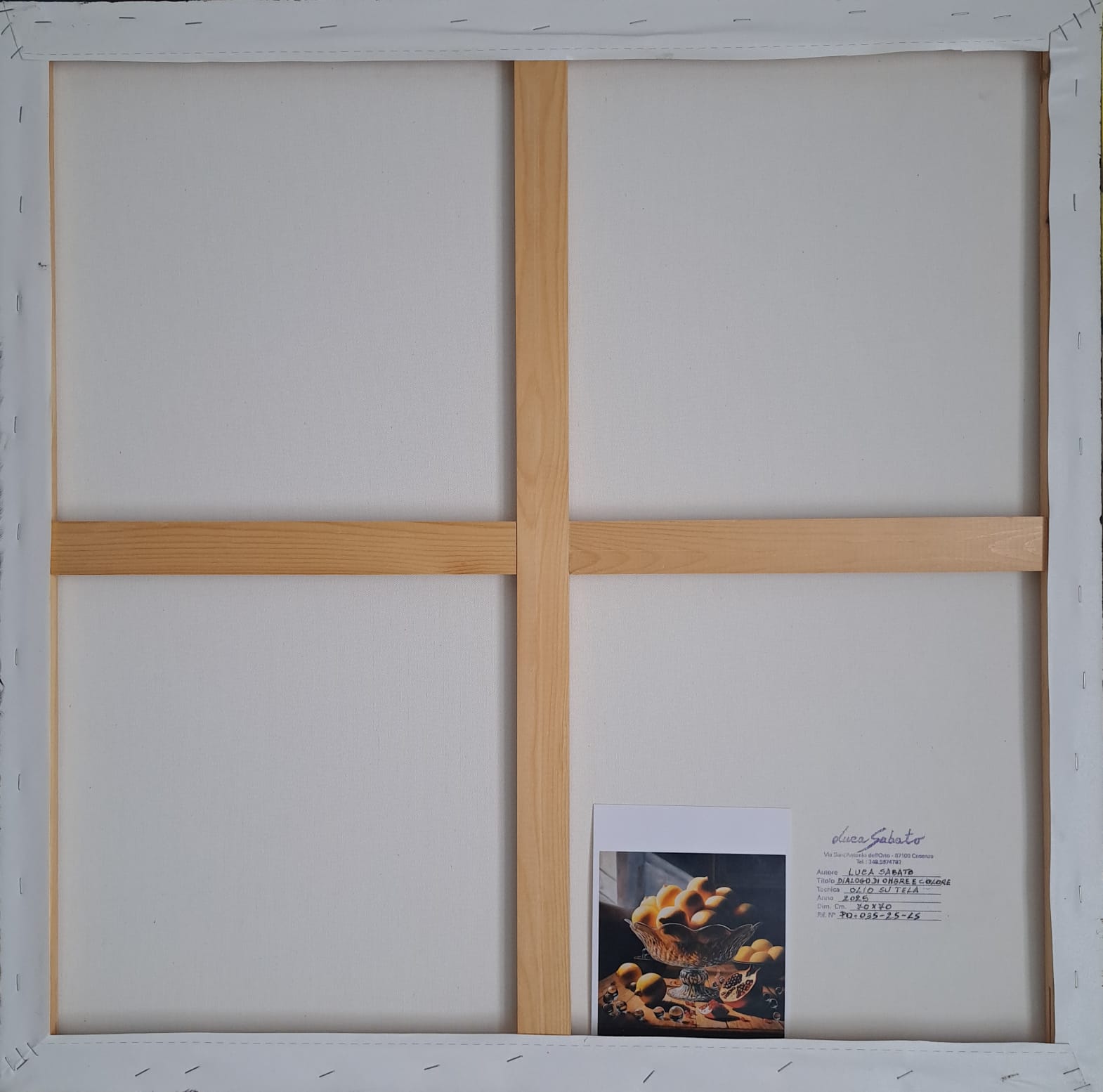 Sul fondo, appeso alla parete, un quadro emerge discretamente dall’ombra, suggerendo una dimensione narrativa ulteriore. Il dipinto nel dipinto funge da collegamento tra il presente e il passato, un omaggio alla tradizione pittorica che mi ispira e che cerco di reinterpretare. La sua posizione all’interno della composizione non è casuale: collega idealmente la luce che colpisce gli oggetti in primo piano con le ombre che si addentrano nella profondità della scena.