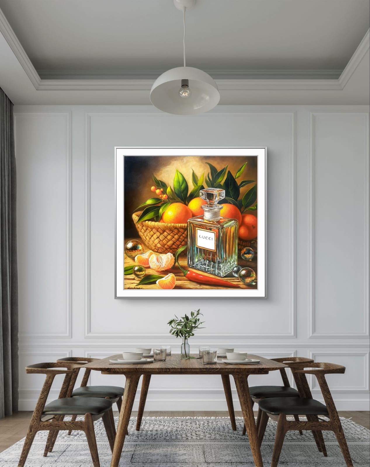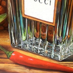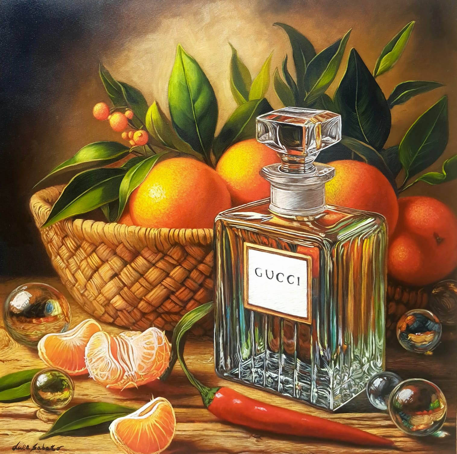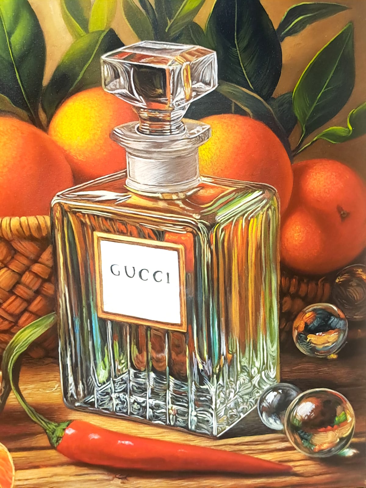 ​Al centro della composizione, in un contrasto deliberato, domina un’elegante boccetta di profumo con il logo Gucci. Ho voluto usare questo oggetto come metafora dell’Essenza: il profumo è l’estrazione più raffinata (e più costosa) di un odore, un tentativo umano di replicare, attraverso il brand, ciò che la natura offre spontaneamente. Le sfere di vetro sul tavolo riflettono e distorcono la scena, invitando a riflettere sull’illusione di valore.