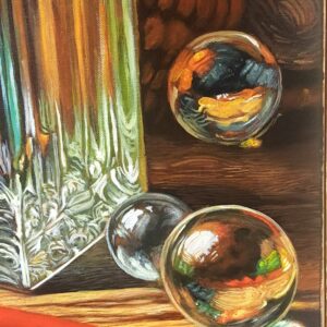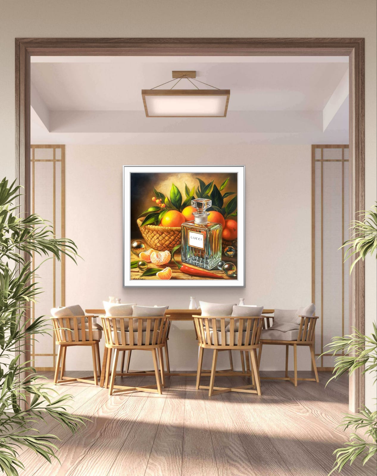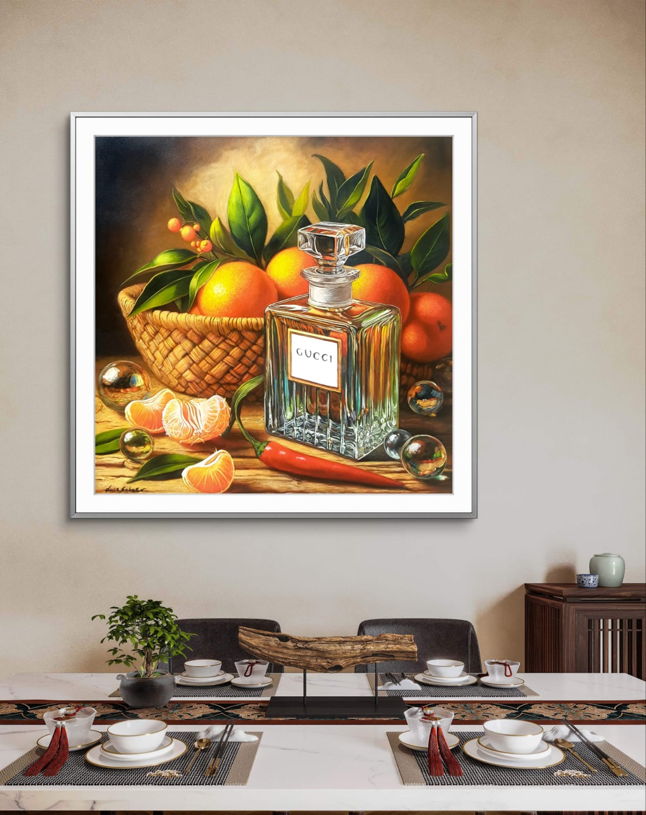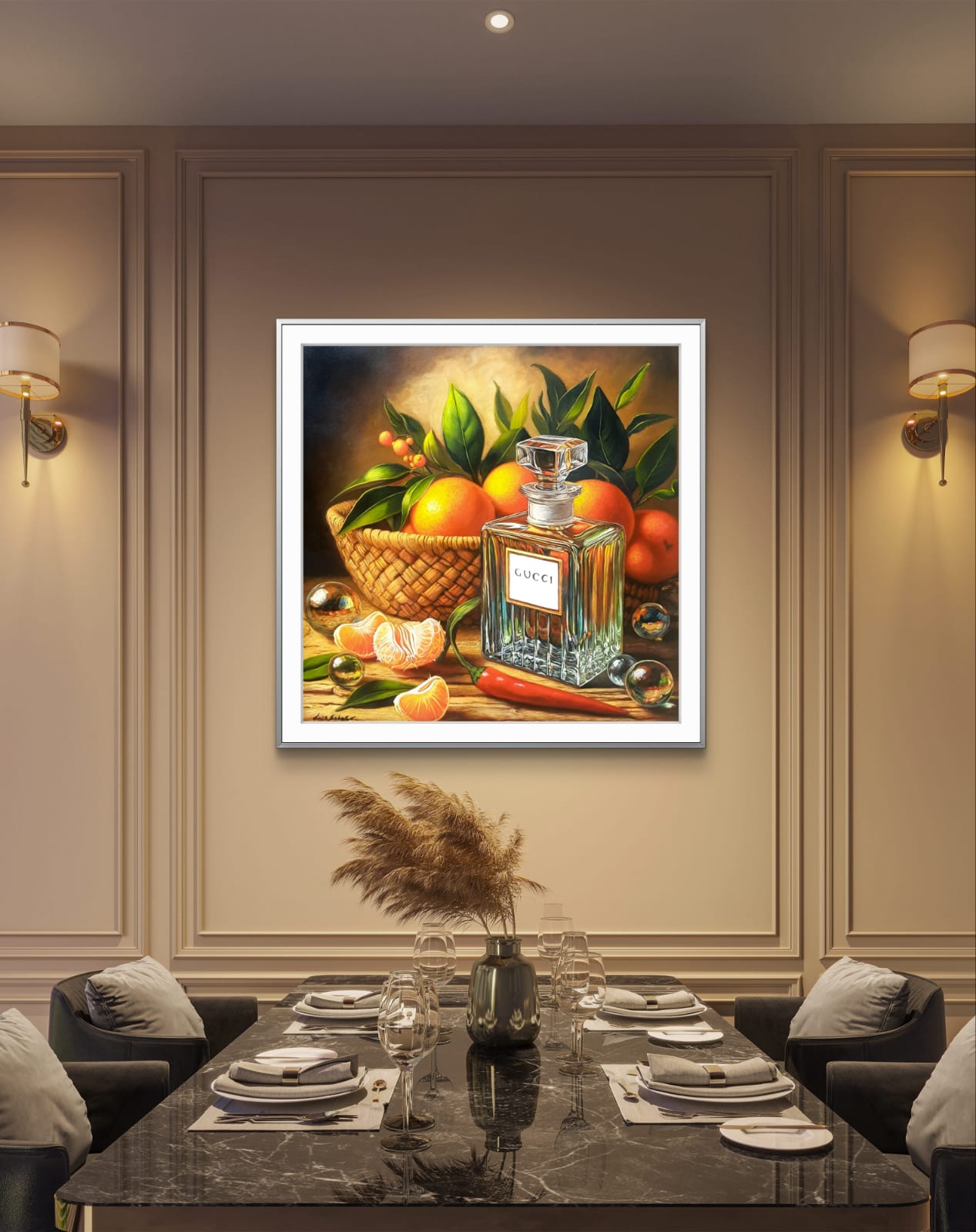 ​Al centro della composizione, in un contrasto deliberato, domina un’elegante boccetta di profumo con il logo Gucci. Ho voluto usare questo oggetto come metafora dell’Essenza: il profumo è l’estrazione più raffinata (e più costosa) di un odore, un tentativo umano di replicare, attraverso il brand, ciò che la natura offre spontaneamente. Le sfere di vetro sul tavolo riflettono e distorcono la scena, invitando a riflettere sull’illusione di valore.