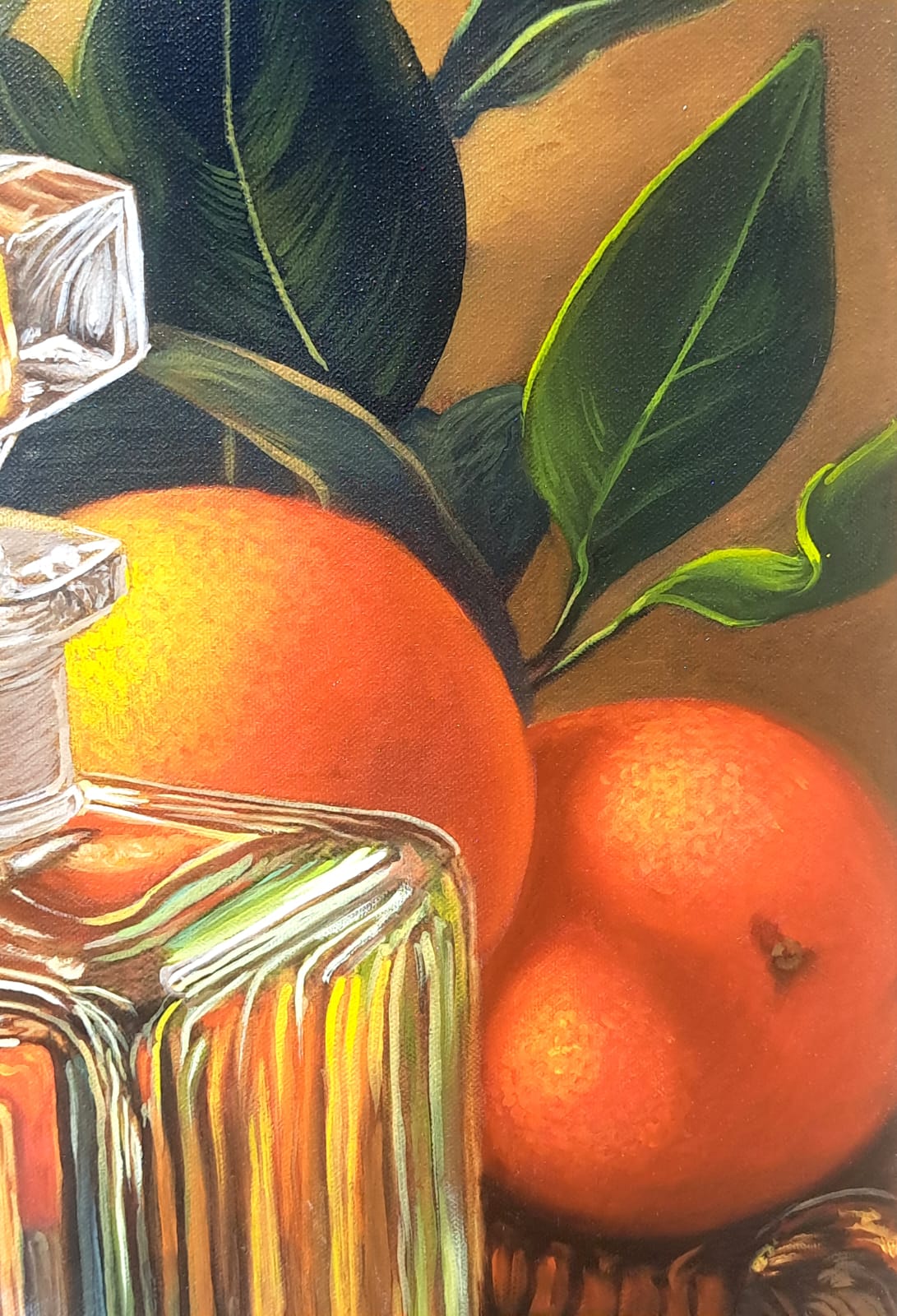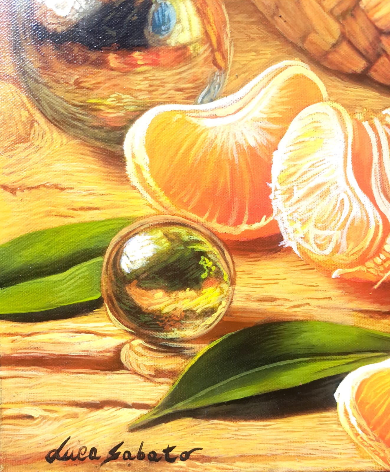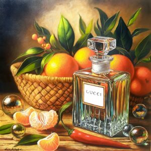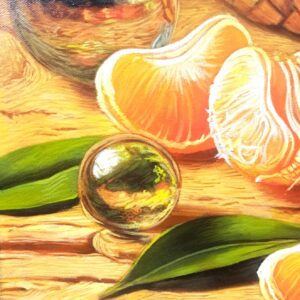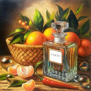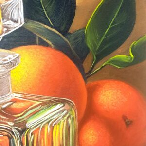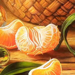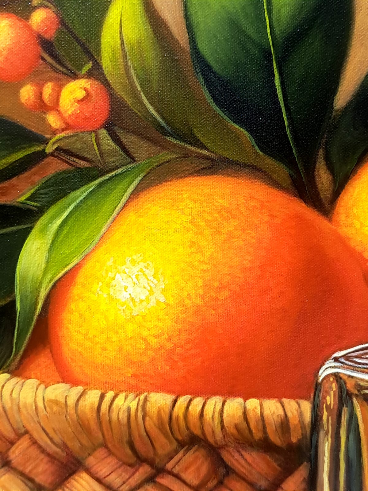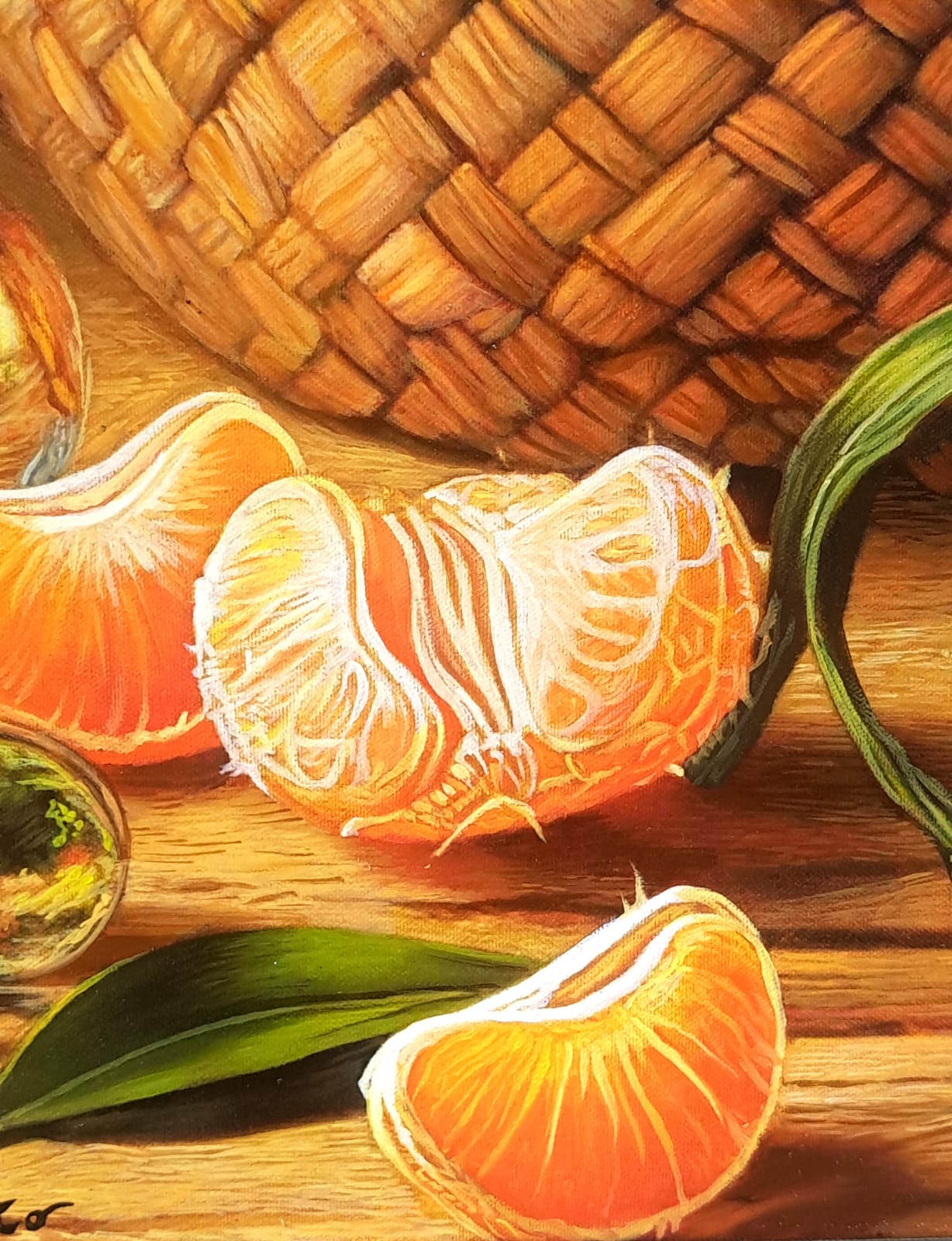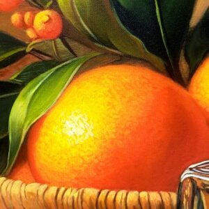 ​In questa tela di natura morta, ho cercato di celebrare il mio legame con il Sud Italia attraverso l’esplosione dei suoi frutti: mandarini e arance che straripano dal cesto in un tripudio di colore e foglie. La vita e la passione della mia terra sono enfatizzate dal peperoncino rosso acceso che giace in primo piano, simbolo di fuoco e di vitalità.