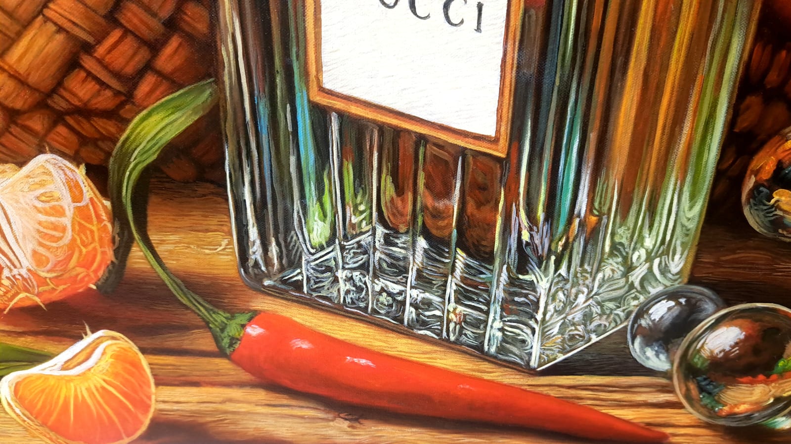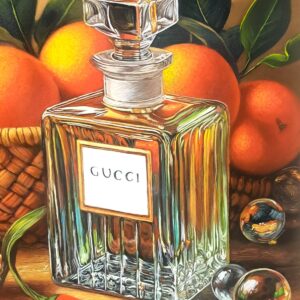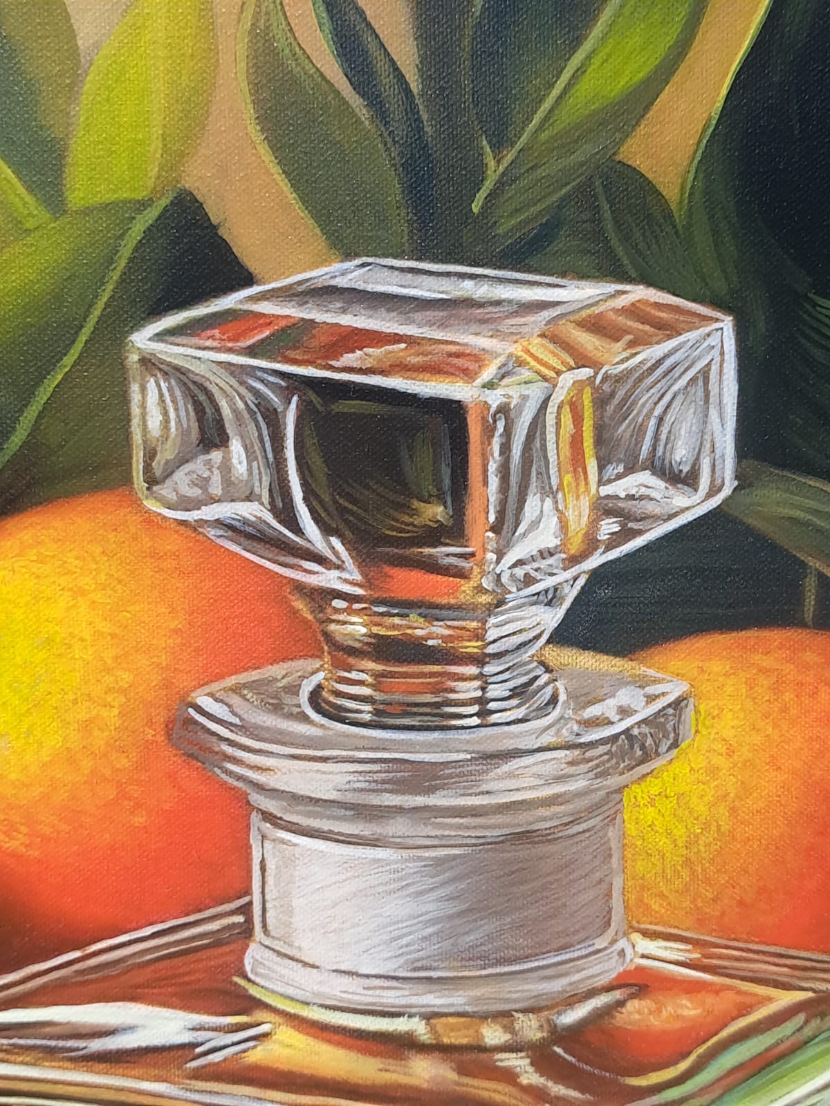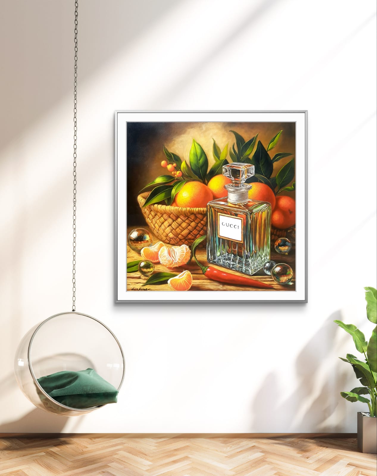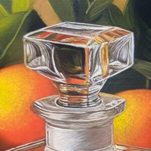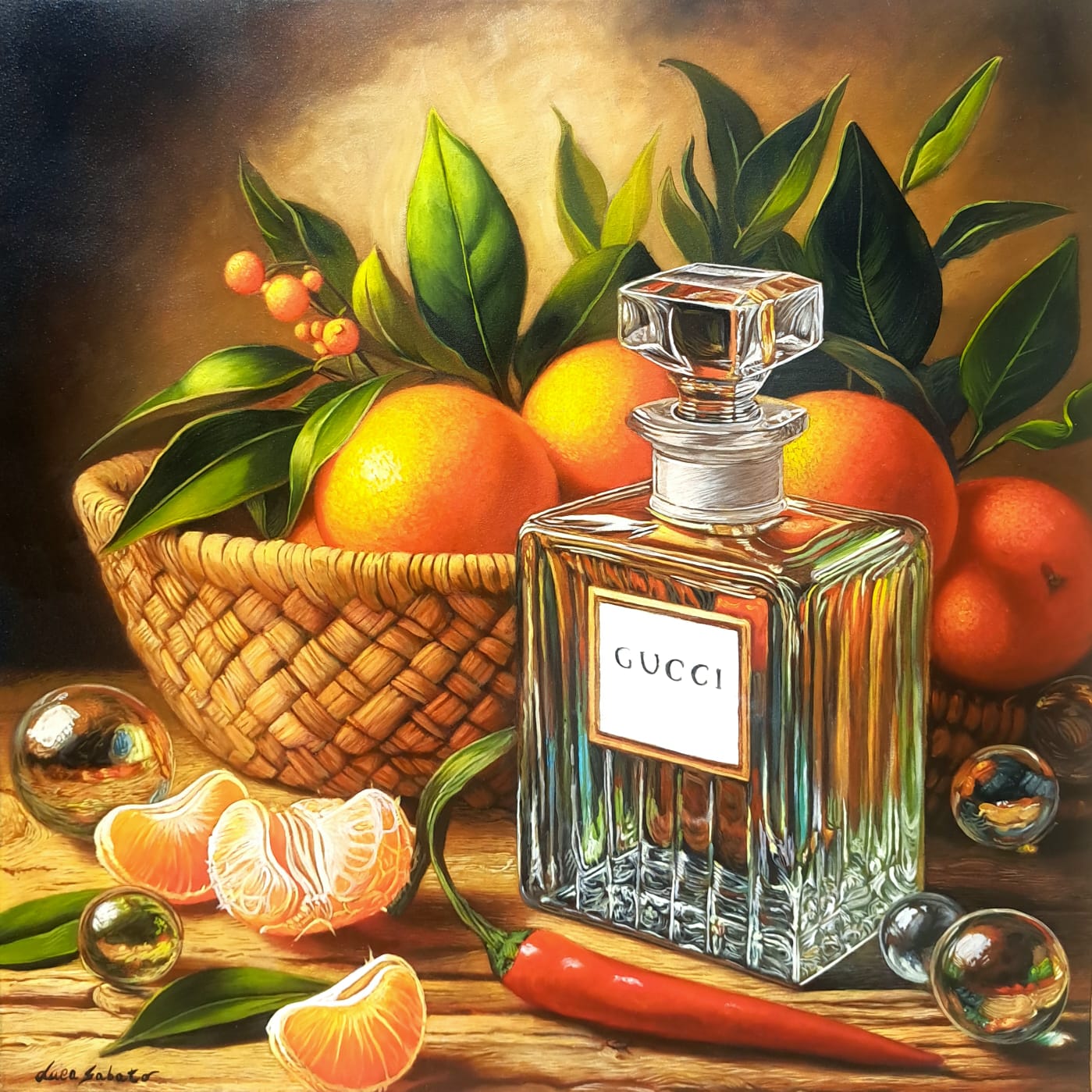 ​In questa tela di natura morta, ho cercato di celebrare il mio legame con il Sud Italia attraverso l’esplosione dei suoi frutti: mandarini e arance che straripano dal cesto in un tripudio di colore e foglie. La vita e la passione della mia terra sono enfatizzate dal peperoncino rosso acceso che giace in primo piano, simbolo di fuoco e di vitalità.