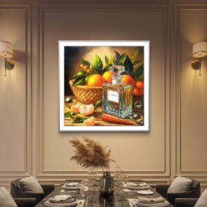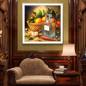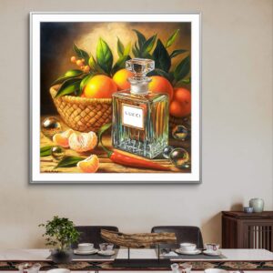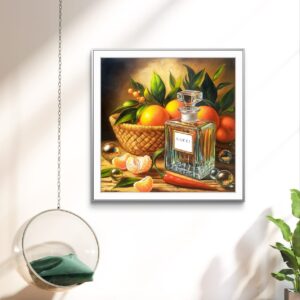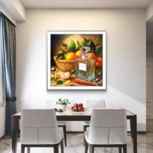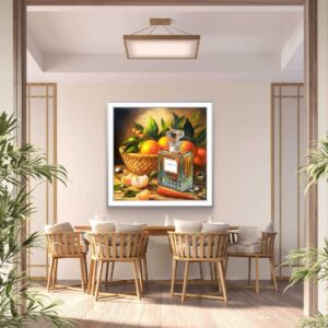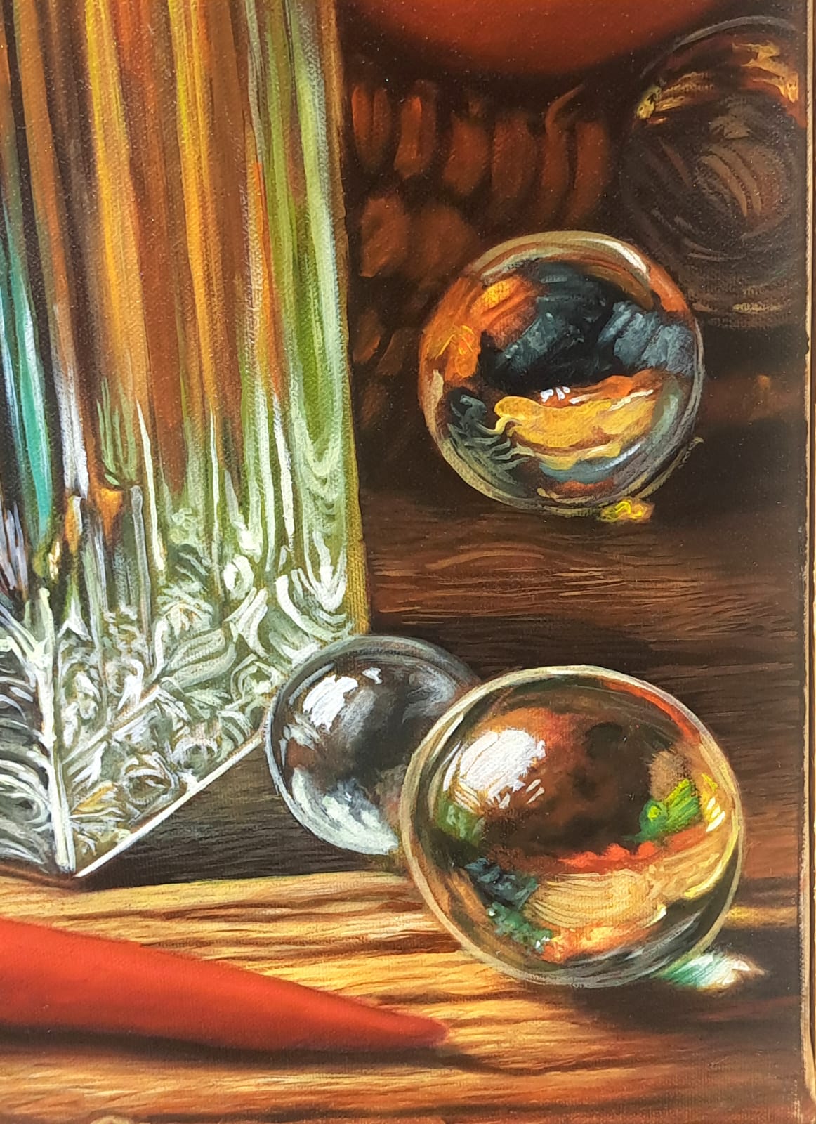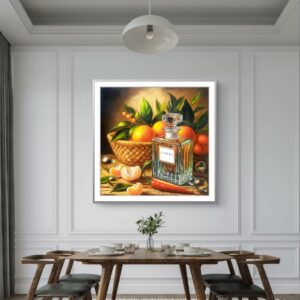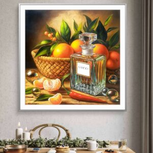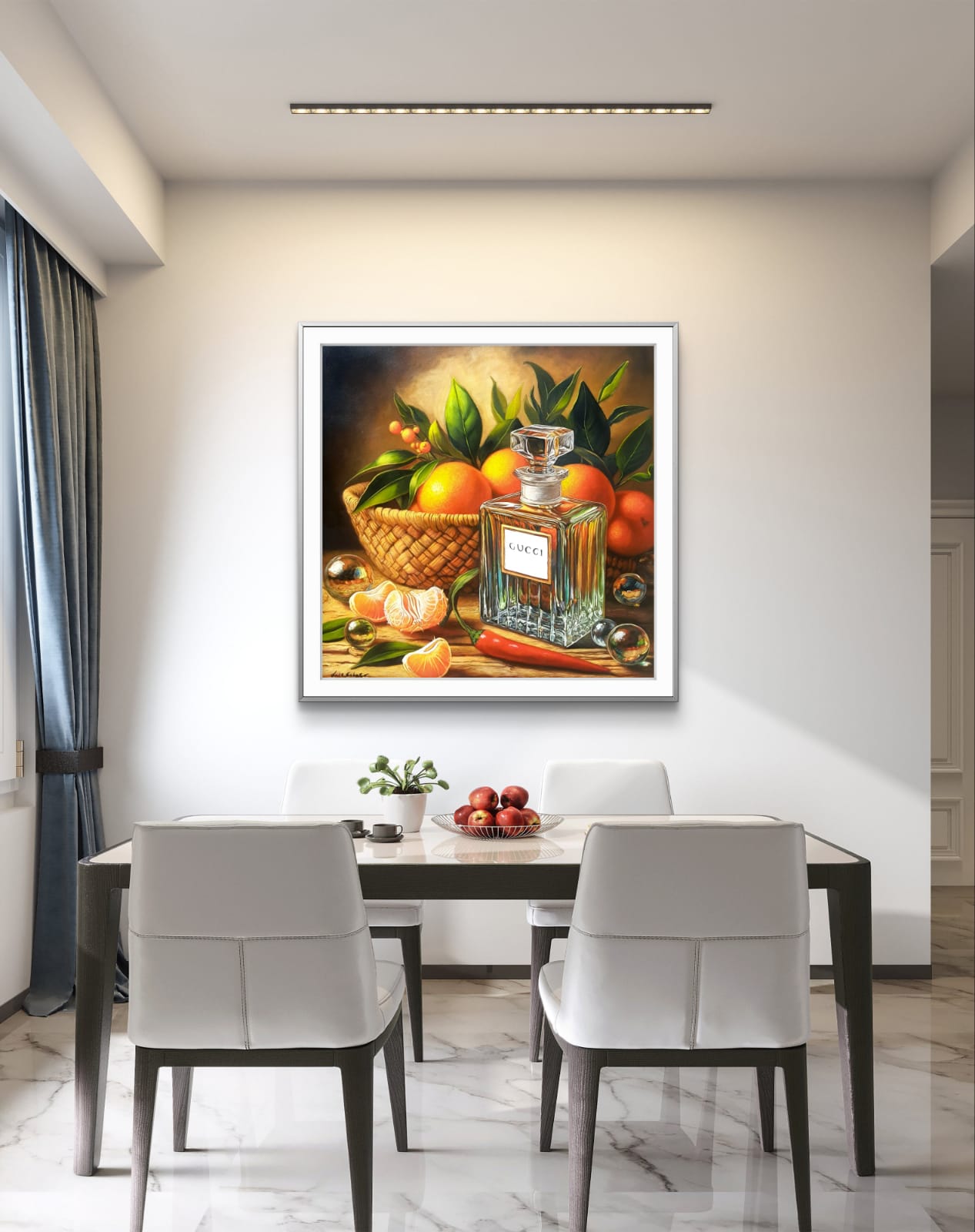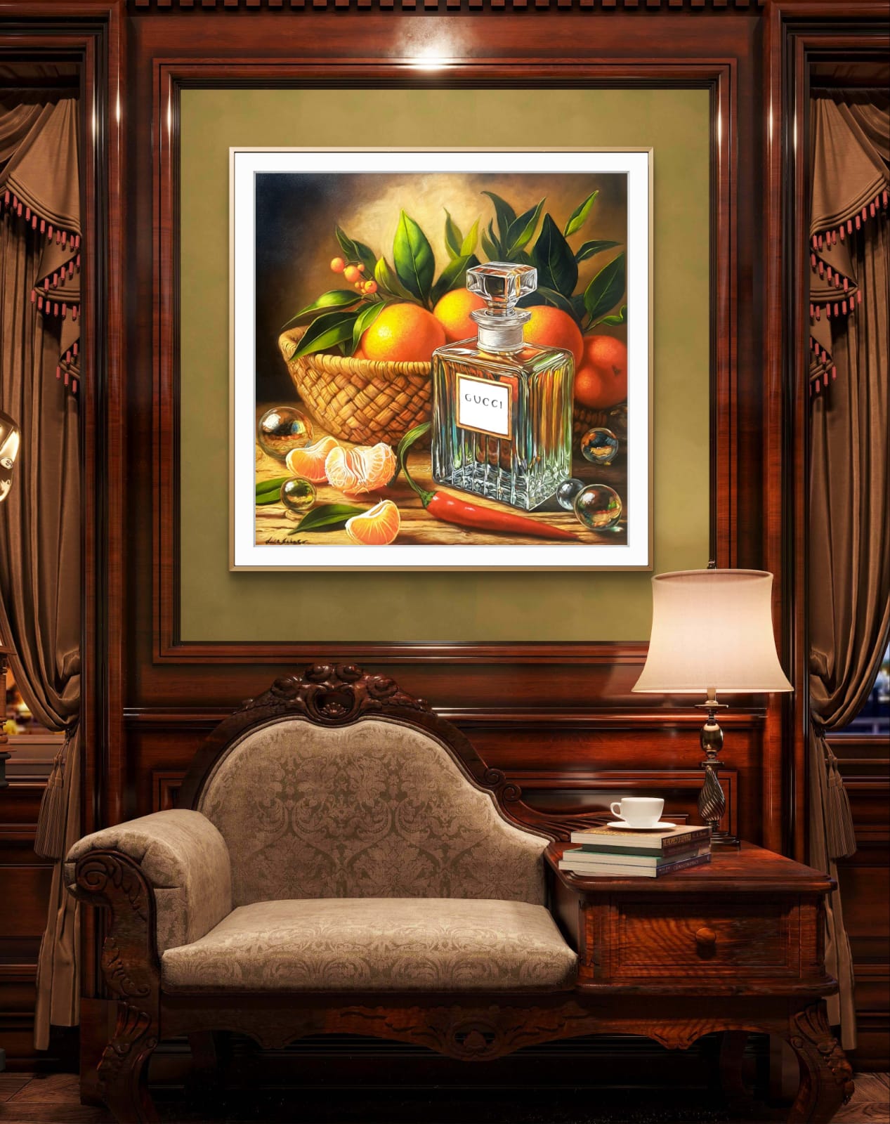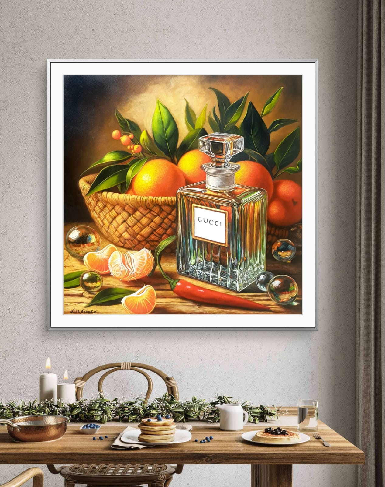 ​In questa tela di natura morta, ho cercato di celebrare il mio legame con il Sud Italia attraverso l’esplosione dei suoi frutti: mandarini e arance che straripano dal cesto in un tripudio di colore e foglie. La vita e la passione della mia terra sono enfatizzate dal peperoncino rosso acceso che giace in primo piano, simbolo di fuoco e di vitalità.