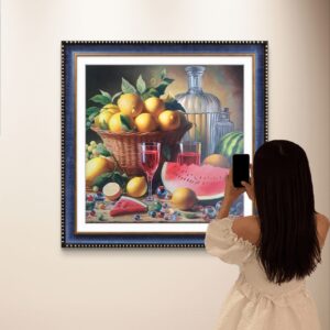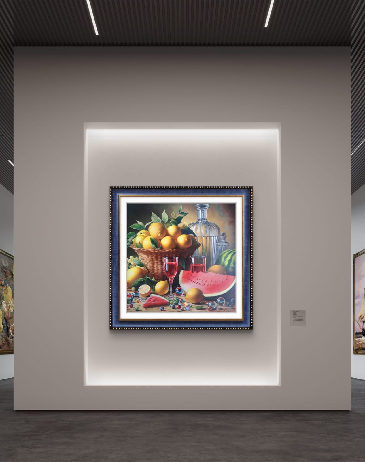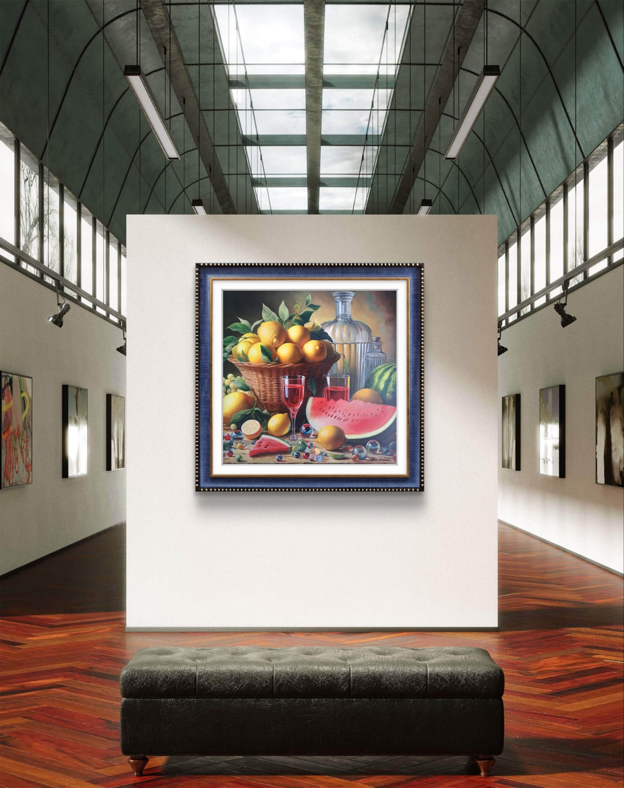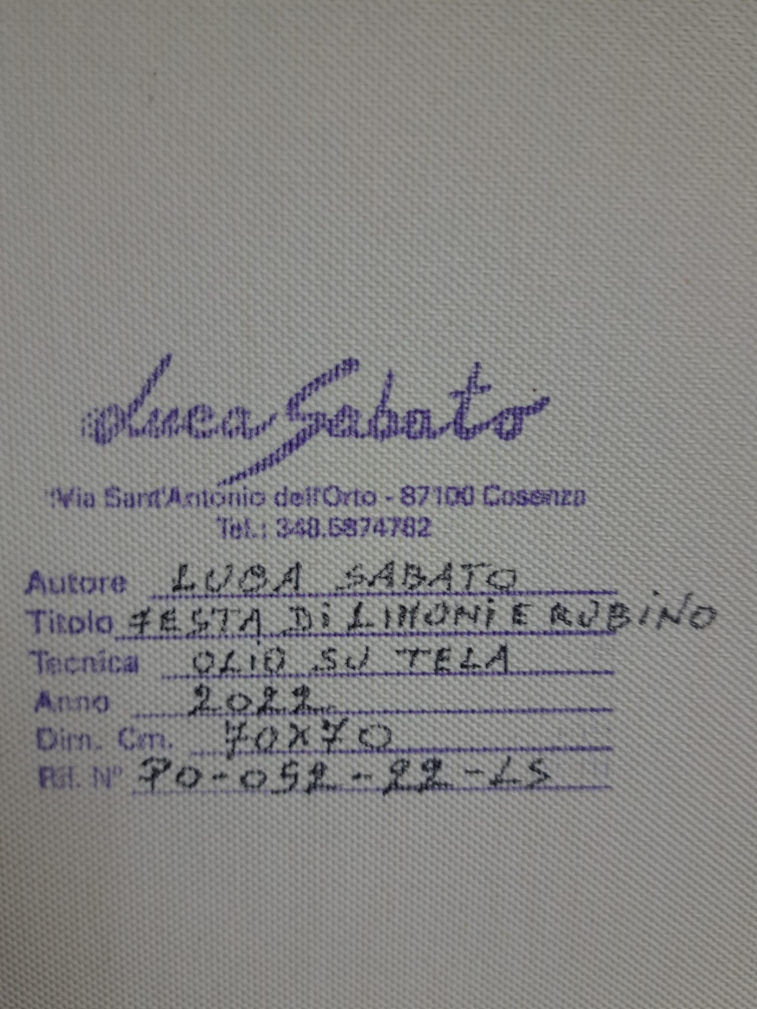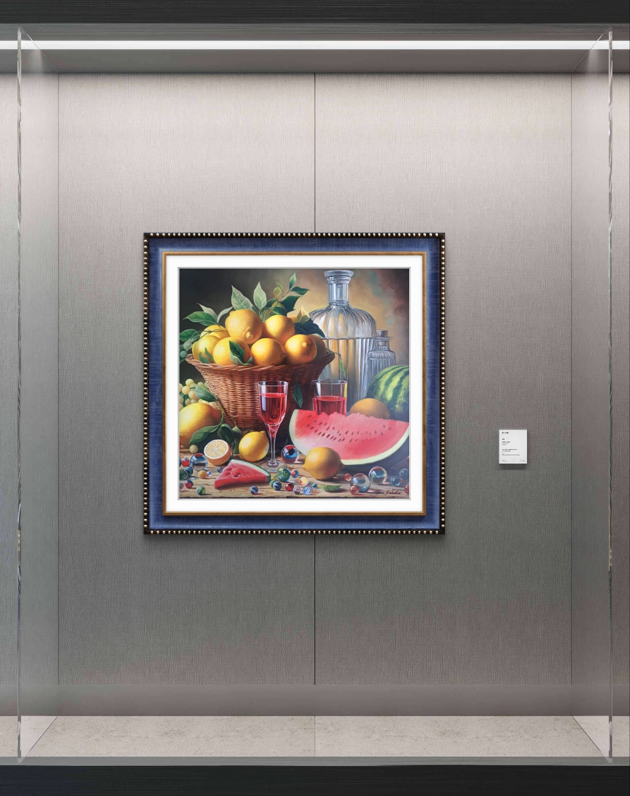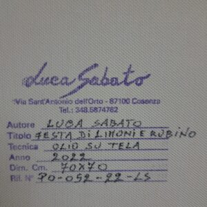Attraverso la mia tecnica, ho voluto esaltare la saturazione dei colori e la materia. “Festa di Limoni e Rubino” è un momento sospeso di gioia e abbondanza, un invito a celebrare i doni semplici e ricchi della terra e a riflettere su come il piacere della convivialità sia reso più brillante dai riflessi del cristallo e della luce.