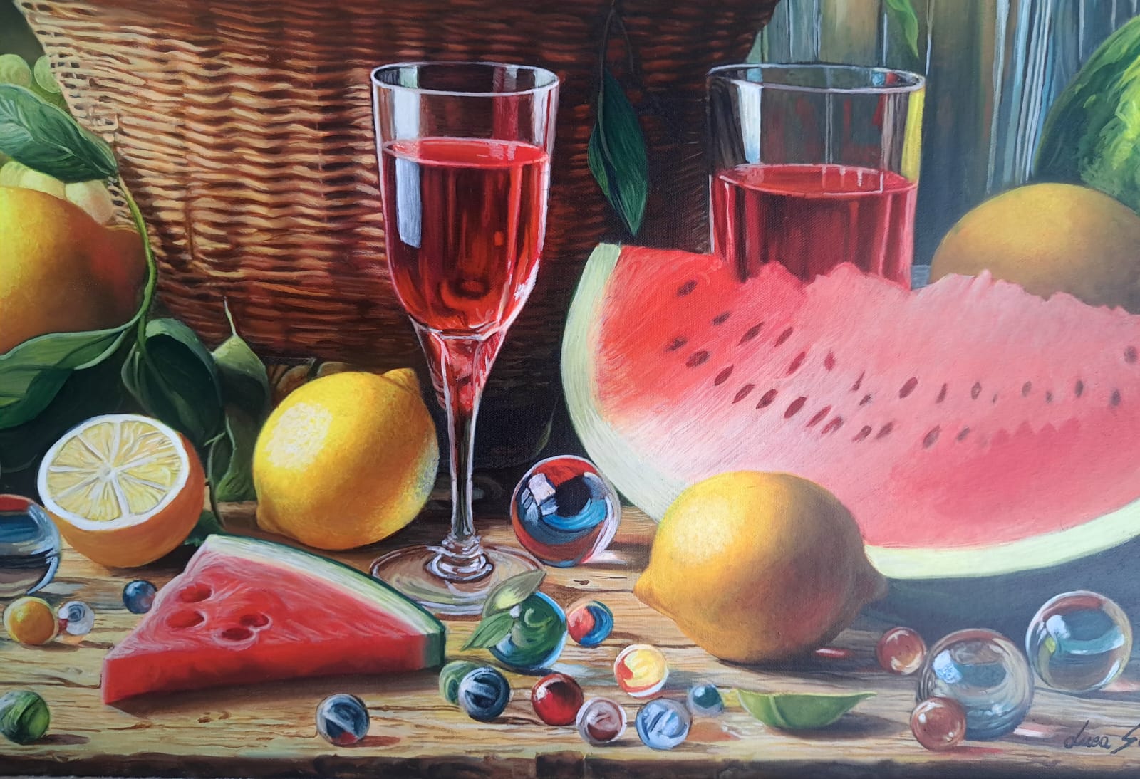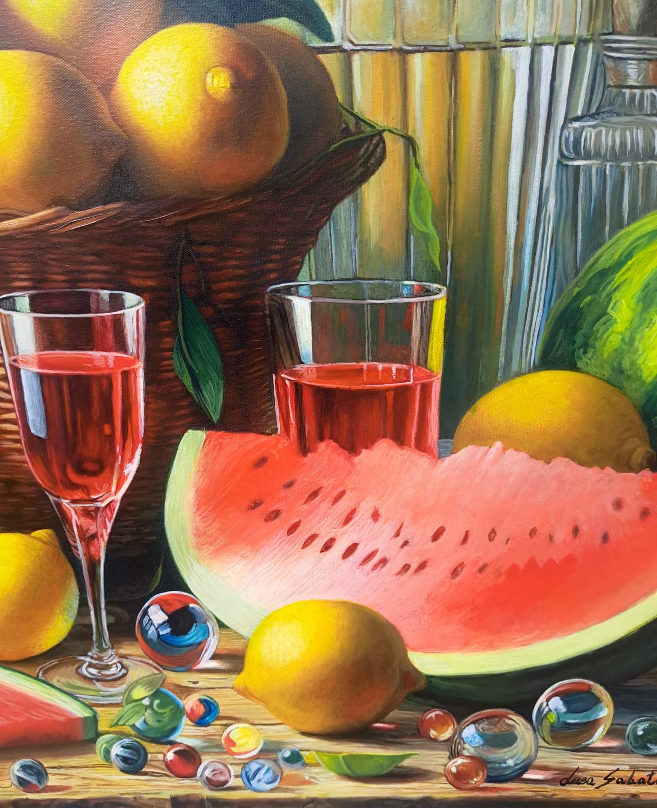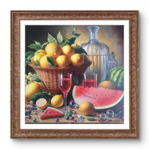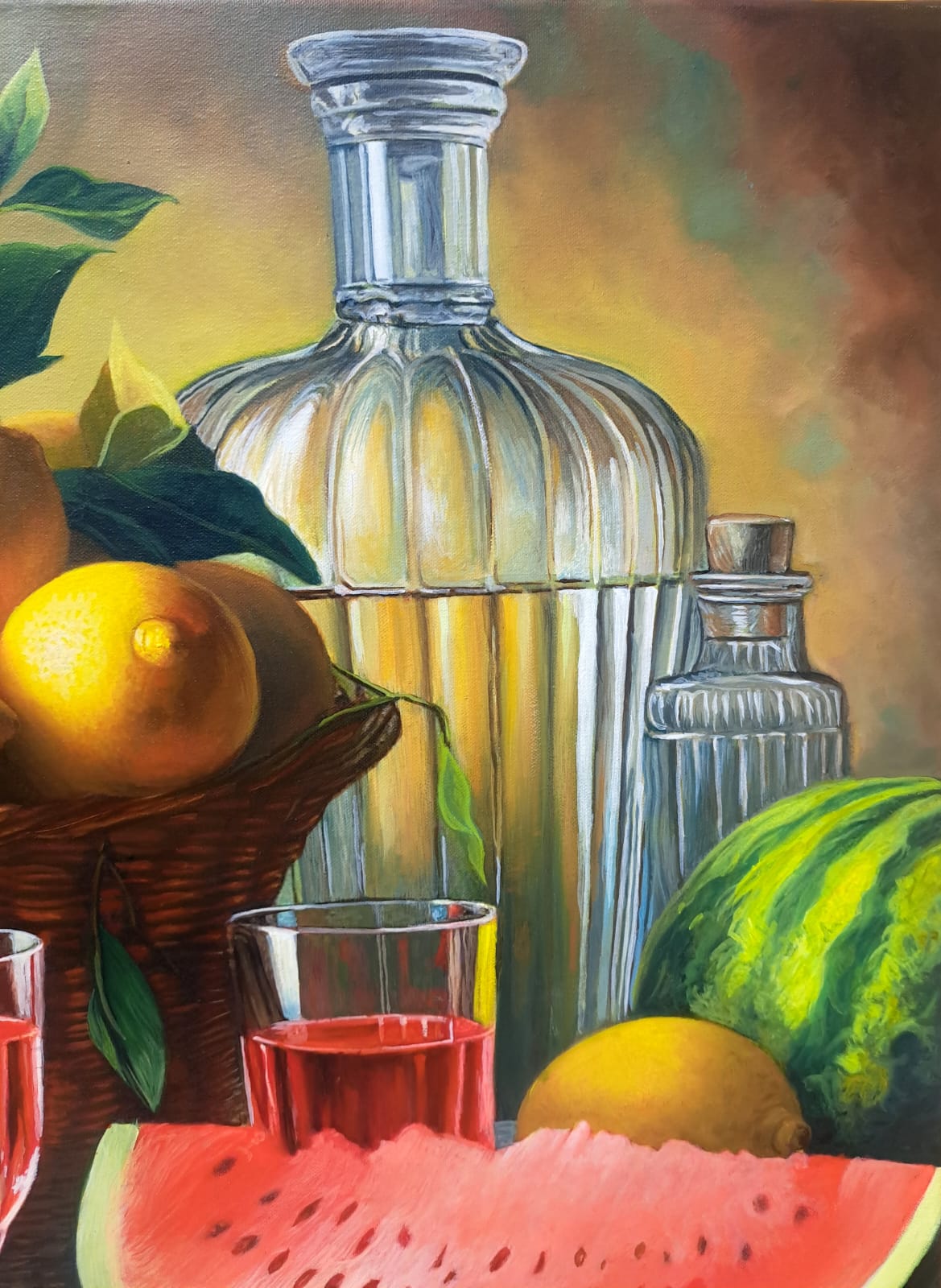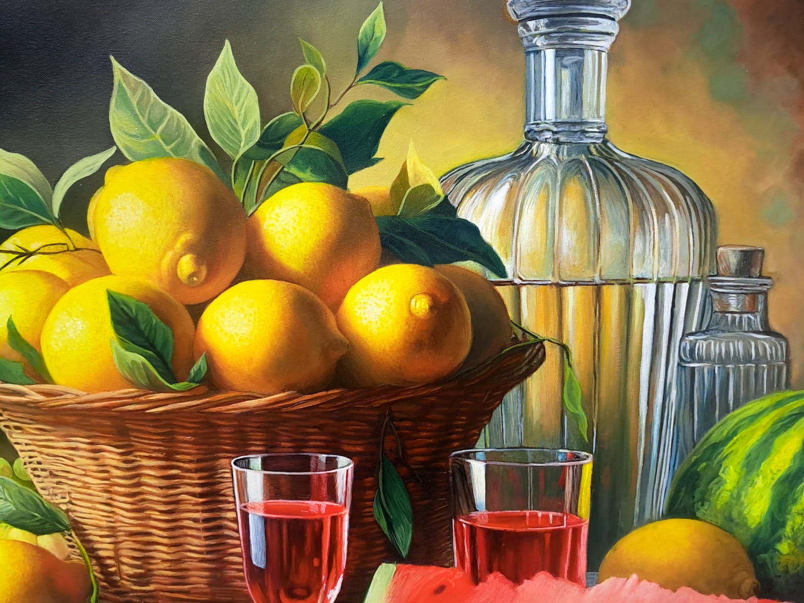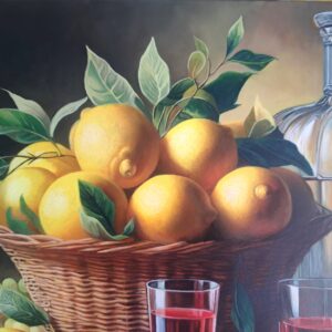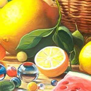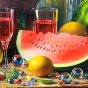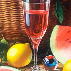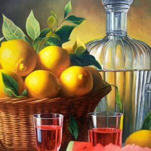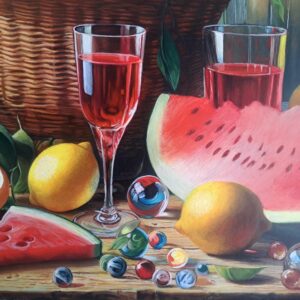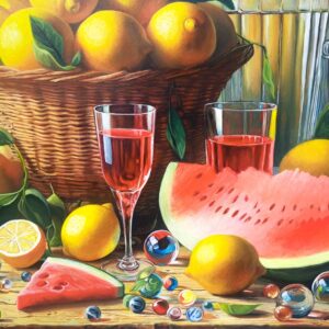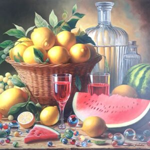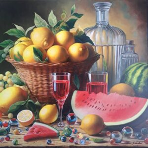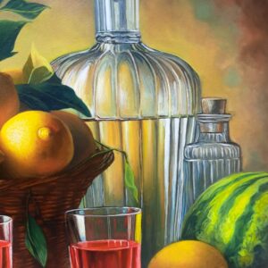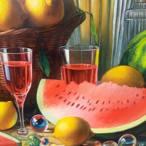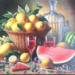 In questa ricca natura morta, ho cercato di catturare la vivacità del raccolto: il cesto è straripante di limoni luminosi, mentre in primo piano domina la polpa carnosa dell’anguria. La tavola è imbandita con eleganza, con due bottiglie di vetro rigato che creano giochi di luce e trasparenza, e un calice di vino il cui colore, un intenso Rubino, richiama il rosso dell’anguria.