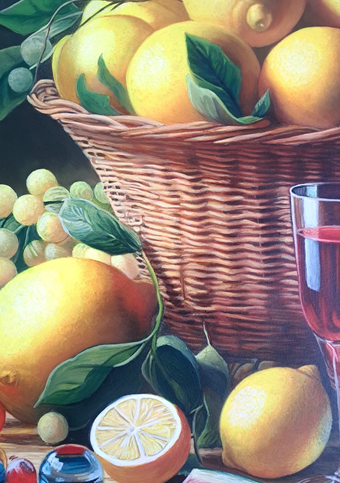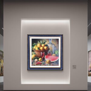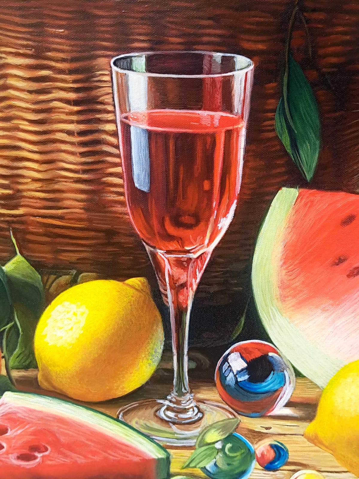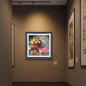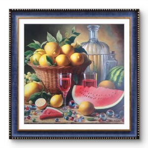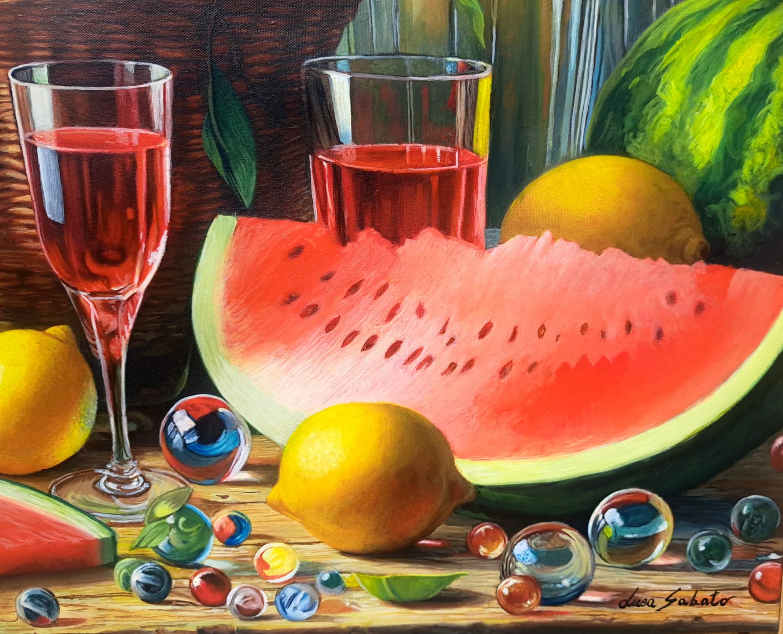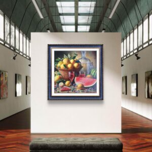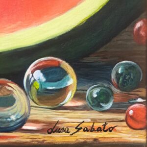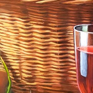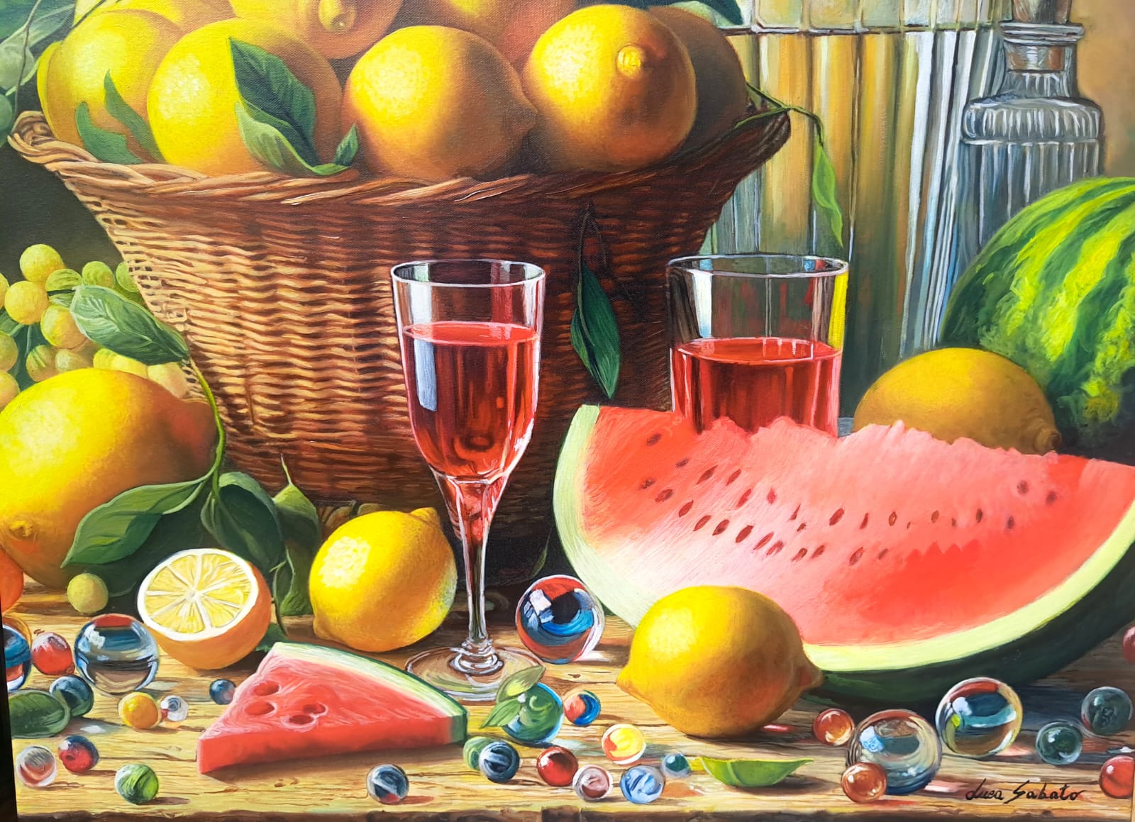 In questa ricca natura morta, ho cercato di catturare la vivacità del raccolto: il cesto è straripante di limoni luminosi, mentre in primo piano domina la polpa carnosa dell’anguria. La tavola è imbandita con eleganza, con due bottiglie di vetro rigato che creano giochi di luce e trasparenza, e un calice di vino il cui colore, un intenso Rubino, richiama il rosso dell’anguria.