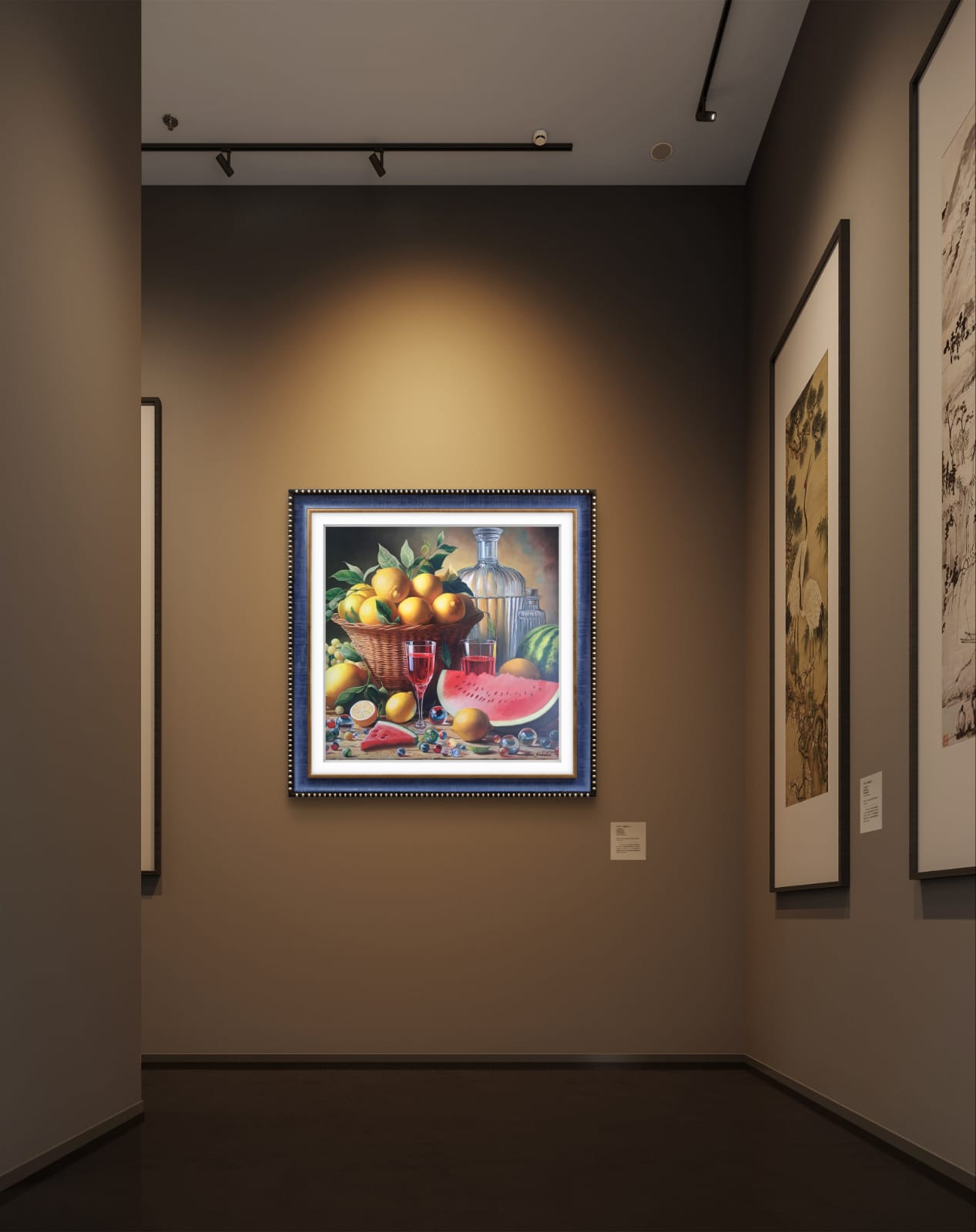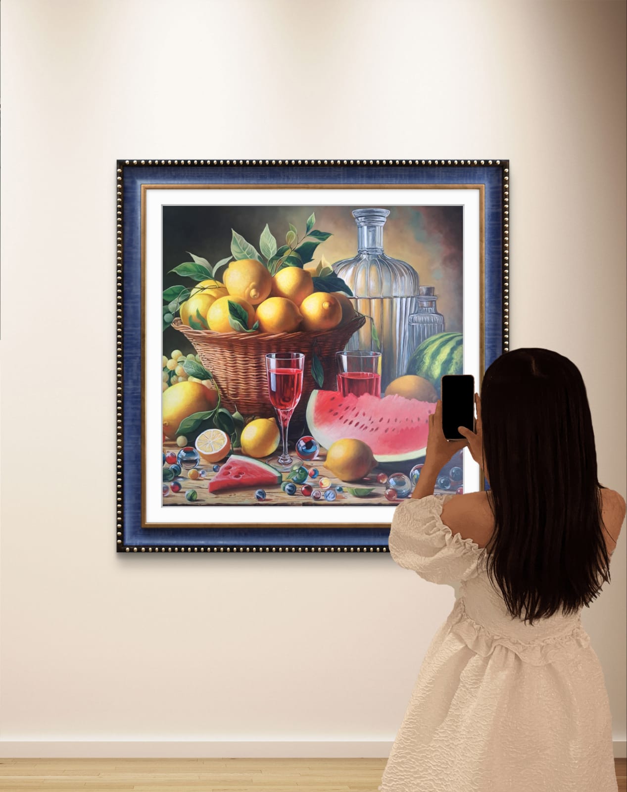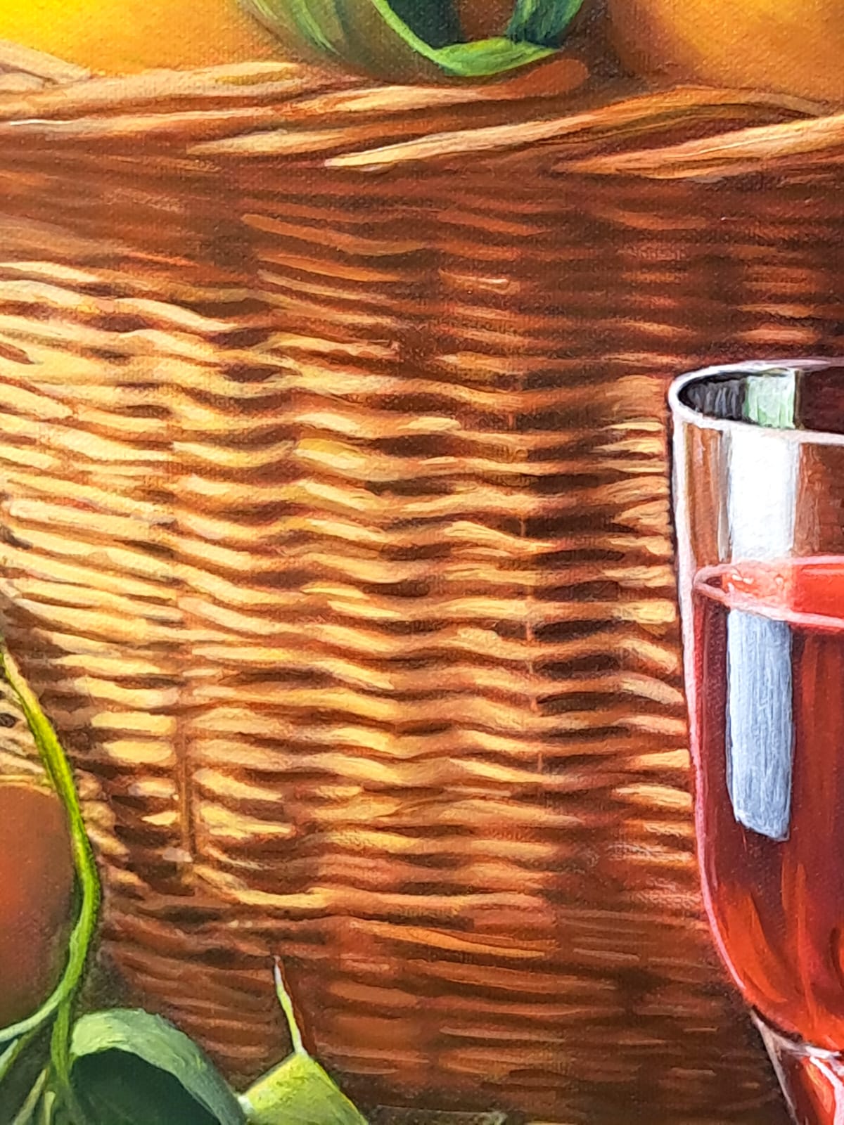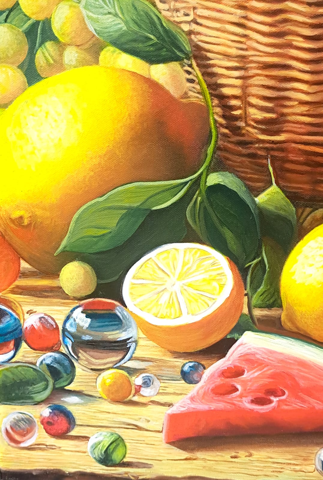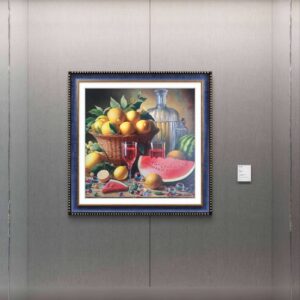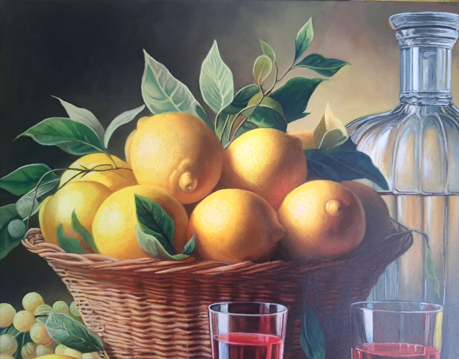 In questa ricca natura morta, ho cercato di catturare la vivacità del raccolto: il cesto è straripante di limoni luminosi, mentre in primo piano domina la polpa carnosa dell’anguria. La tavola è imbandita con eleganza, con due bottiglie di vetro rigato che creano giochi di luce e trasparenza, e un calice di vino il cui colore, un intenso Rubino, richiama il rosso dell’anguria.