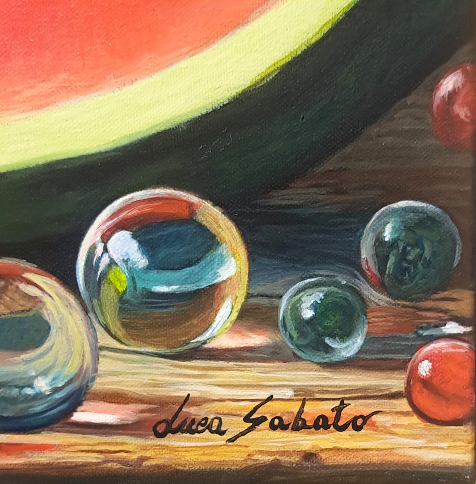 Ho voluto infondere in questa scena un elemento ludico e misterioso, dato dalla presenza delle biglie colorate sparse sul legno. Questi piccoli elementi di vetro riflettono e distorcono la realtà, introducendo un sottile tema sull’illusione e la fragilità della bellezza.