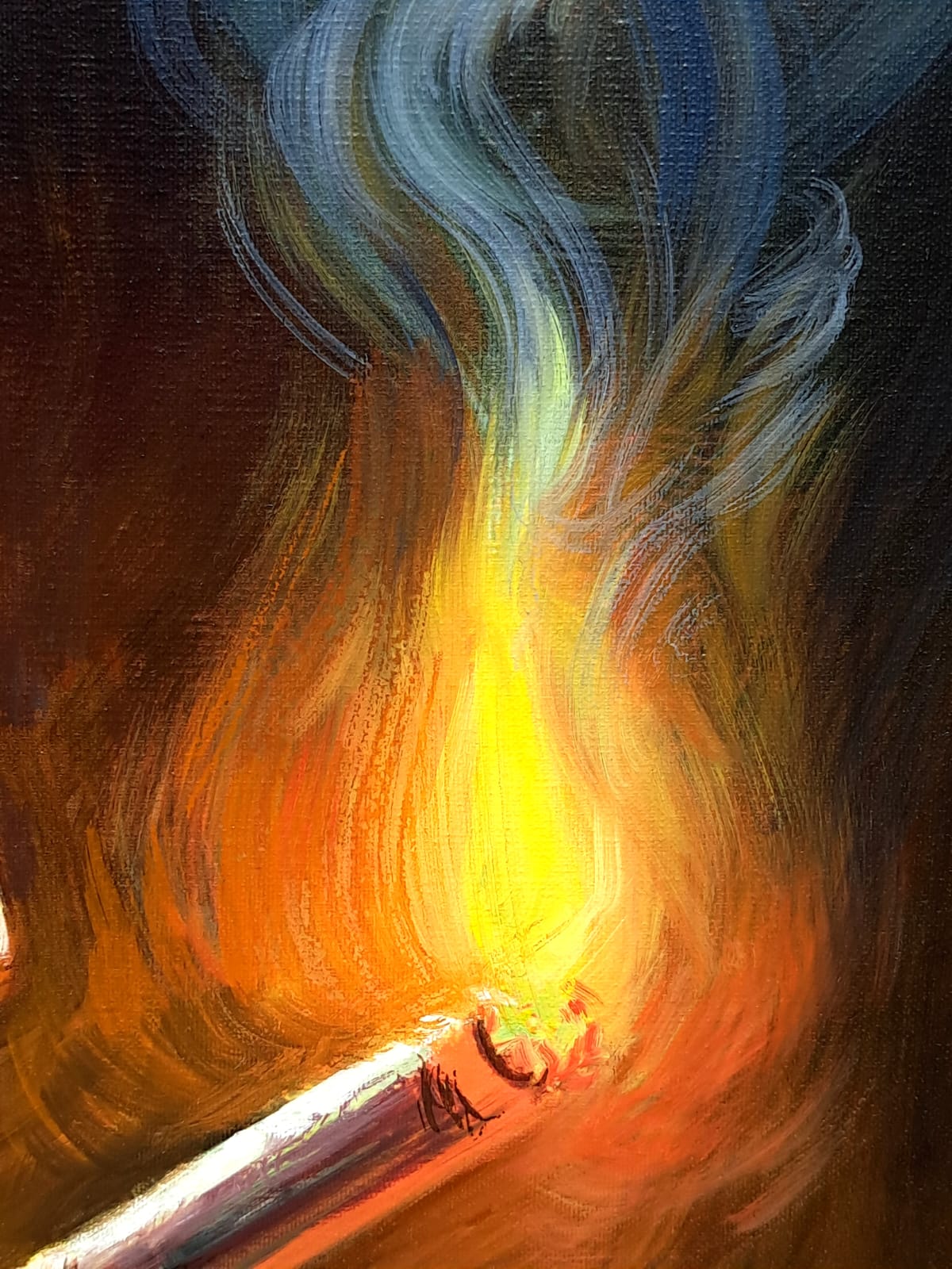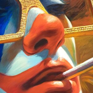 Ho voluto creare un corto circuito visivo: la voluta saturazione dei colori e il gesto di fumare, con la sigaretta quasi infuocata, rafforzano il senso di una realtà bruciante. Il fumo che si disperde è la metafora della verità che si dissolve dietro la “maschera” del lusso, suggerendo che lo status è effimero quanto il fumo.