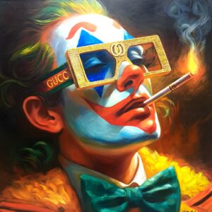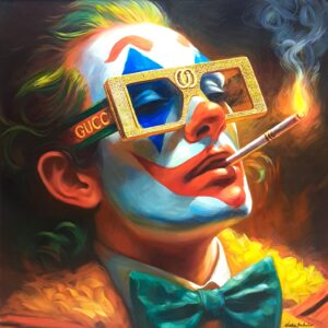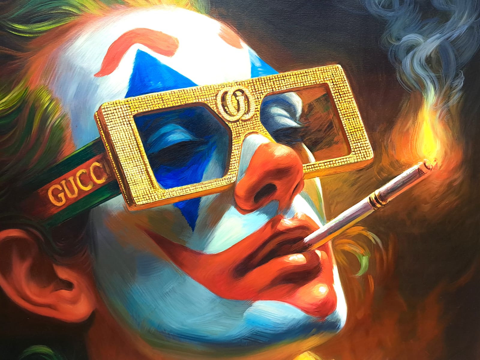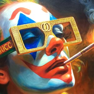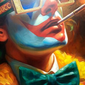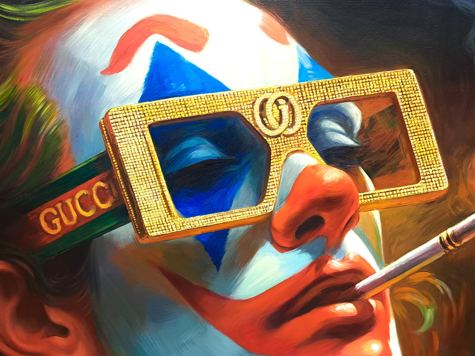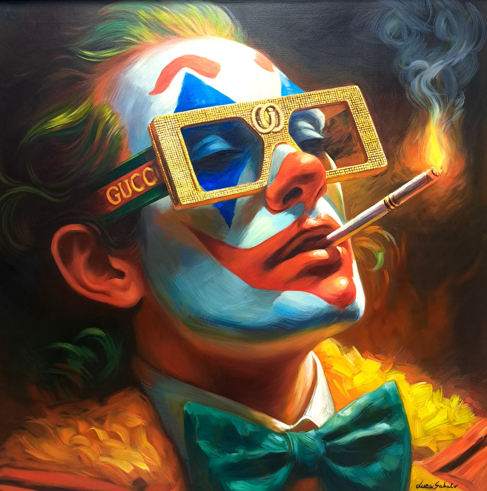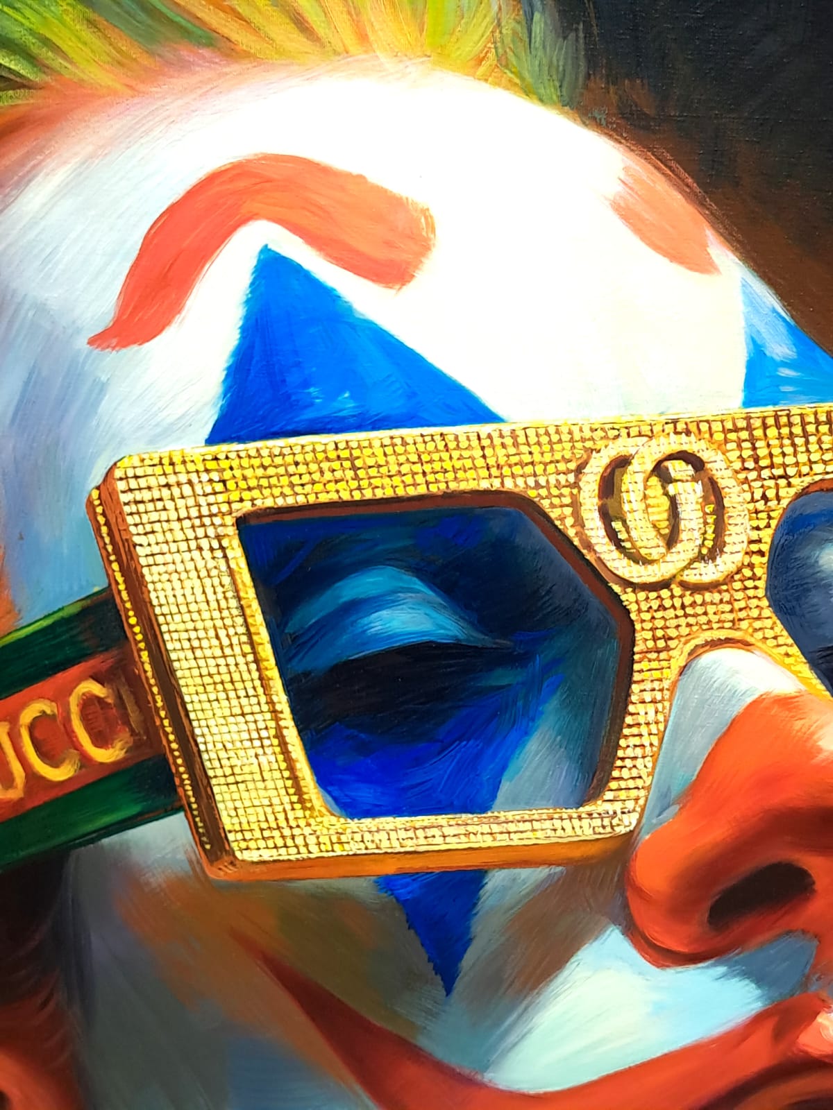 In questa tela, ho scelto di reinventare l’iconografia del Clown, figura che incarna il dramma e la finzione emotiva. Il trucco iconico sul volto, che dovrebbe rivelare un’emozione pura, viene immediatamente alterato e amplificato da un paio di grandi occhiali da sole Gucci dorati e squadrati. Questi accessori di lusso non sono semplici abbellimenti, ma diventano il vero e proprio “Filtro” attraverso cui il soggetto vede il mondo, e attraverso cui il mondo percepisce lui.