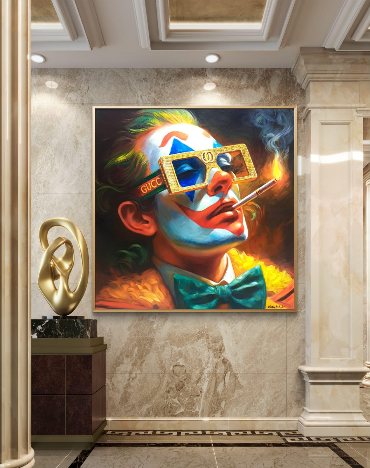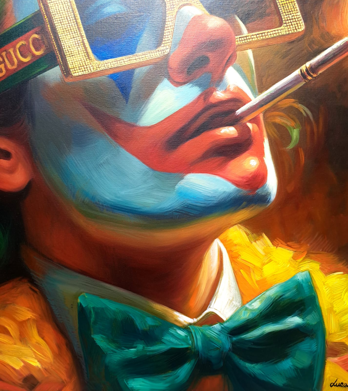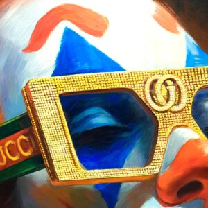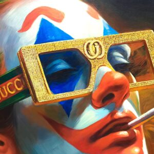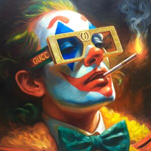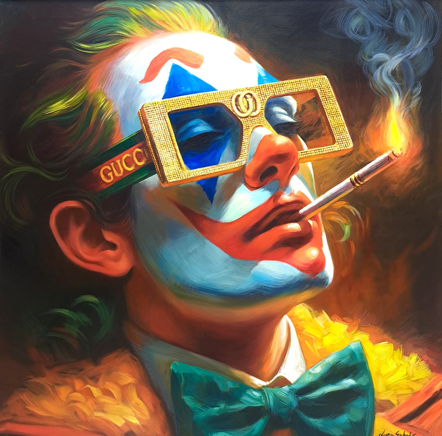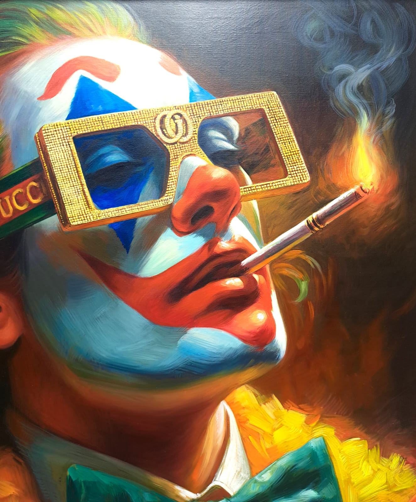 In questa tela, ho scelto di reinventare l’iconografia del Clown, figura che incarna il dramma e la finzione emotiva. Il trucco iconico sul volto, che dovrebbe rivelare un’emozione pura, viene immediatamente alterato e amplificato da un paio di grandi occhiali da sole Gucci dorati e squadrati. Questi accessori di lusso non sono semplici abbellimenti, ma diventano il vero e proprio “Filtro” attraverso cui il soggetto vede il mondo, e attraverso cui il mondo percepisce lui.