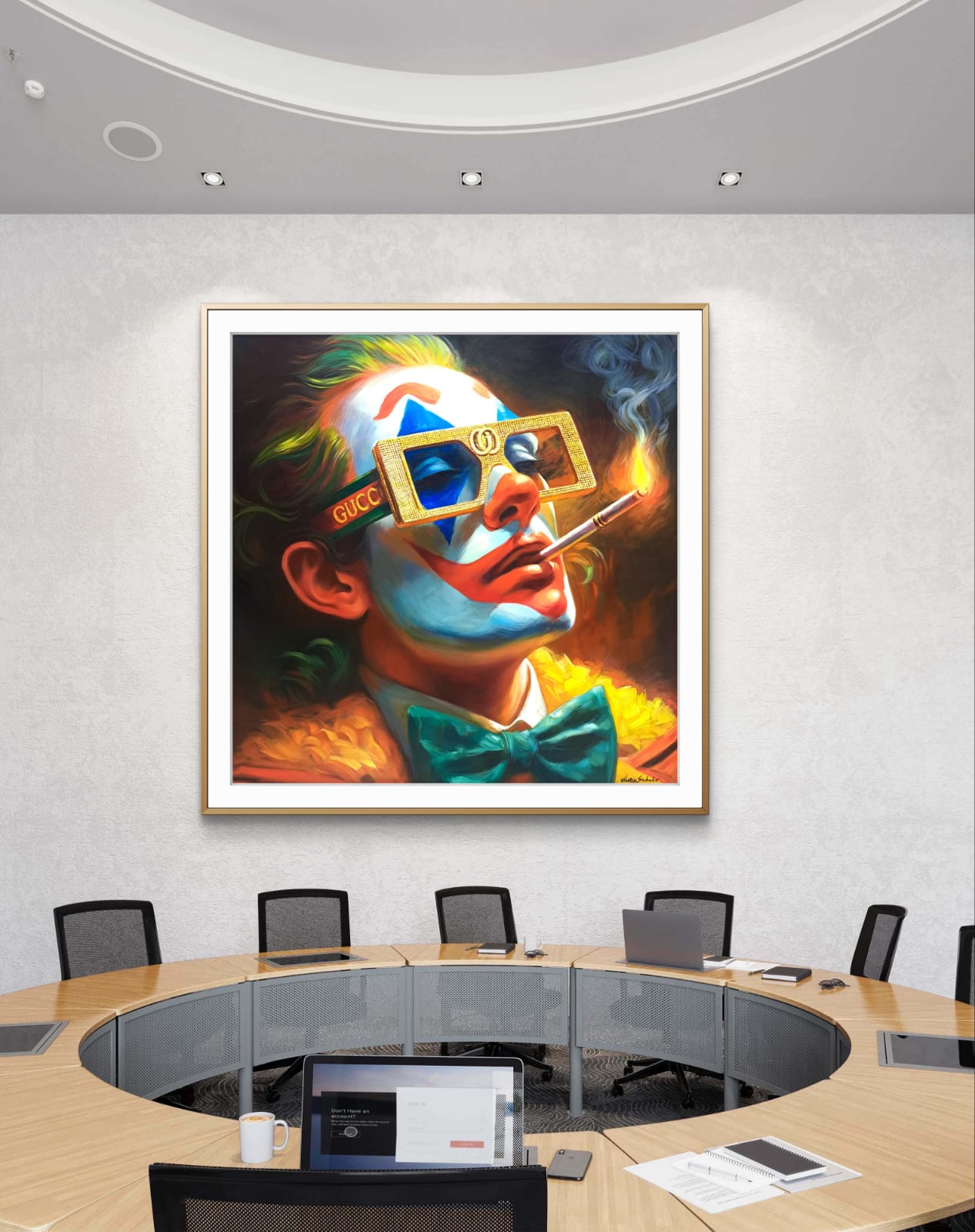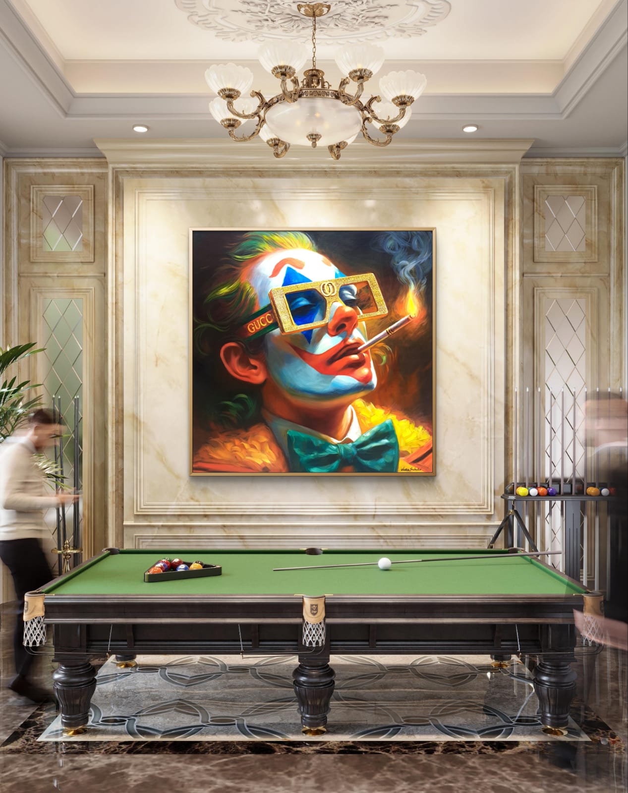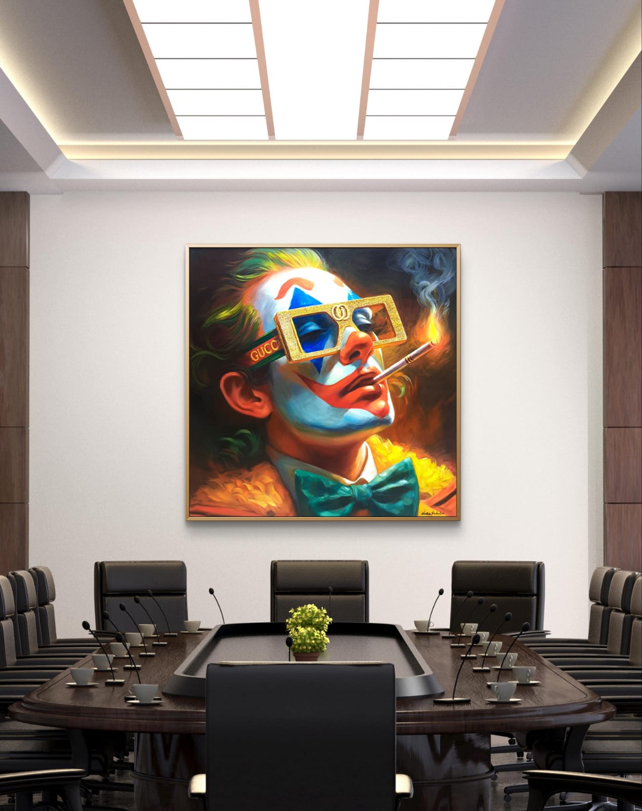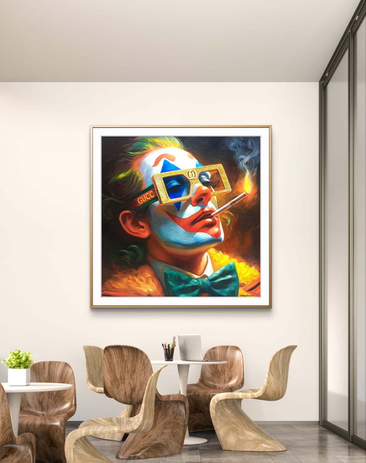 In questa tela, ho scelto di reinventare l’iconografia del Clown, figura che incarna il dramma e la finzione emotiva. Il trucco iconico sul volto, che dovrebbe rivelare un’emozione pura, viene immediatamente alterato e amplificato da un paio di grandi occhiali da sole Gucci dorati e squadrati. Questi accessori di lusso non sono semplici abbellimenti, ma diventano il vero e proprio “Filtro” attraverso cui il soggetto vede il mondo, e attraverso cui il mondo percepisce lui.