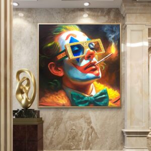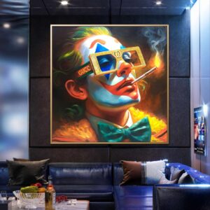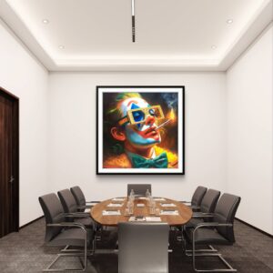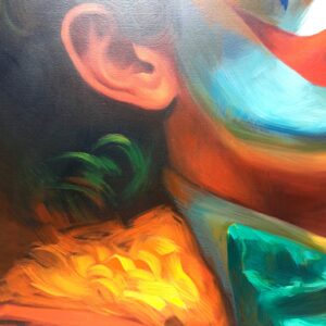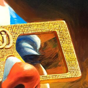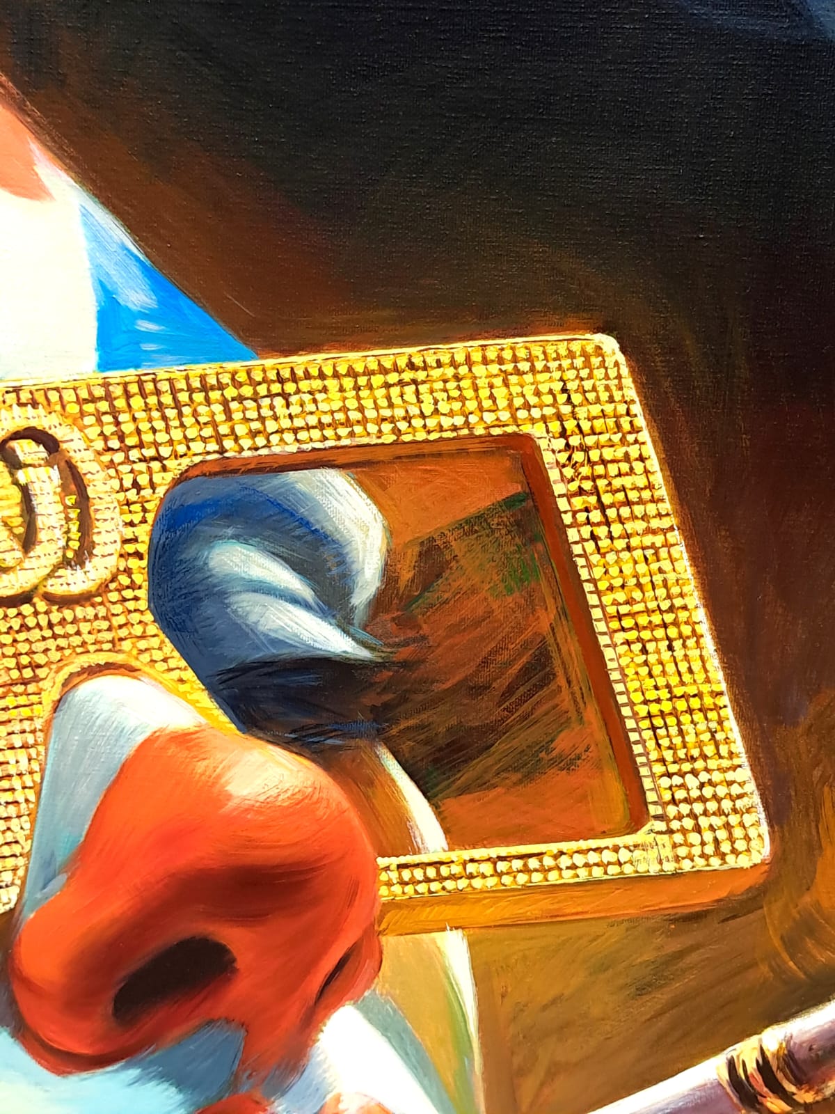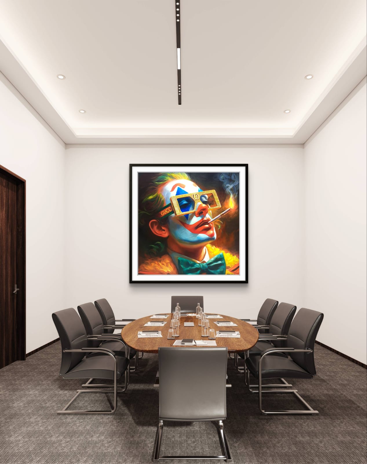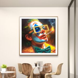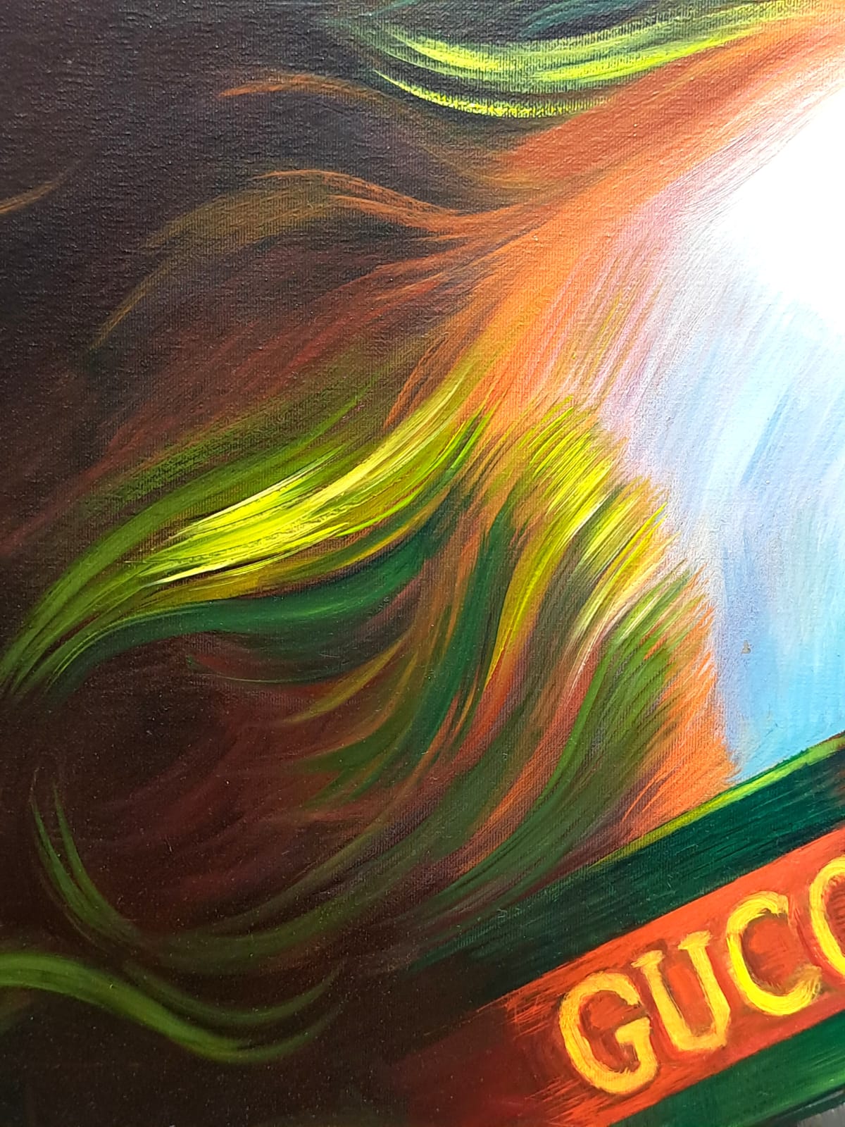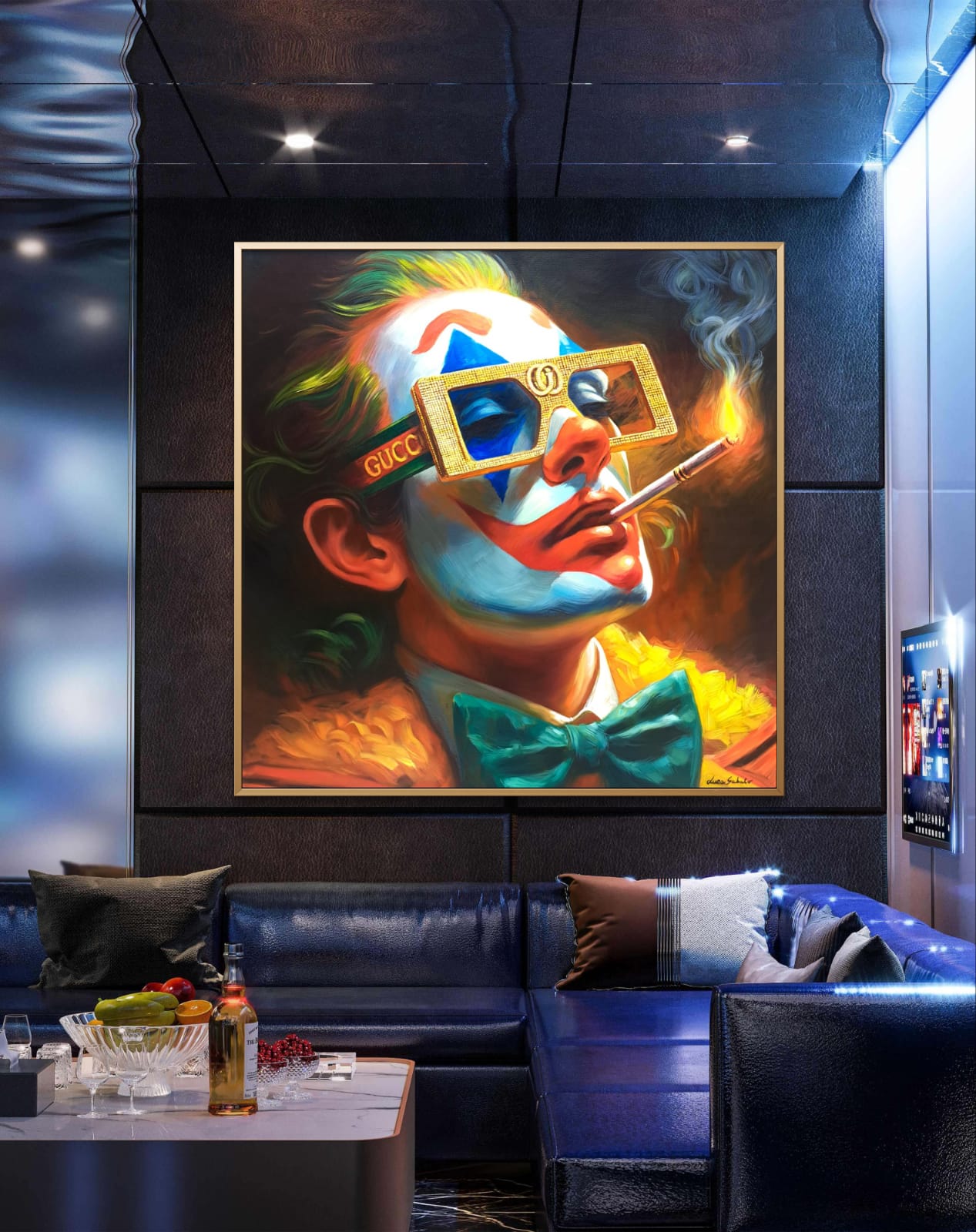 In questa tela, ho scelto di reinventare l’iconografia del Clown, figura che incarna il dramma e la finzione emotiva. Il trucco iconico sul volto, che dovrebbe rivelare un’emozione pura, viene immediatamente alterato e amplificato da un paio di grandi occhiali da sole Gucci dorati e squadrati. Questi accessori di lusso non sono semplici abbellimenti, ma diventano il vero e proprio “Filtro” attraverso cui il soggetto vede il mondo, e attraverso cui il mondo percepisce lui.