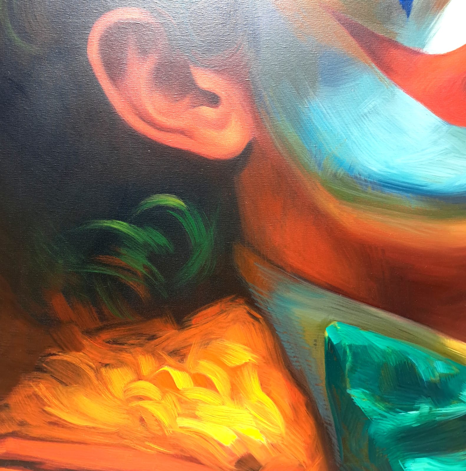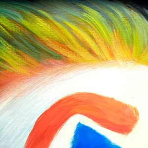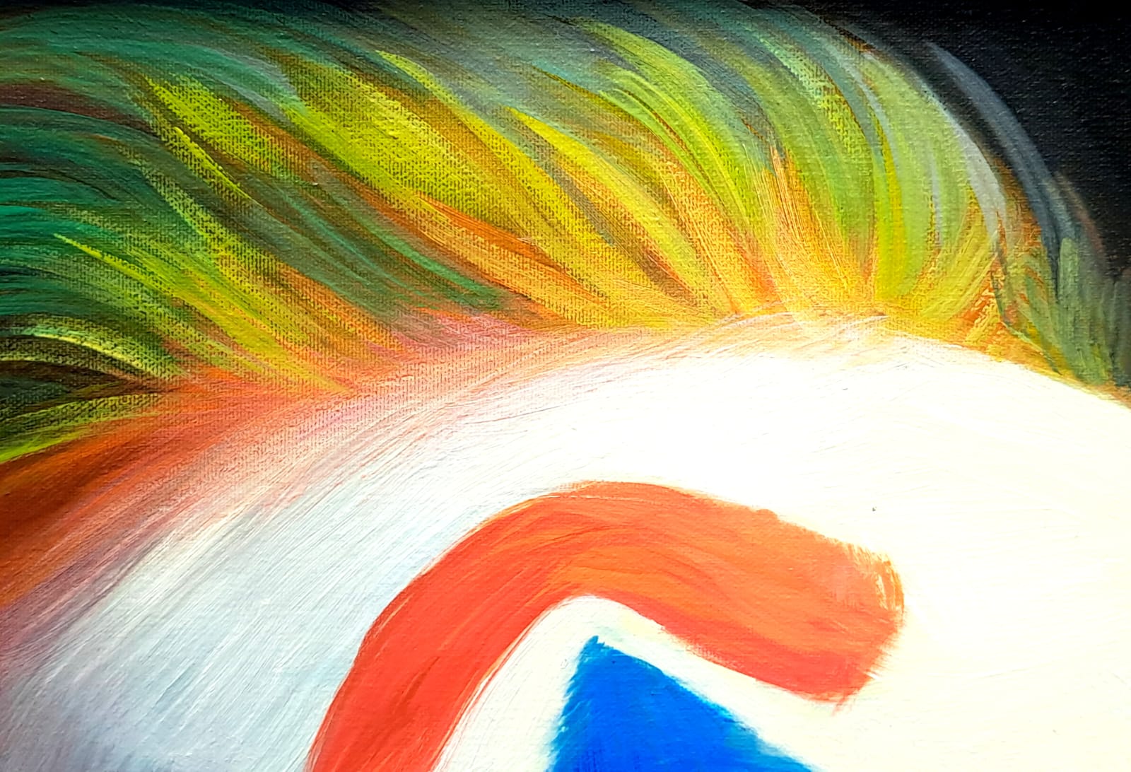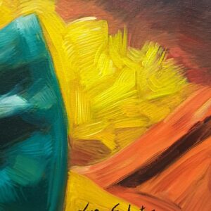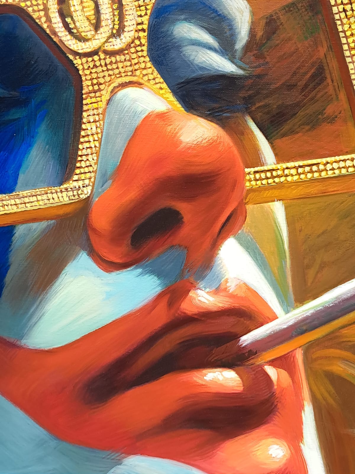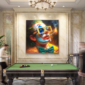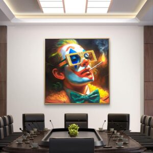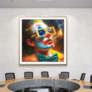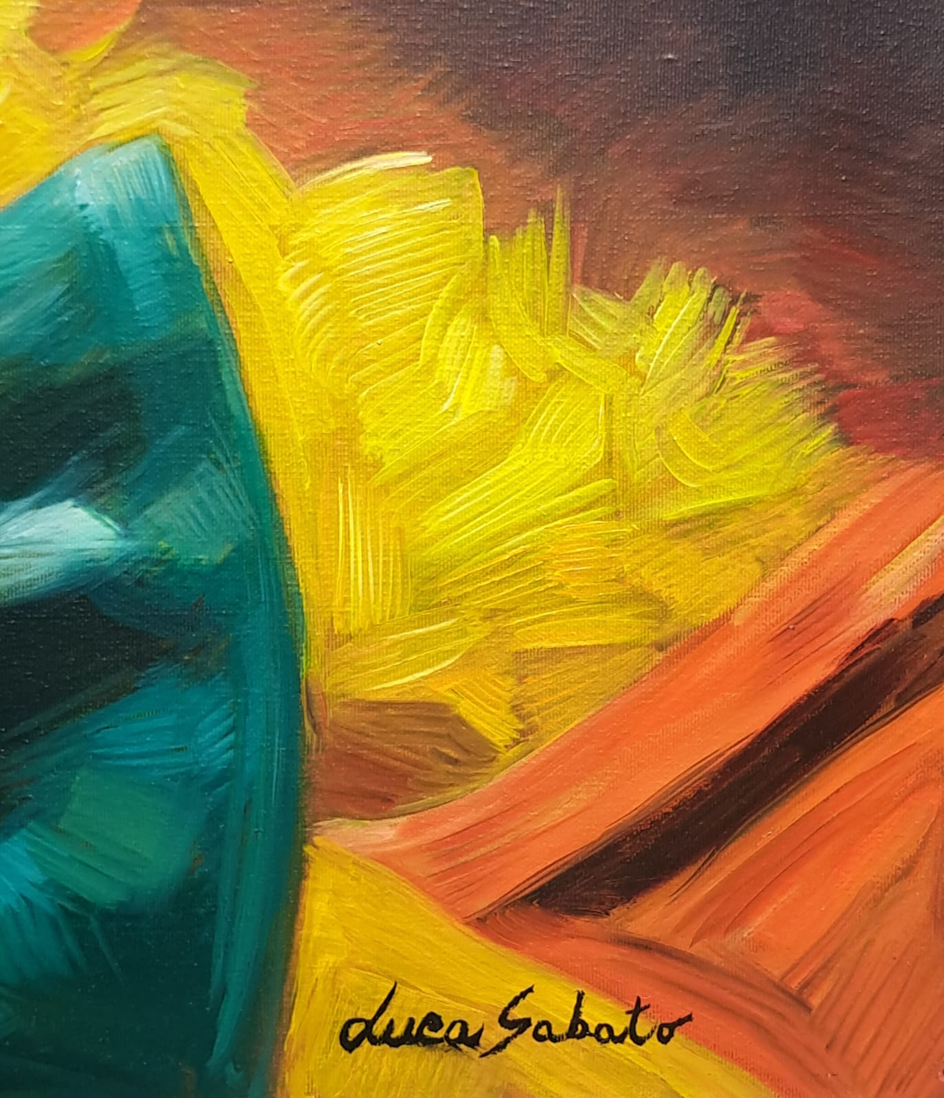 In questa tela, ho scelto di reinventare l’iconografia del Clown, figura che incarna il dramma e la finzione emotiva. Il trucco iconico sul volto, che dovrebbe rivelare un’emozione pura, viene immediatamente alterato e amplificato da un paio di grandi occhiali da sole Gucci dorati e squadrati. Questi accessori di lusso non sono semplici abbellimenti, ma diventano il vero e proprio “Filtro” attraverso cui il soggetto vede il mondo, e attraverso cui il mondo percepisce lui.