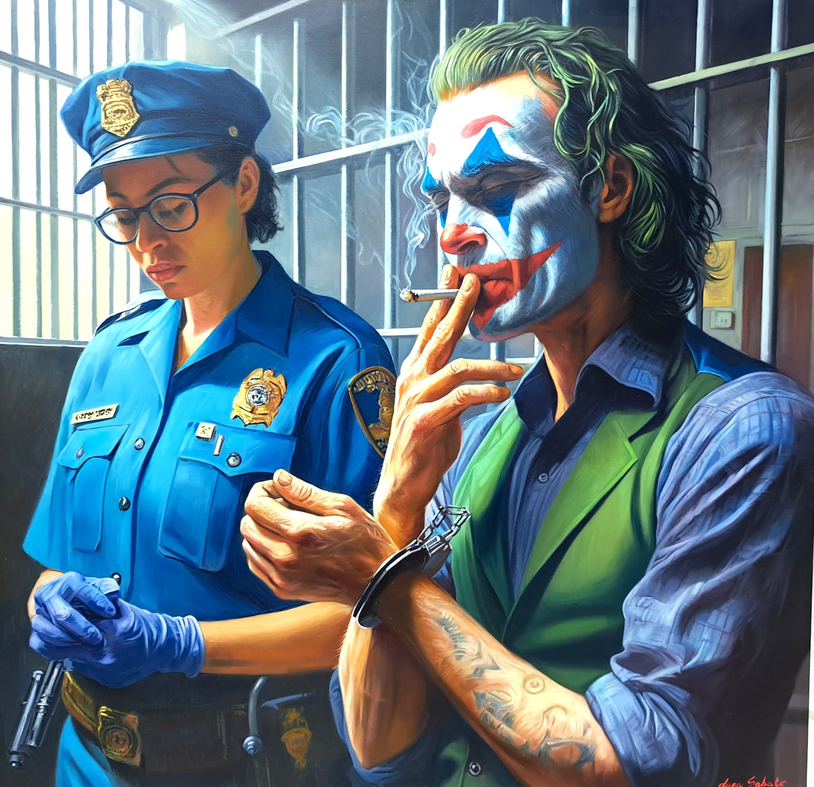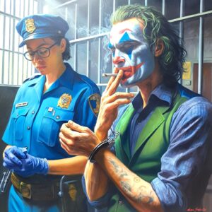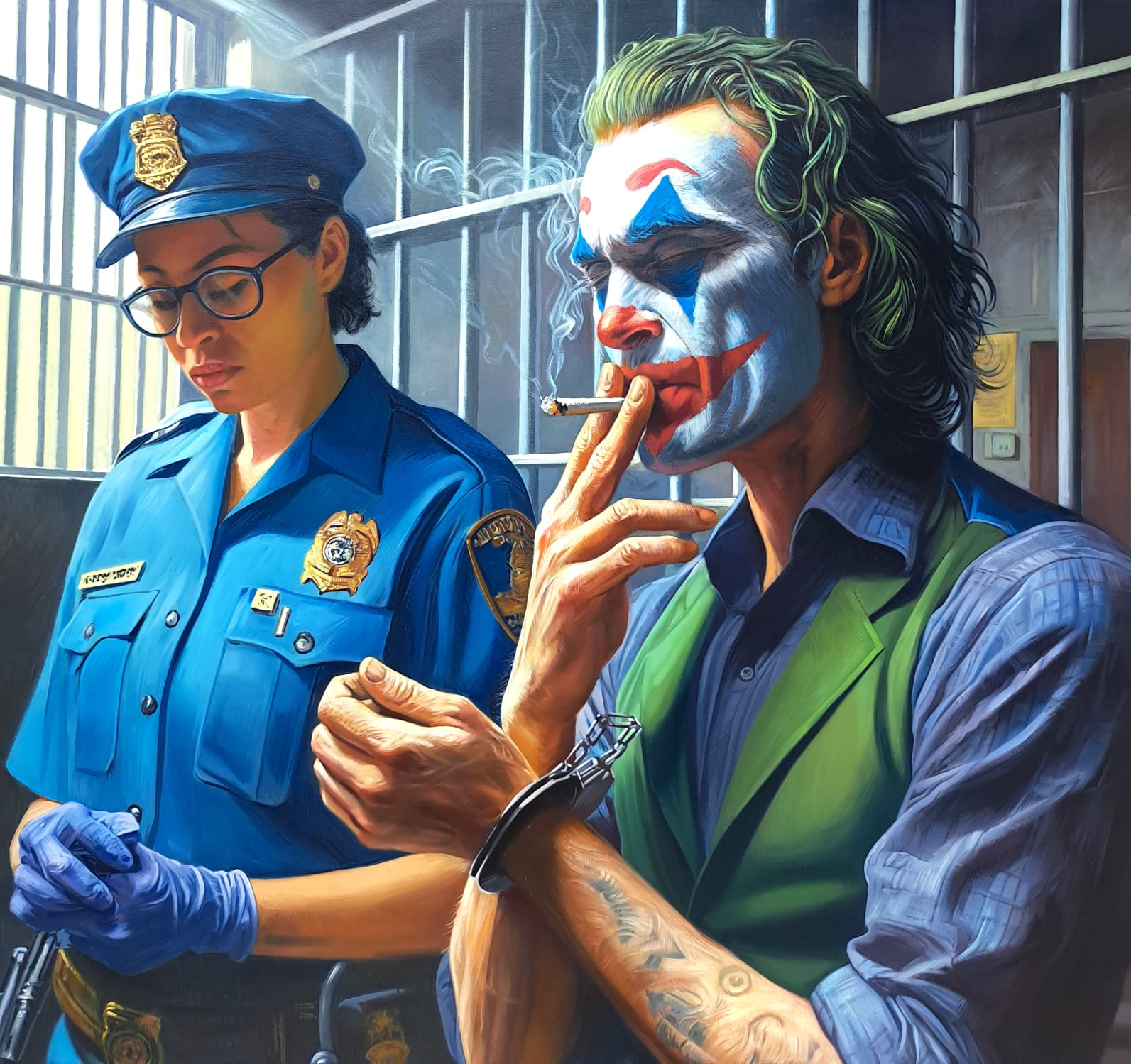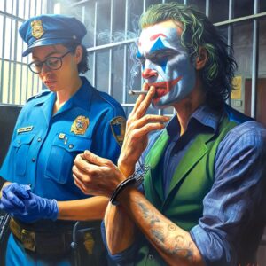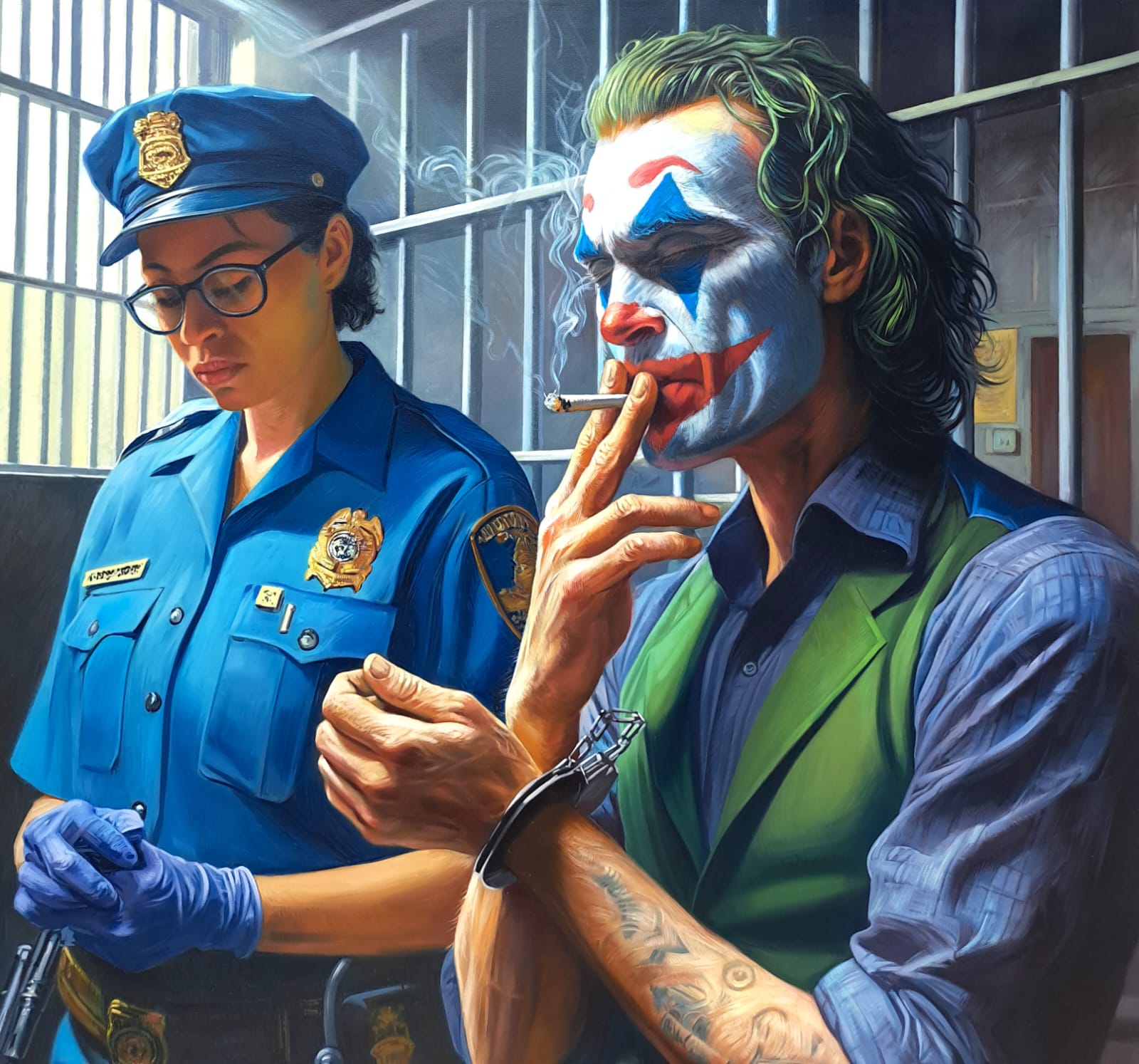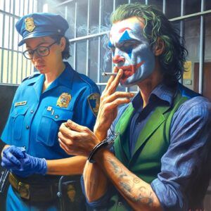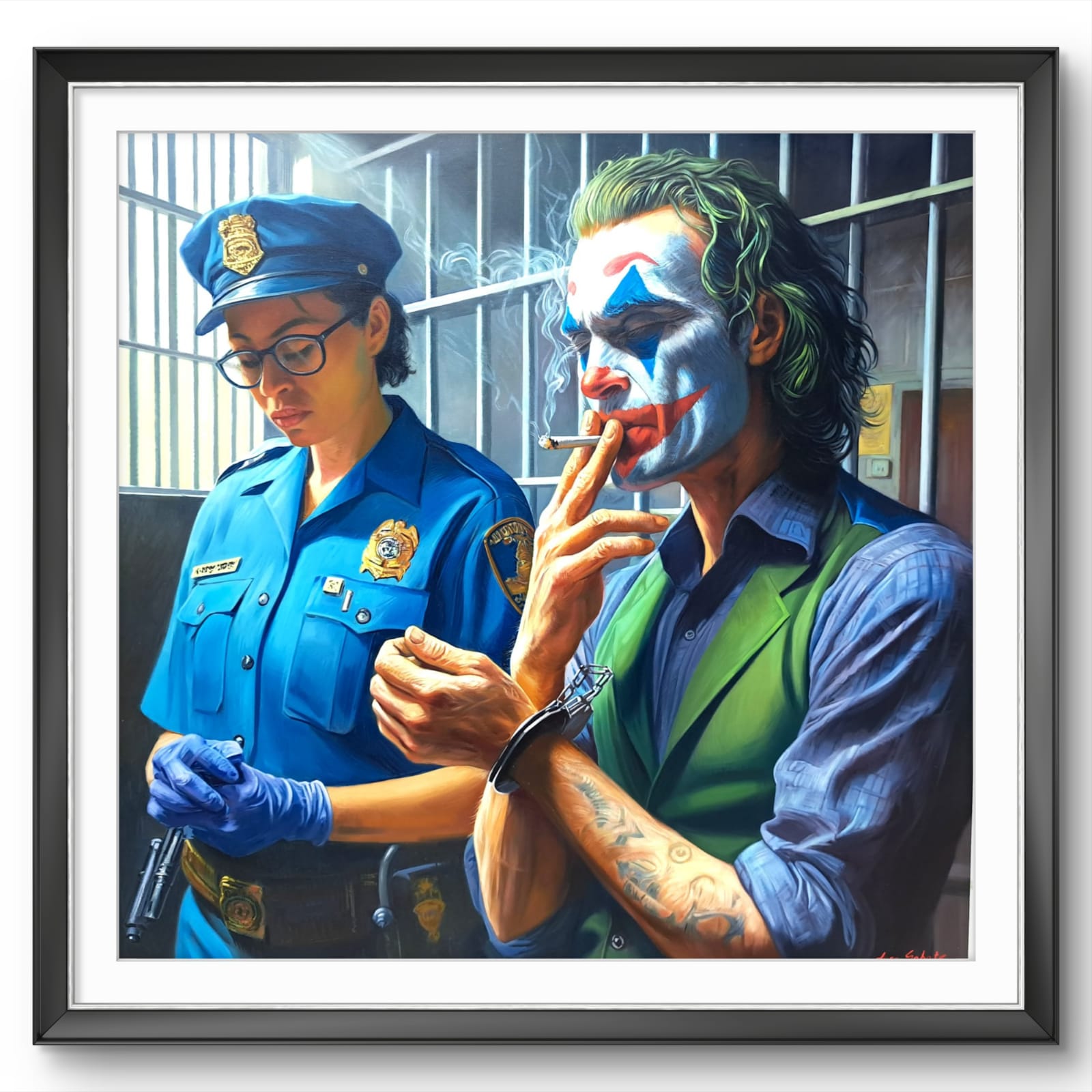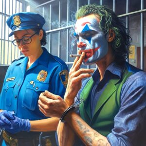 ​Il Joker è colto nel suo rituale: fuma, lasciando che il fumo si frapponga tra lui e l’agente come una cortina beffarda. Nonostante le manette, la sua postura suggerisce una libertà interiore che l’Ordine non può incatenare.