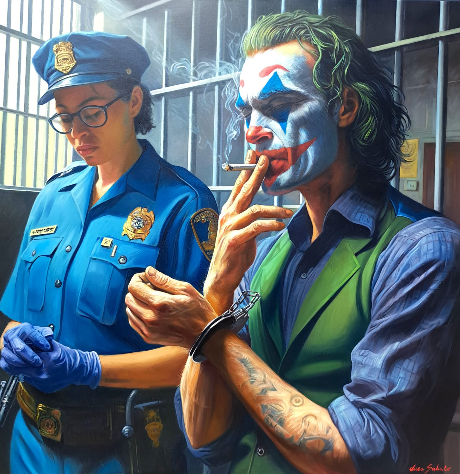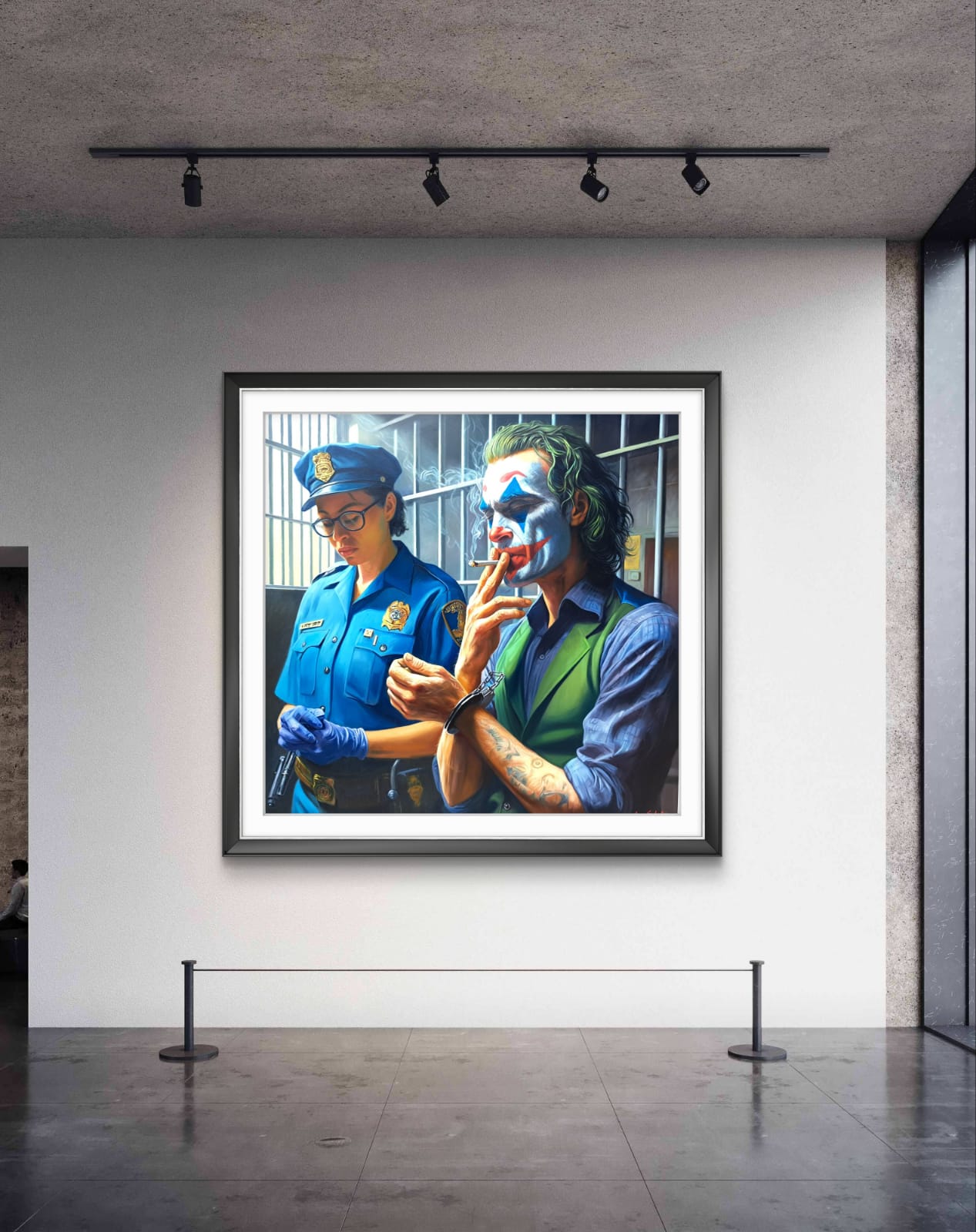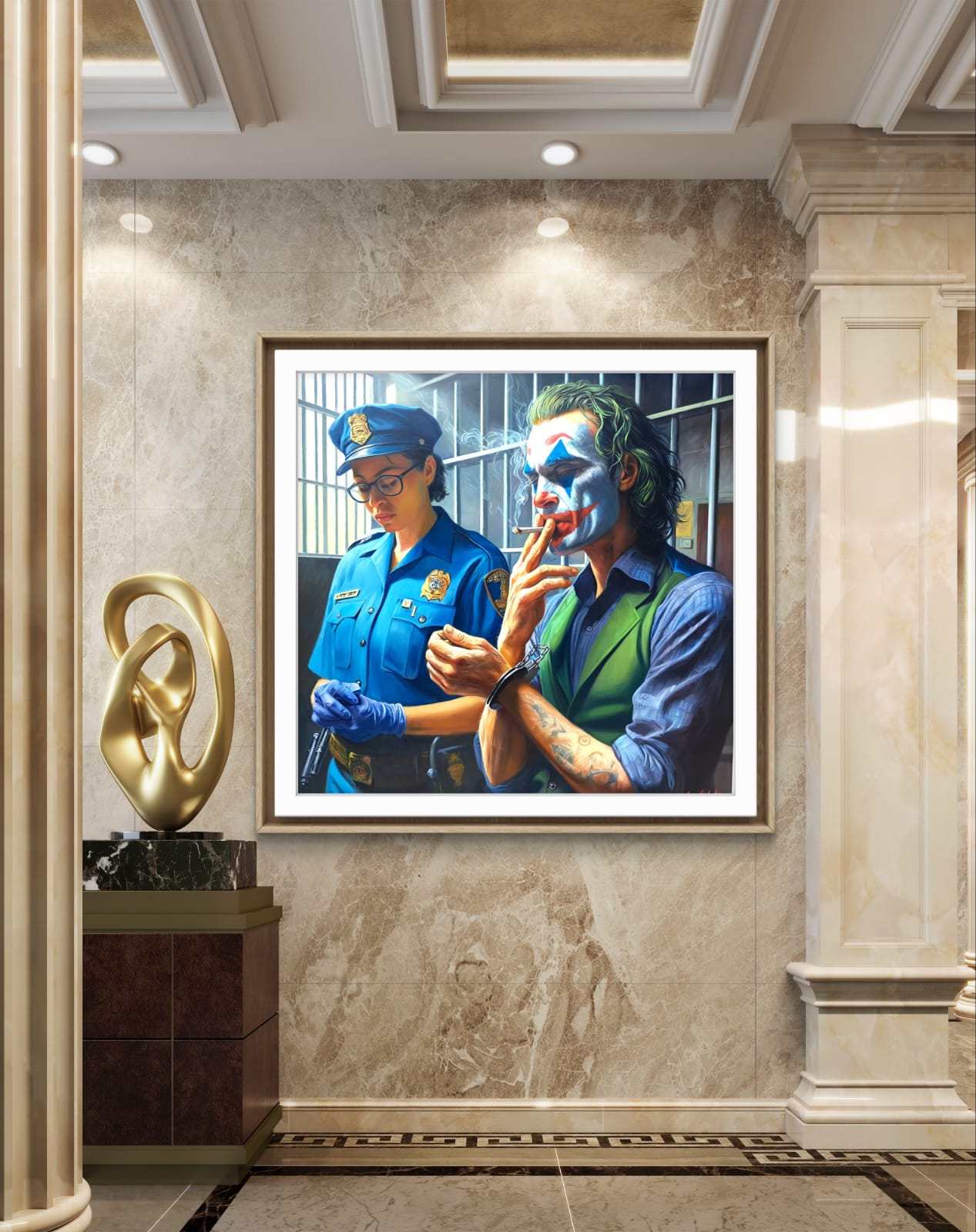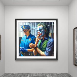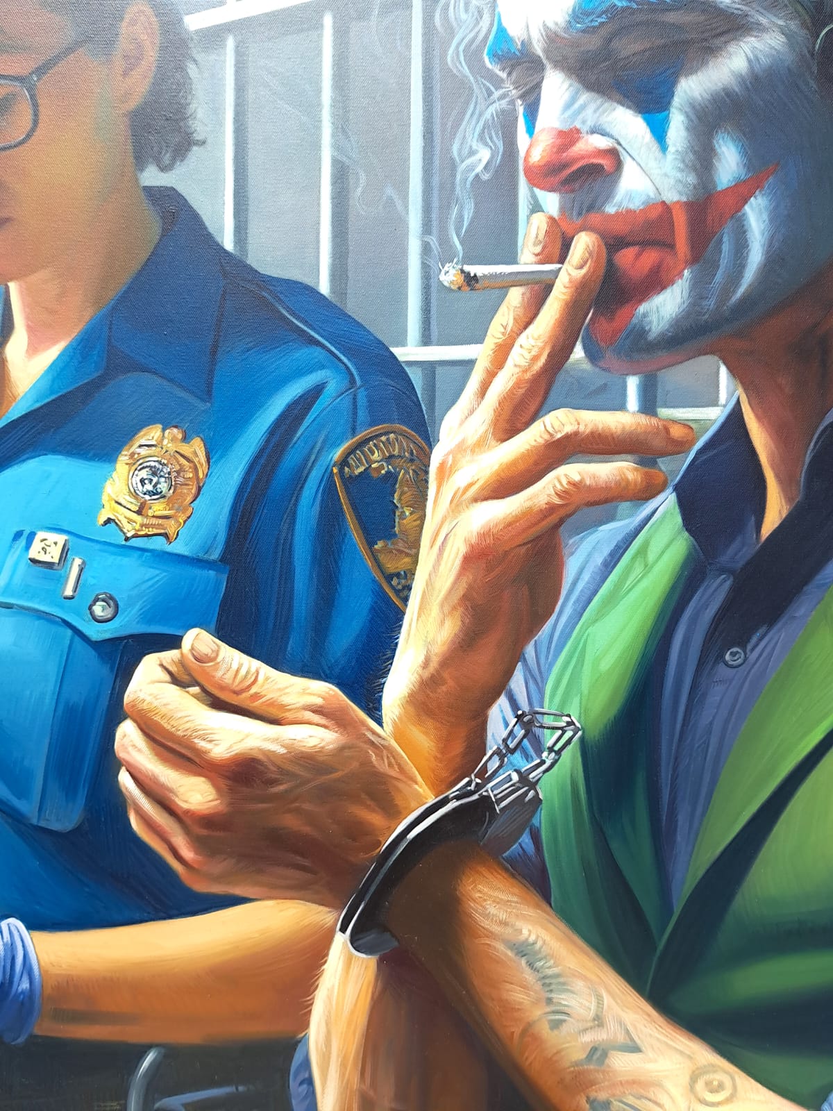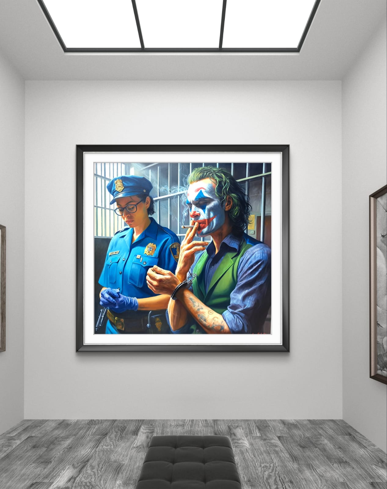 ​Il Joker è colto nel suo rituale: fuma, lasciando che il fumo si frapponga tra lui e l’agente come una cortina beffarda. Nonostante le manette, la sua postura suggerisce una libertà interiore che l’Ordine non può incatenare.