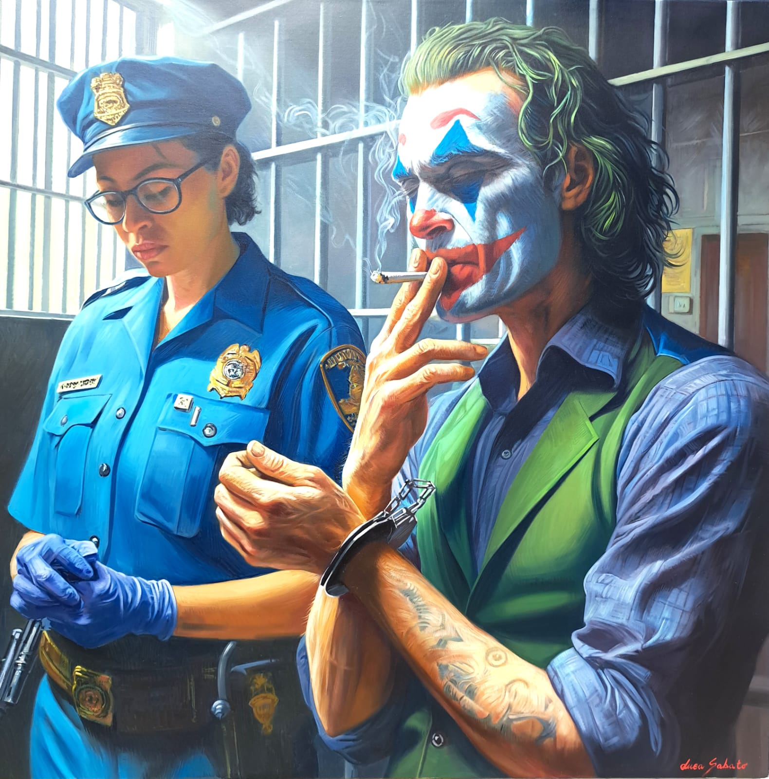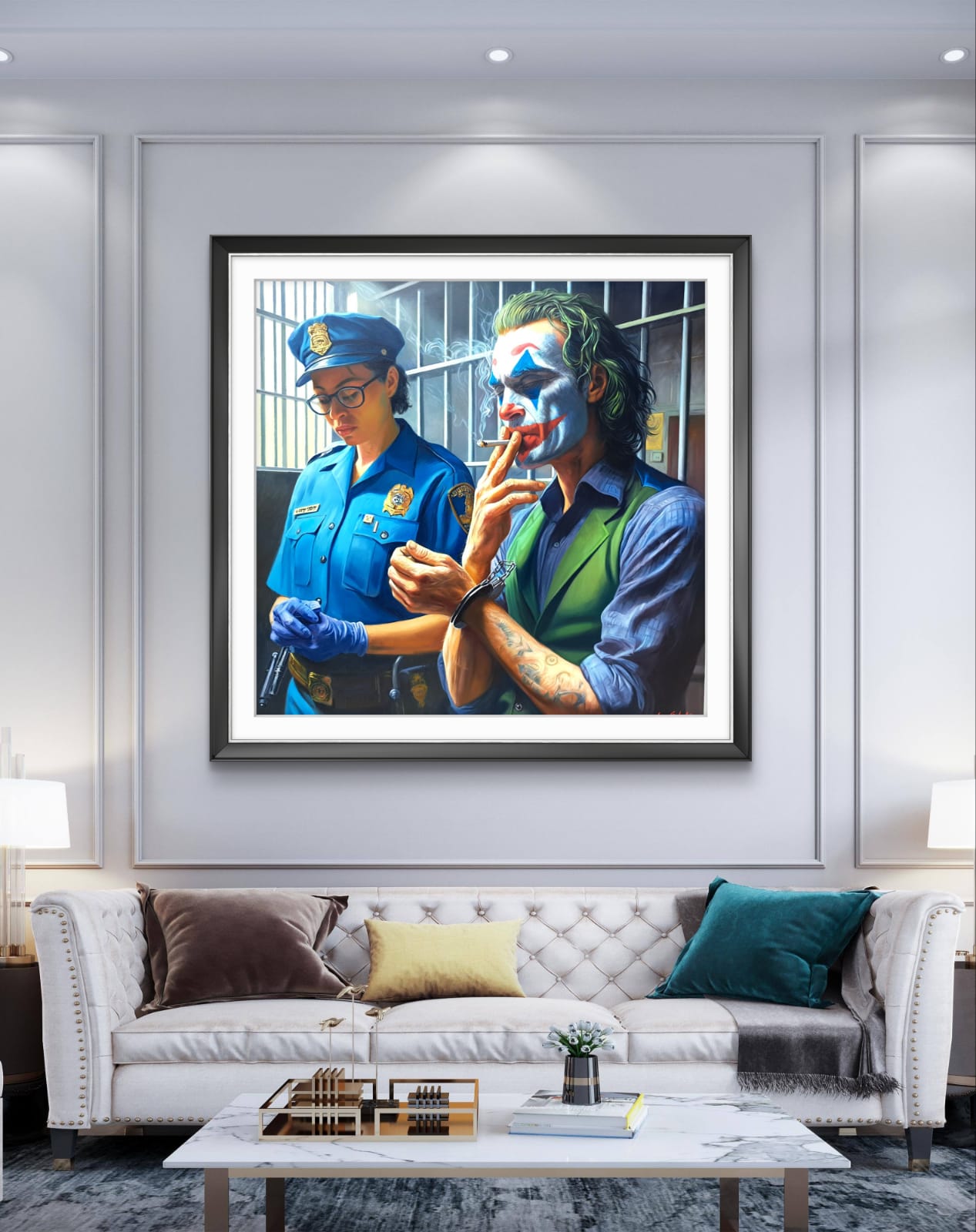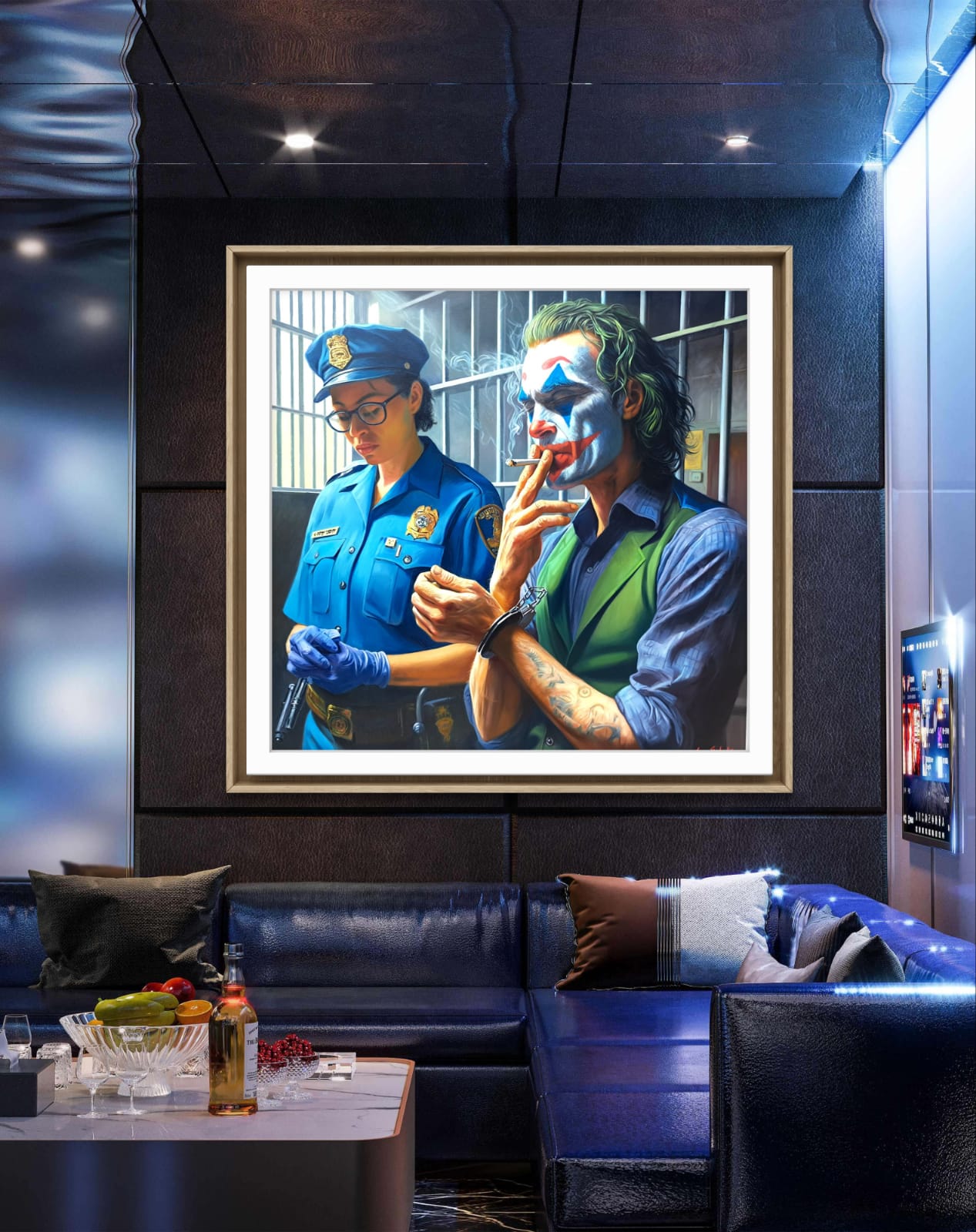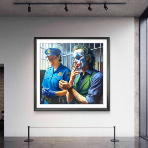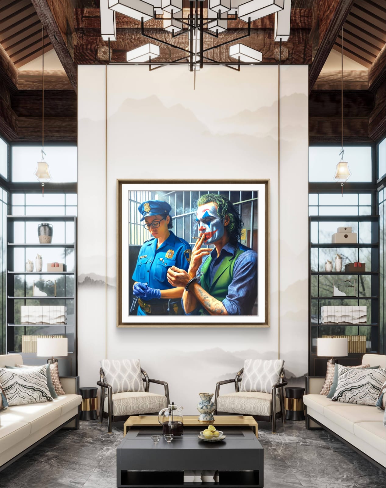 ​Il Joker è colto nel suo rituale: fuma, lasciando che il fumo si frapponga tra lui e l’agente come una cortina beffarda. Nonostante le manette, la sua postura suggerisce una libertà interiore che l’Ordine non può incatenare.