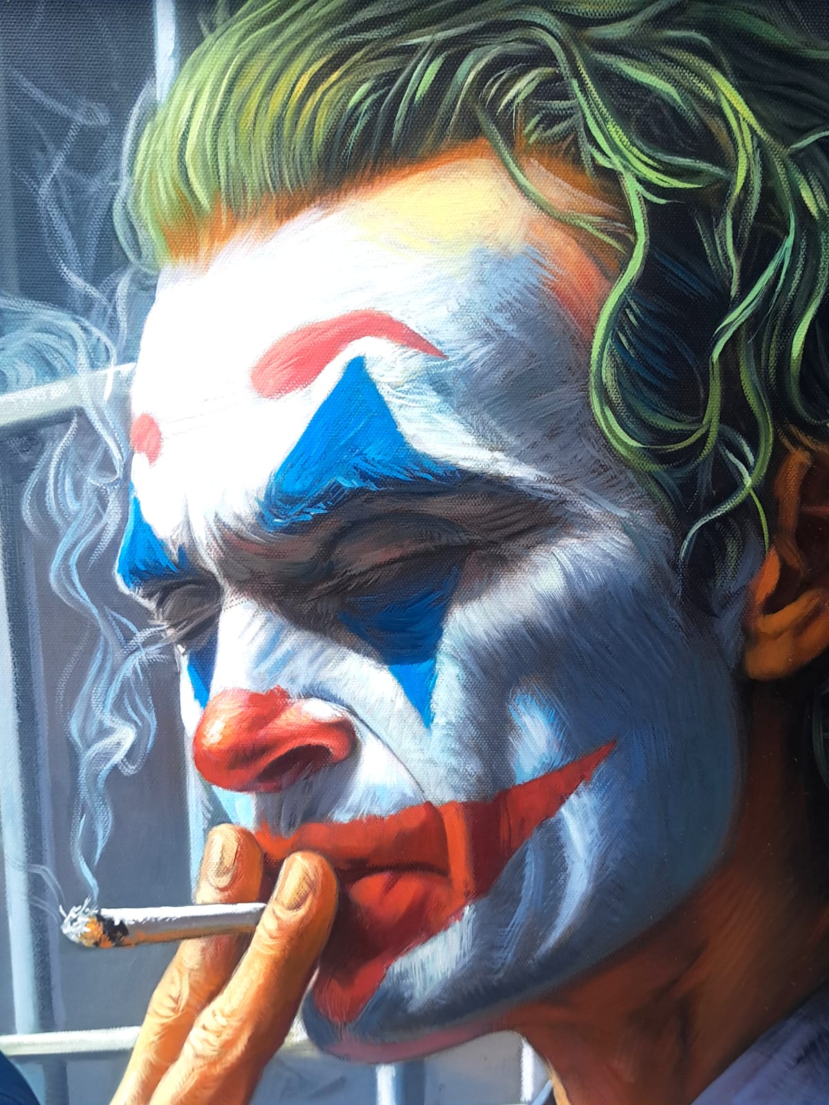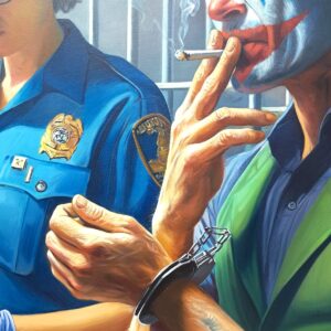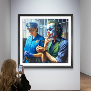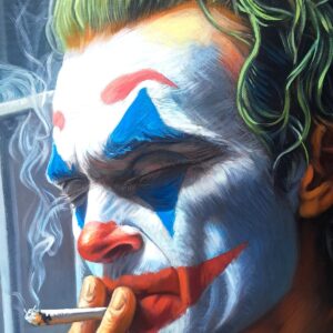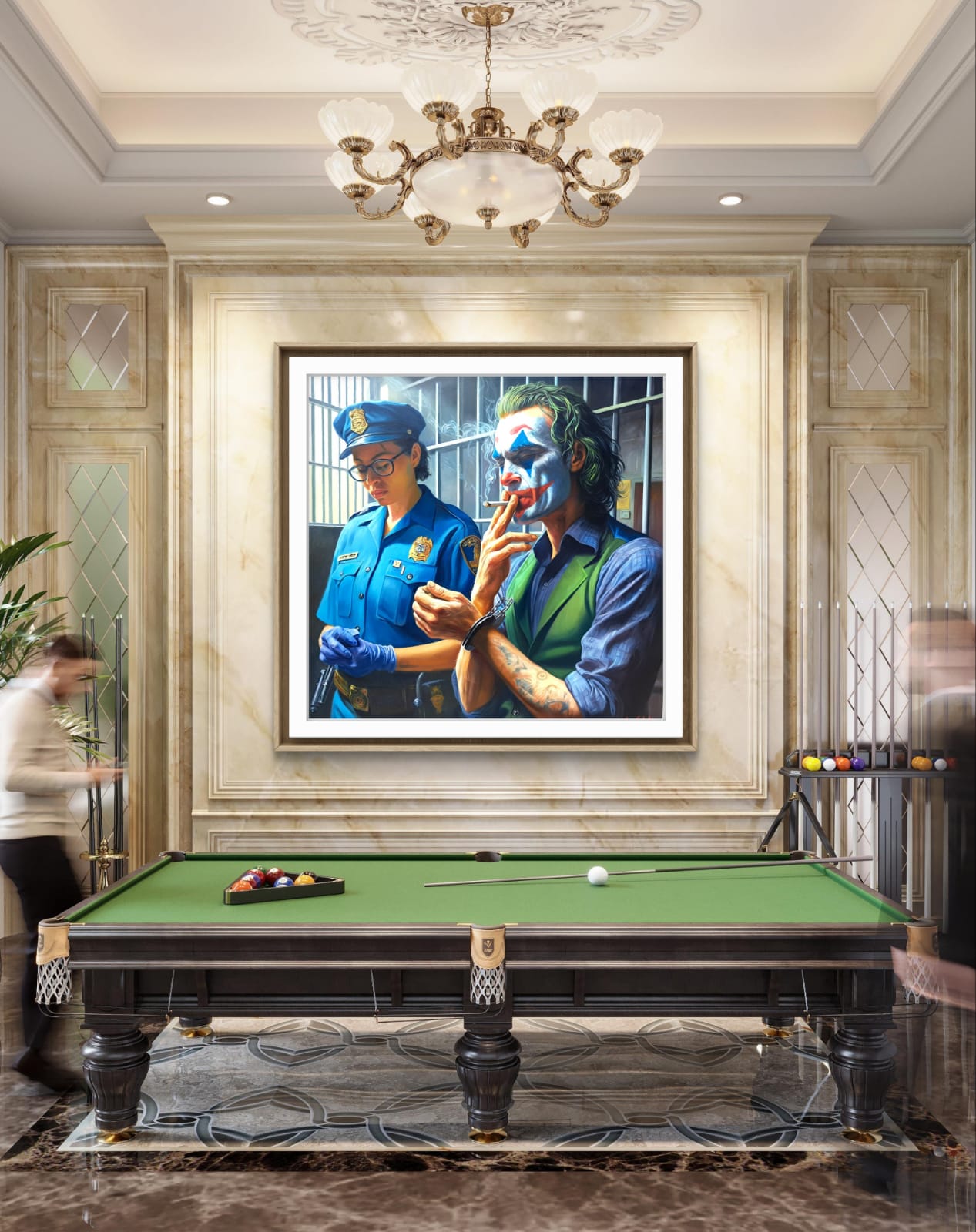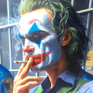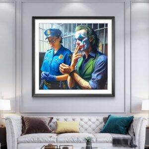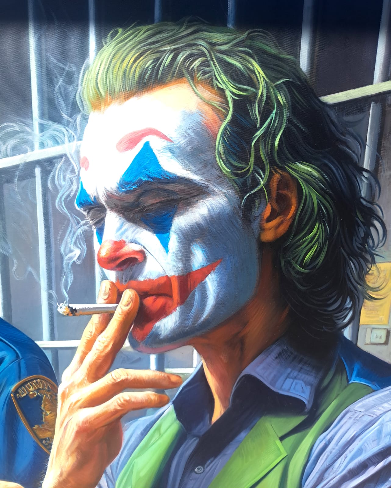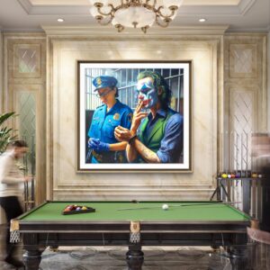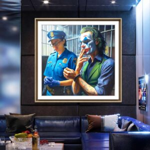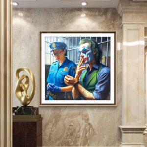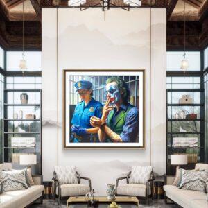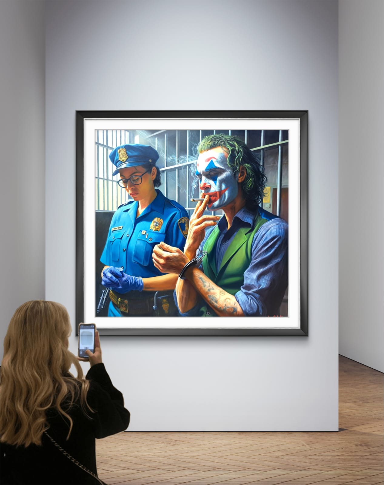 ​Il Joker è colto nel suo rituale: fuma, lasciando che il fumo si frapponga tra lui e l’agente come una cortina beffarda. Nonostante le manette, la sua postura suggerisce una libertà interiore che l’Ordine non può incatenare.
