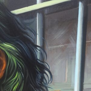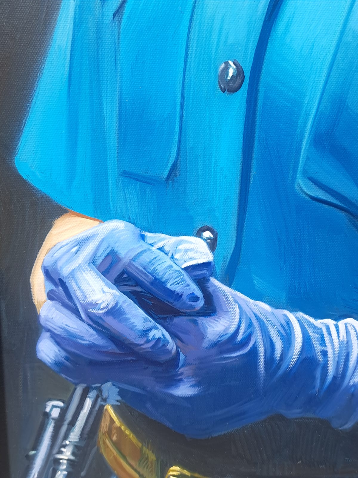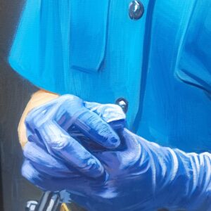 ​In quest’opera, ho scelto di focalizzare l’attenzione sull’agente di polizia donna. La sua figura incarna la professionalità, il dovere e il metodico contenimento. Il dettaglio dei Guanti Blu – un elemento di protocollo sanitario e di cautela – diventa un simbolo potente della barriera asettica che la Legge cerca di frapporre al contagio del Caos.
