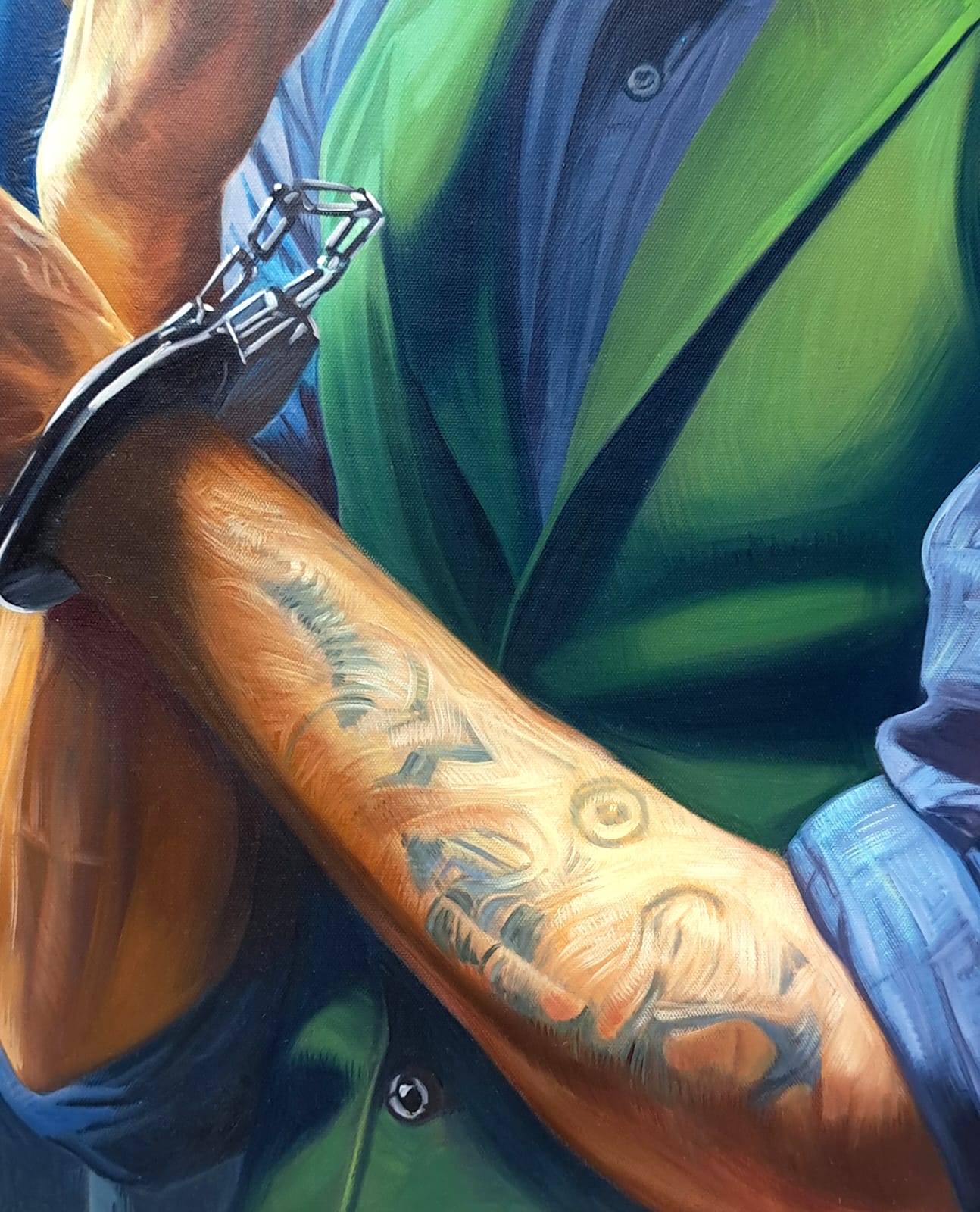 ​Attraverso questa composizione, ho voluto esplorare la tensione psicologica che si crea nella distanza minima, dove il confine tra il dovere e la fascinazione per l’ombra si fa più sottile. Voglio costringere l’osservatore a notare l’assenza di sguardo dell’agente, concentrata sull’atto pratico, un meccanismo di difesa necessario per non soccombere al magnetismo del Male. Il mio intento è far riflettere su quanto sia sottile la linea tra chi controlla e ciò che viene controllato.