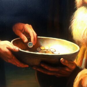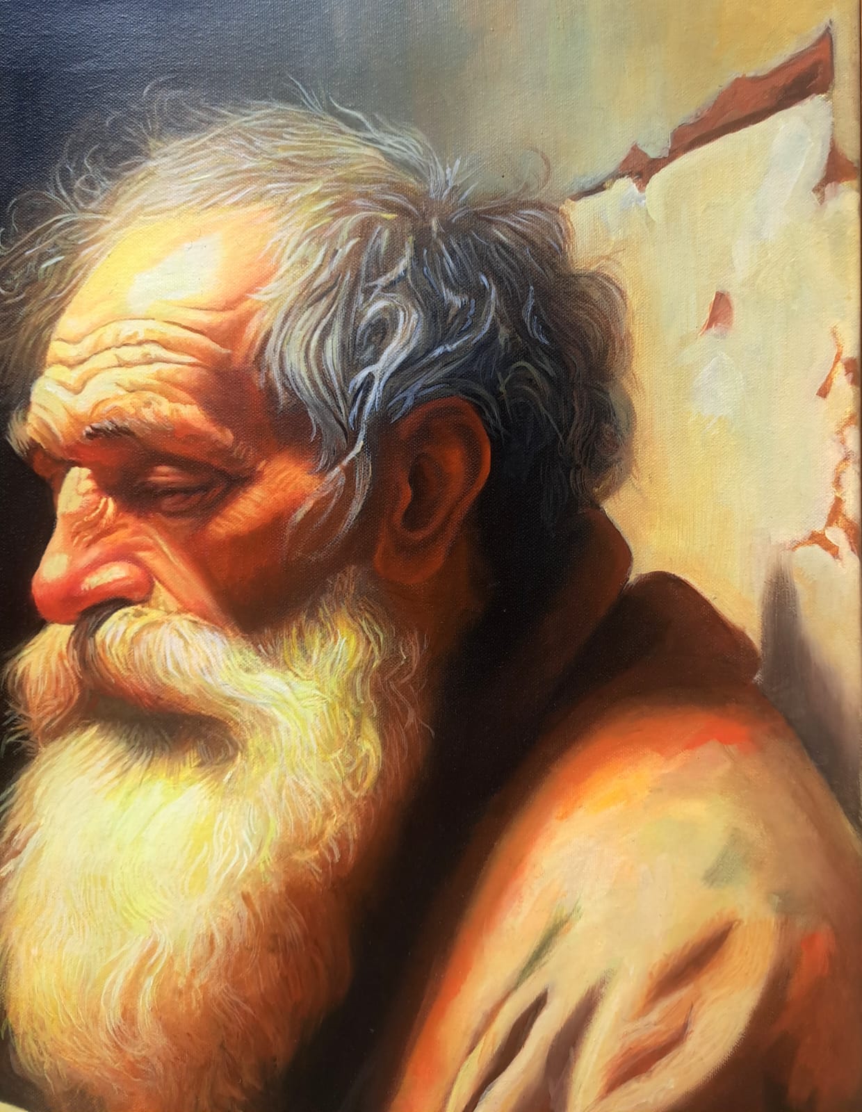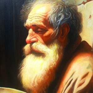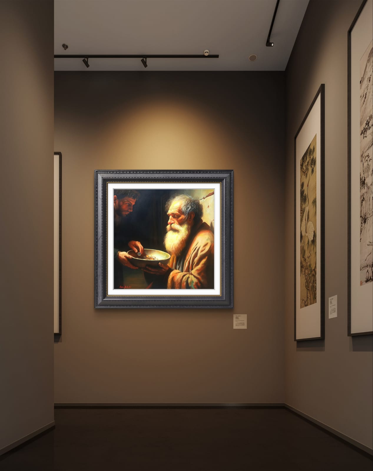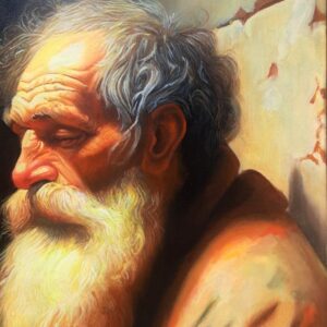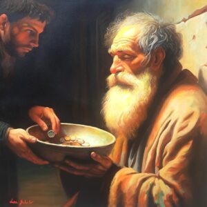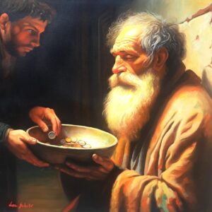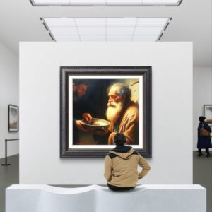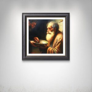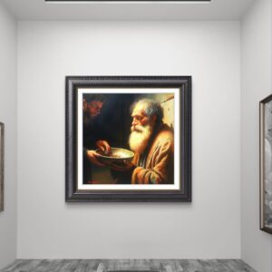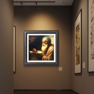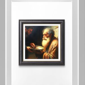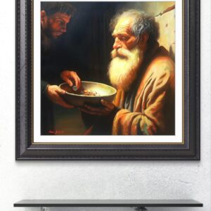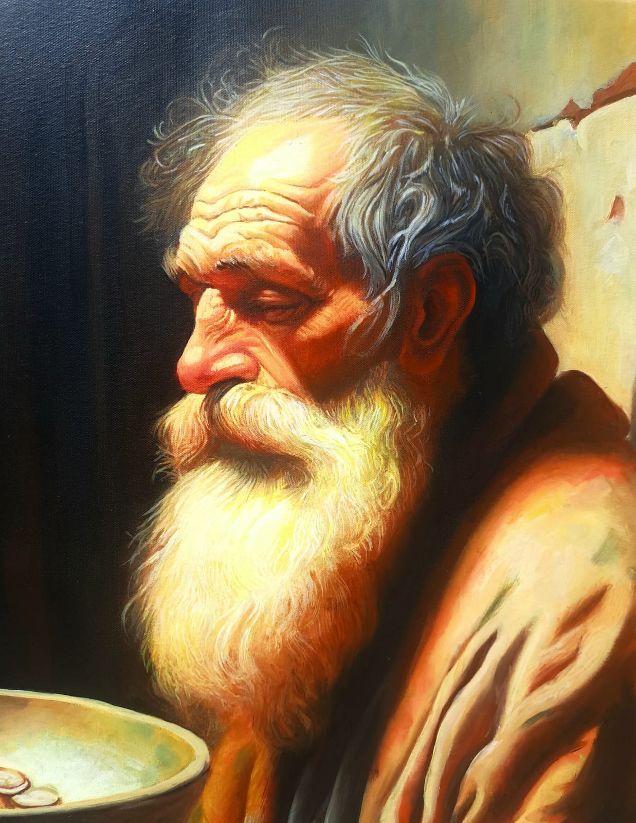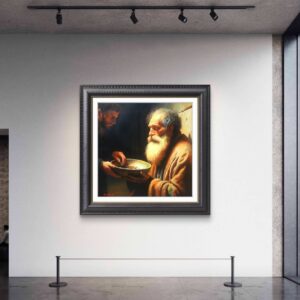 ​In questa scena intensa, ho scelto di immortalare la figura di un uomo anziano e barbuto, la cui espressione è una fusione di dignità, rassegnazione e speranza. Il suo volto, come la sua condizione, è avvolto da una luce calda e potente – la Luce – che lo rende sacro e vulnerabile. Egli tiene con fermezza il piattino in attesa.