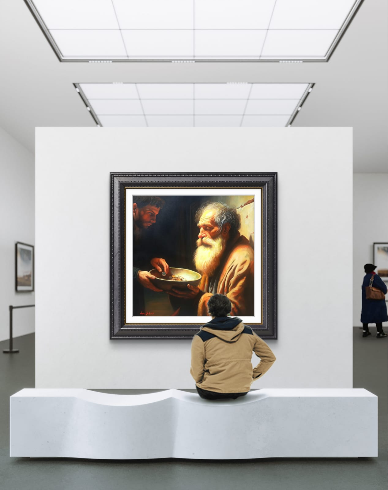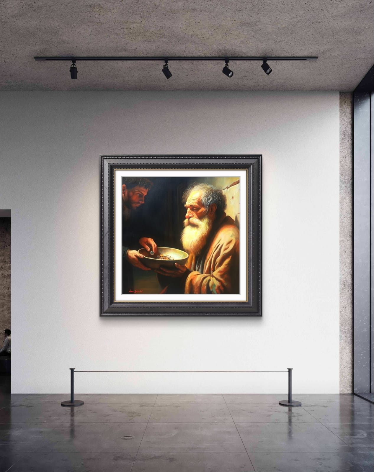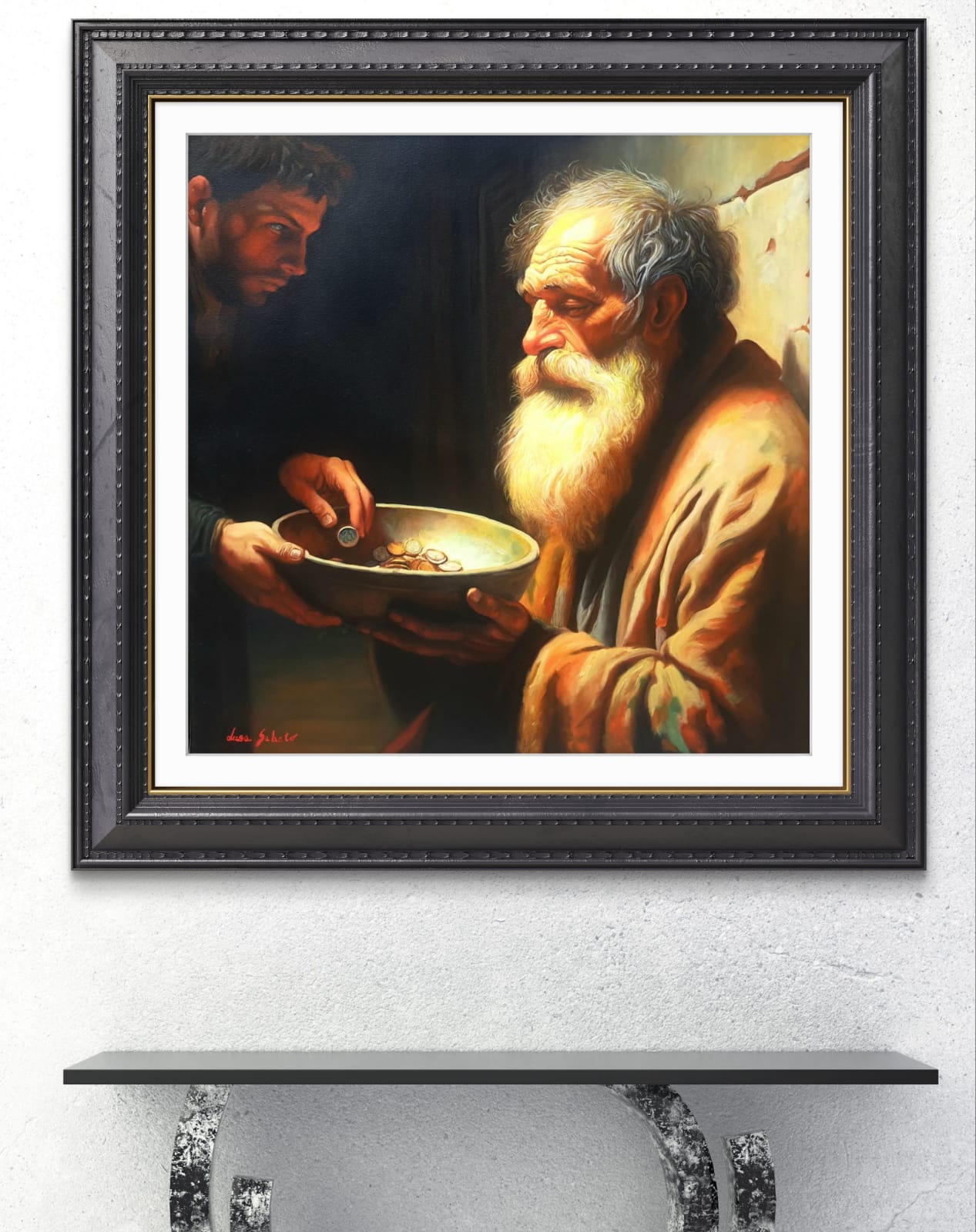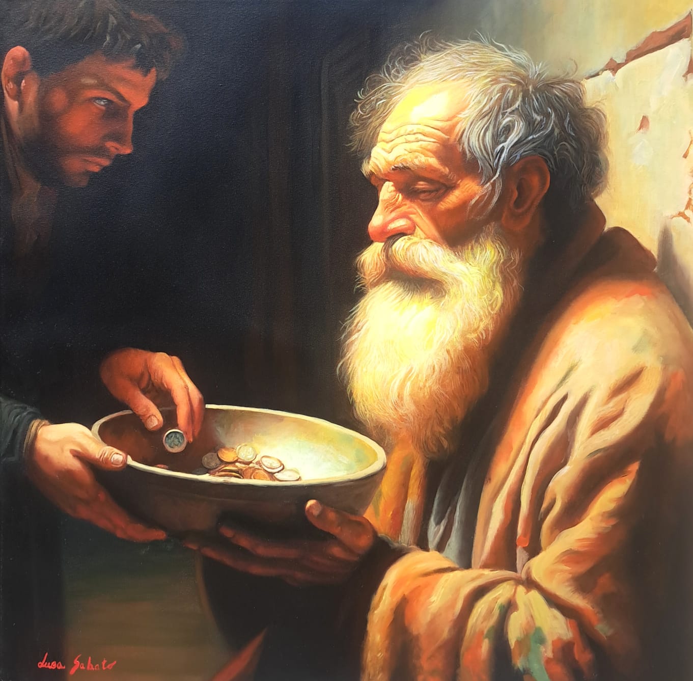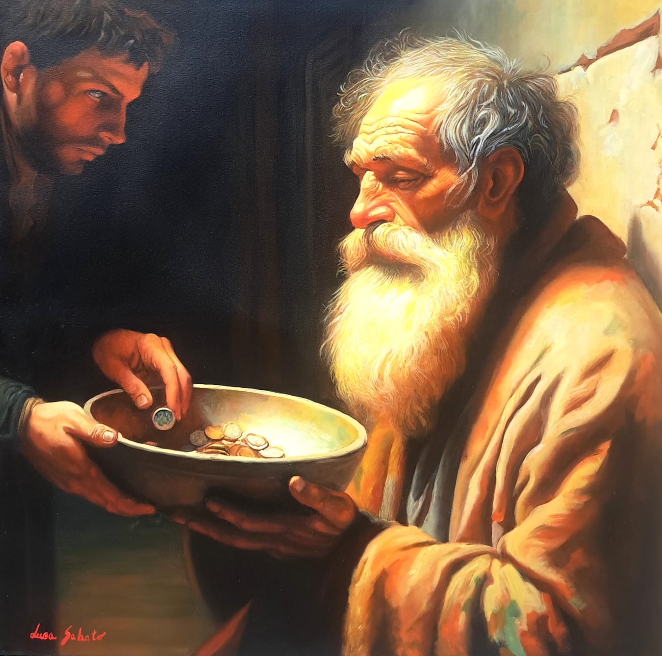 ​Di fronte a lui, in un netto contrasto pittorico, si staglia la figura del donatore, avvolta nell’Ombra. Questo giovane, con il suo sguardo intenso e concentrato, è colto nell’atto di lasciare cadere una moneta nella ciotola. Ho voluto rendere lo spazio tra i due un campo di tensione emotiva e morale: lo sguardo del povero si alza, carico di esperienza, verso il donatore, la cui espressione riflette la responsabilità, forse il giudizio, o semplicemente la necessità di agire.