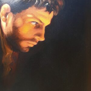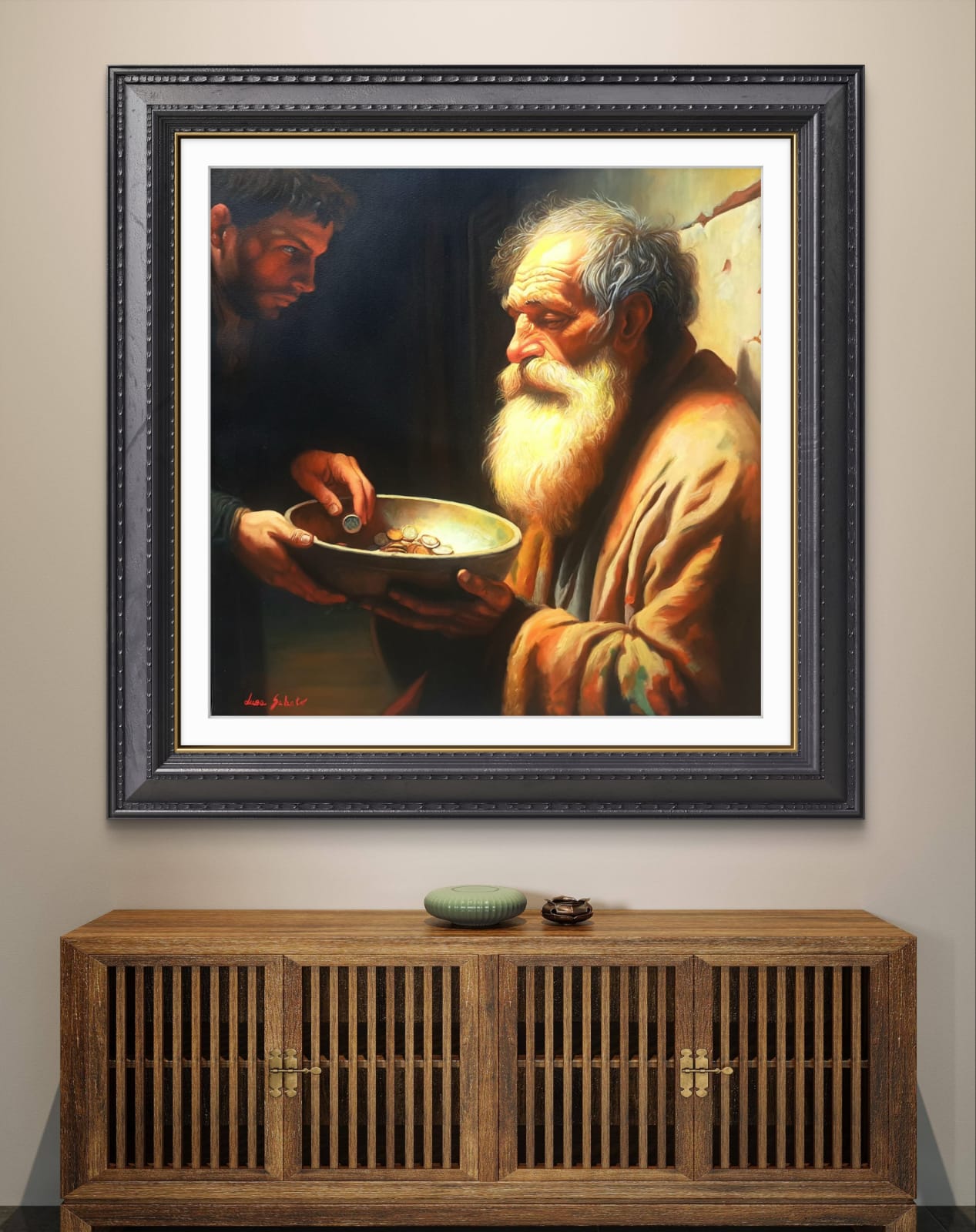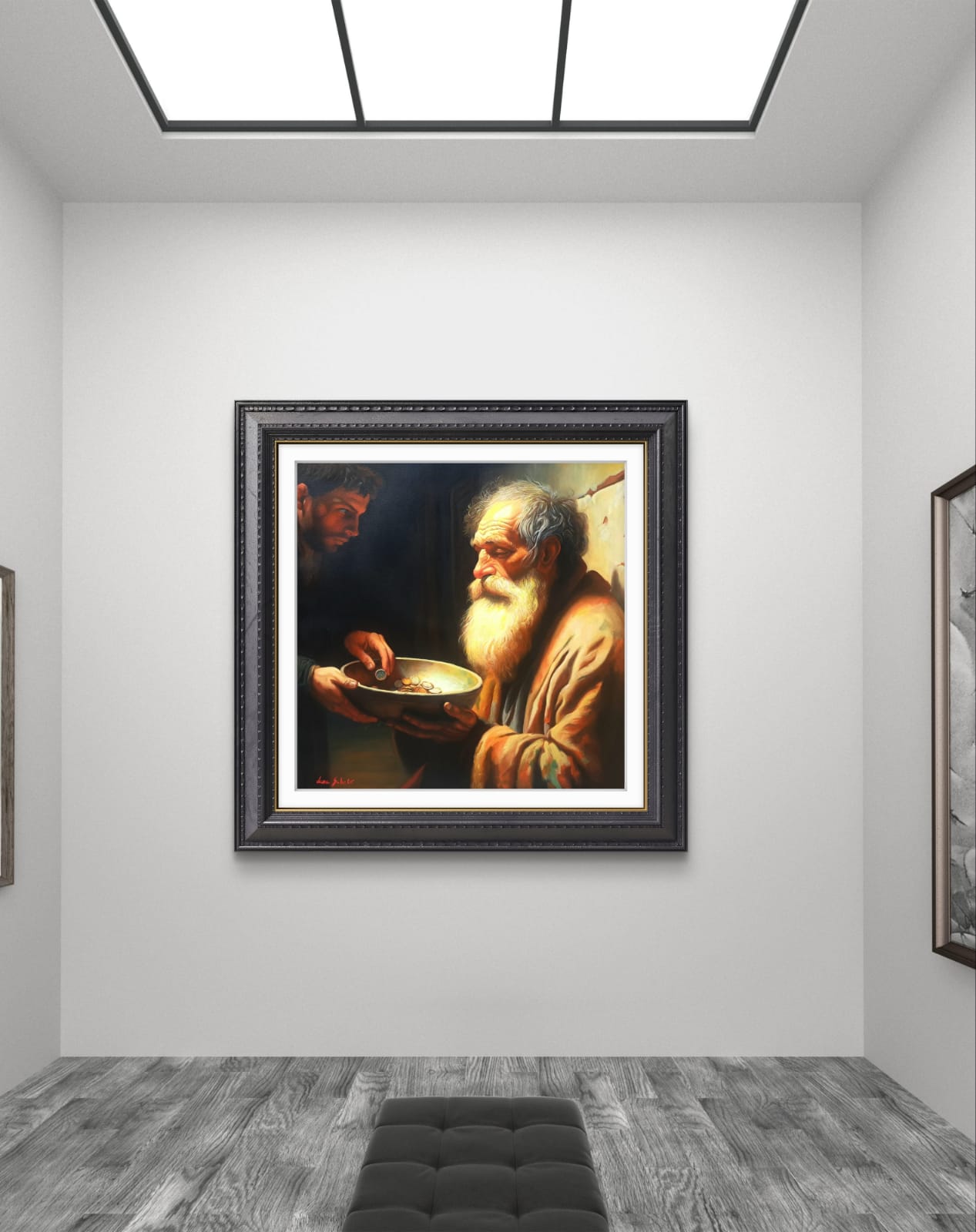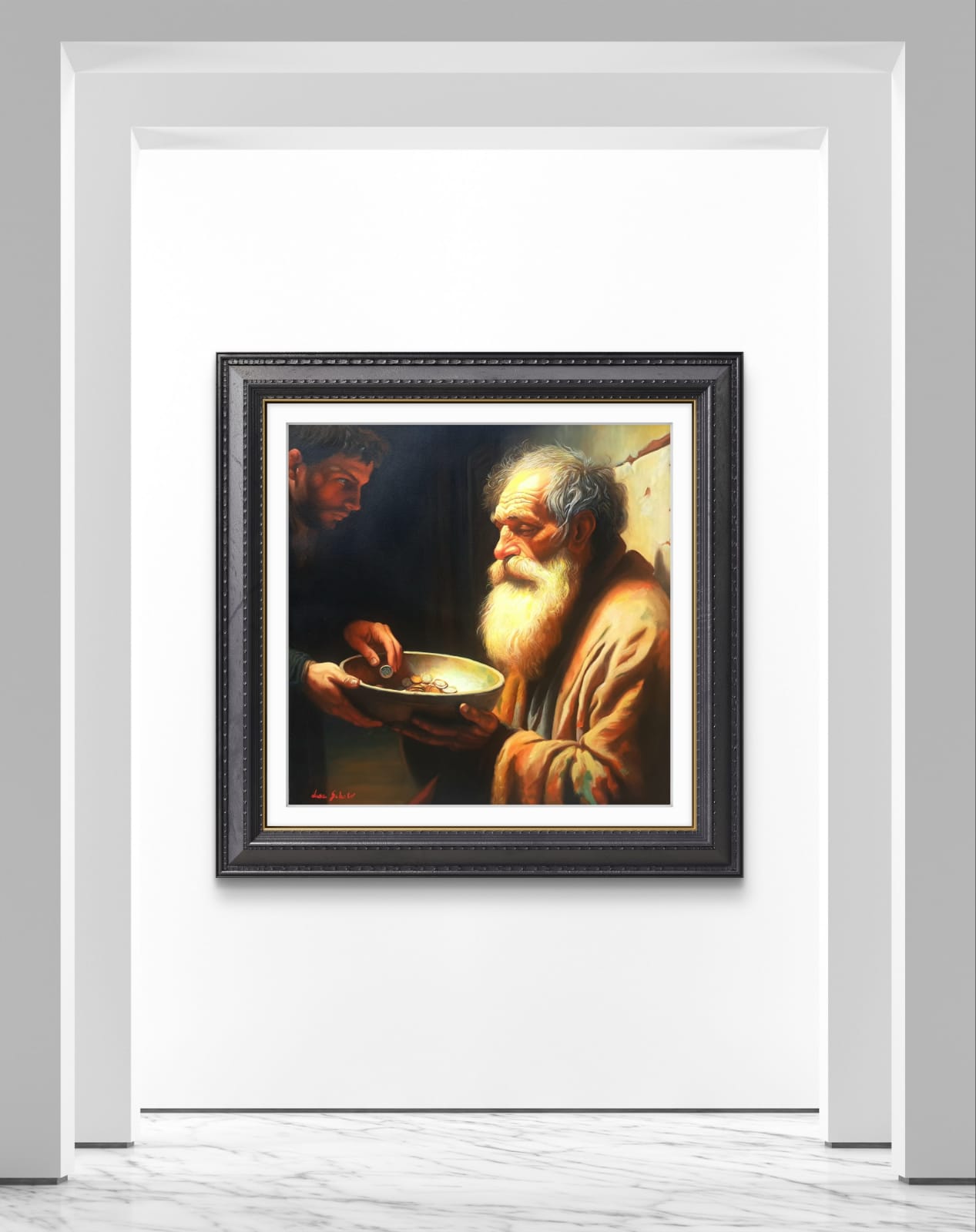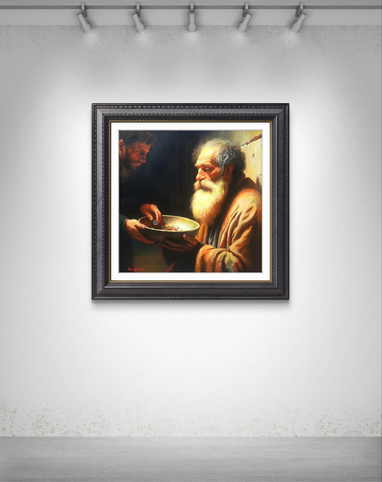 ​Di fronte a lui, in un netto contrasto pittorico, si staglia la figura del donatore, avvolta nell’Ombra. Questo giovane, con il suo sguardo intenso e concentrato, è colto nell’atto di lasciare cadere una moneta nella ciotola. Ho voluto rendere lo spazio tra i due un campo di tensione emotiva e morale: lo sguardo del povero si alza, carico di esperienza, verso il donatore, la cui espressione riflette la responsabilità, forse il giudizio, o semplicemente la necessità di agire.