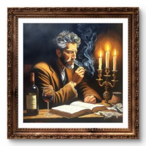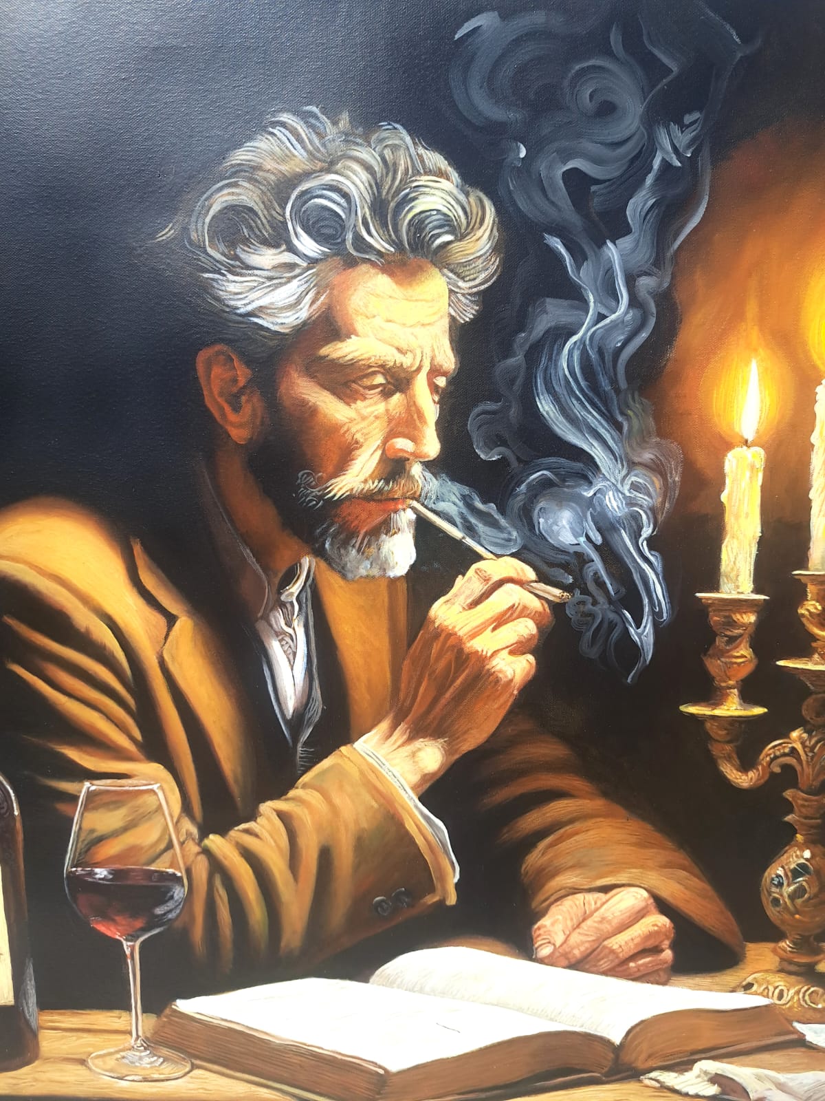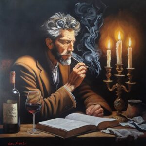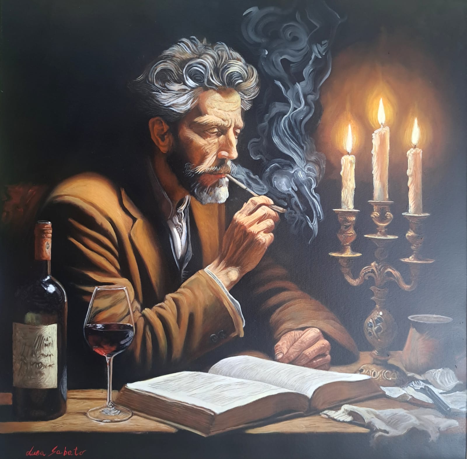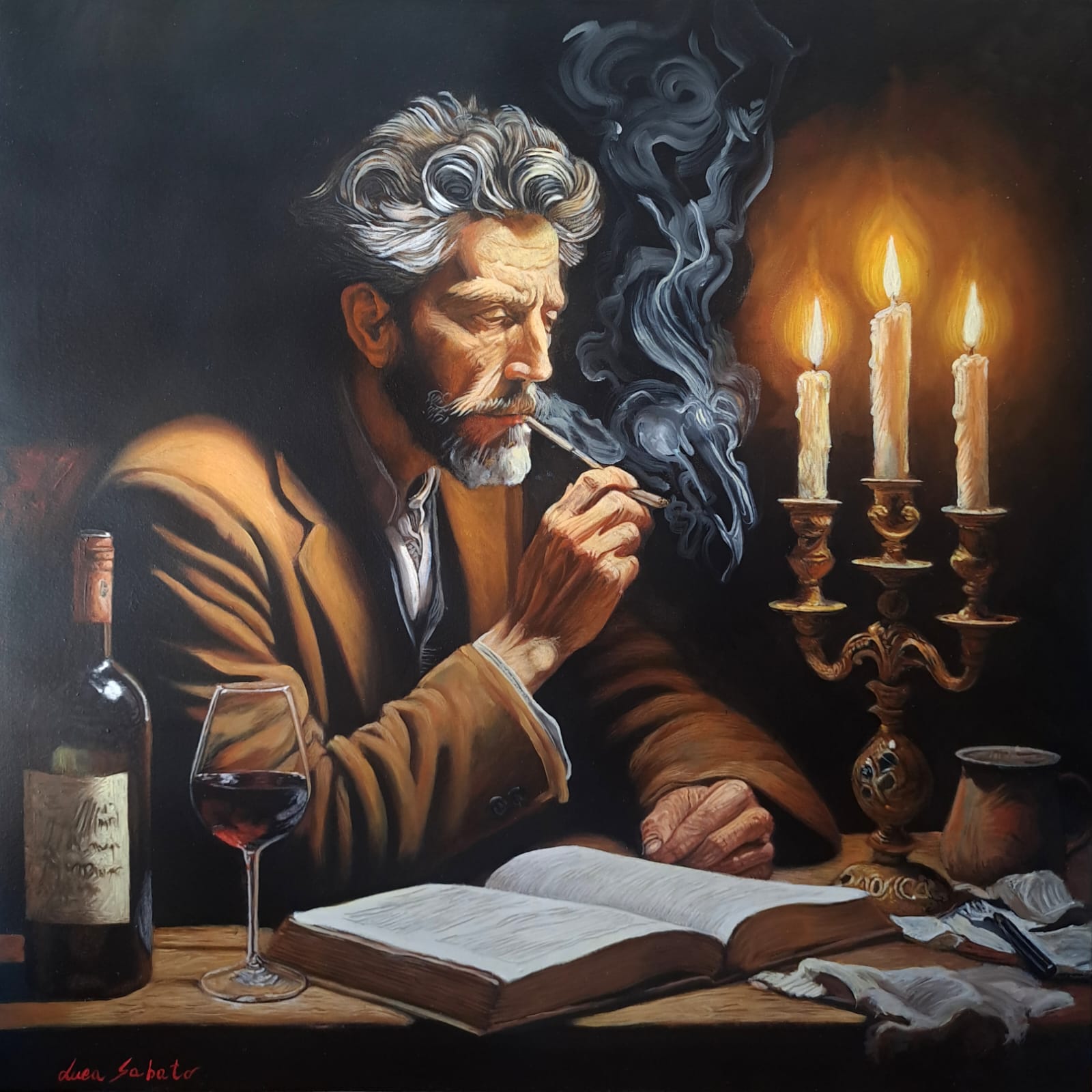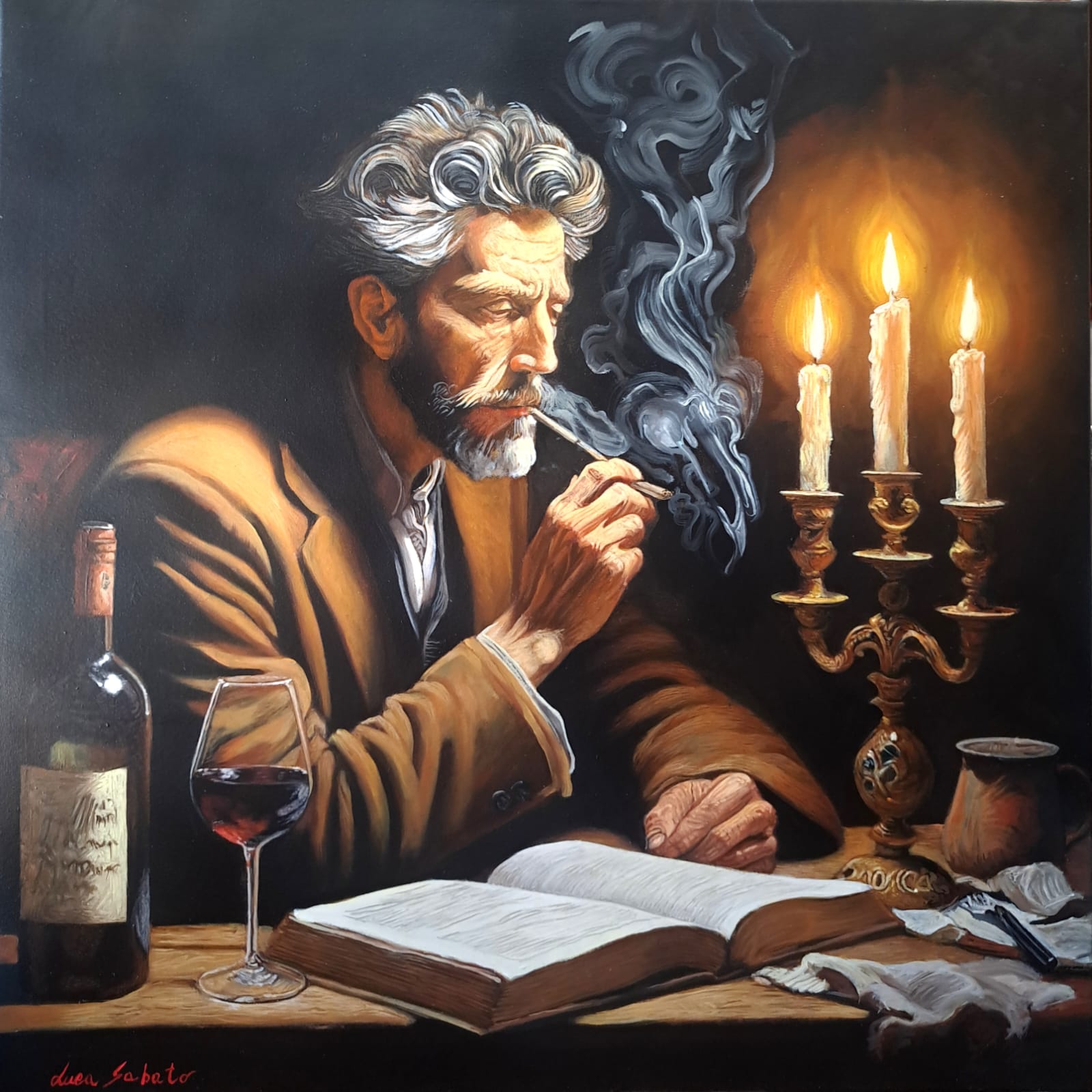 ​L’uomo è seduto di fronte a un libro aperto, simbolo della conoscenza e della ricerca continua. La sua espressione tesa suggerisce il peso del pensiero, mentre il gesto di fumare si trasforma in un rituale: il fumo che si innalza dalle labbra non è solo tabacco, ma la metafora visiva dei pensieri che si dissipano o si concretizzano. Il bicchiere di vino e la bottiglia completano la scena, introducendo un elemento di piacere terreno o di aiuto alla contemplazione.