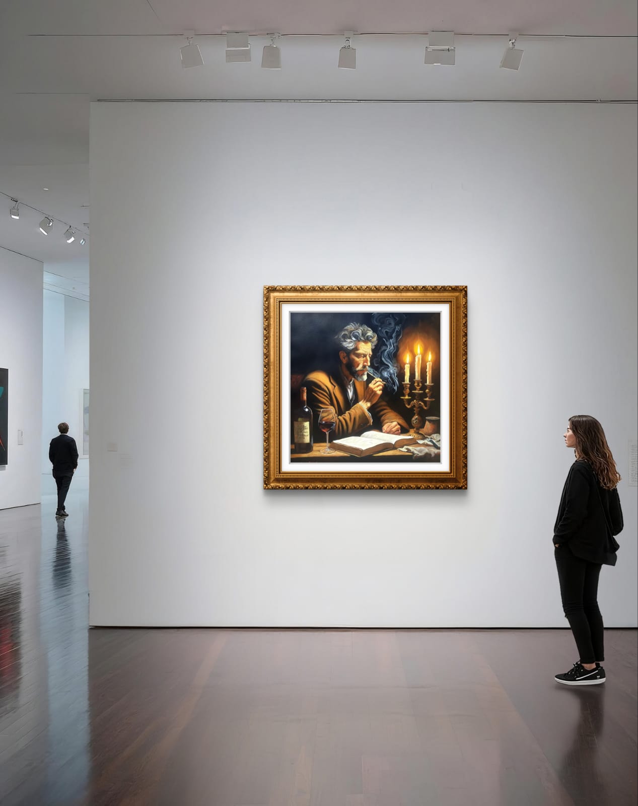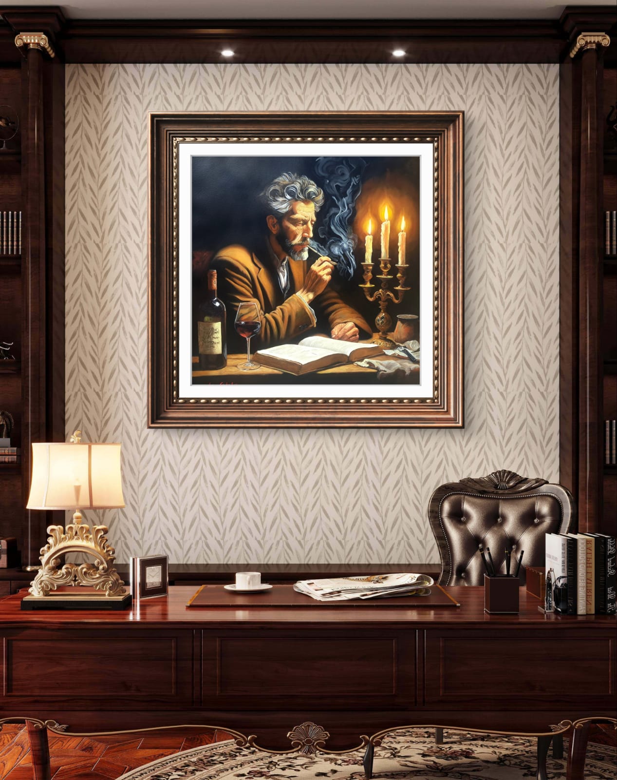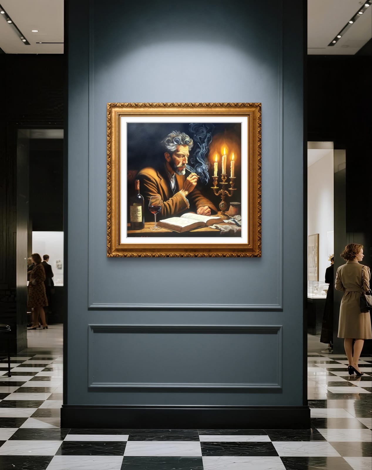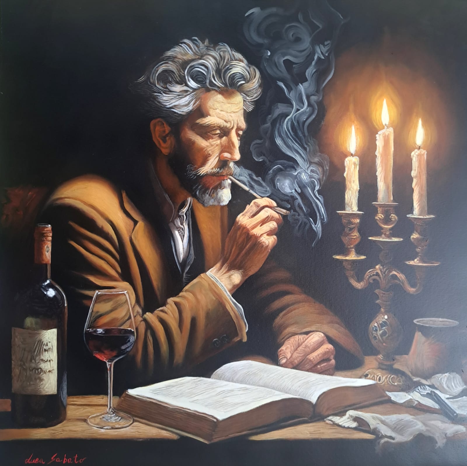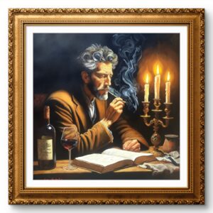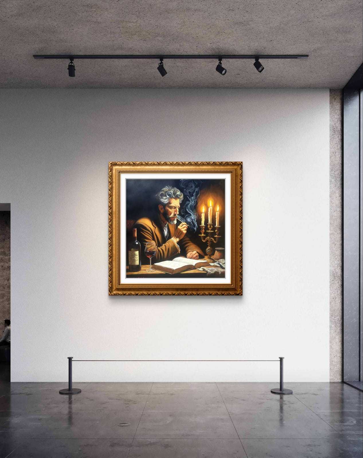​L’uomo è seduto di fronte a un libro aperto, simbolo della conoscenza e della ricerca continua. La sua espressione tesa suggerisce il peso del pensiero, mentre il gesto di fumare si trasforma in un rituale: il fumo che si innalza dalle labbra non è solo tabacco, ma la metafora visiva dei pensieri che si dissipano o si concretizzano. Il bicchiere di vino e la bottiglia completano la scena, introducendo un elemento di piacere terreno o di aiuto alla contemplazione.
