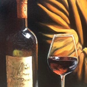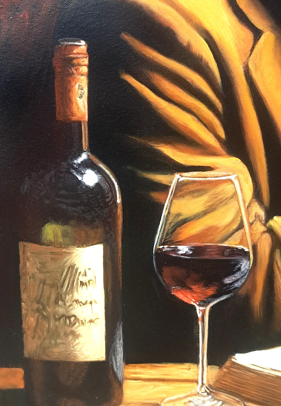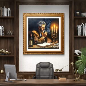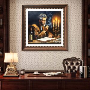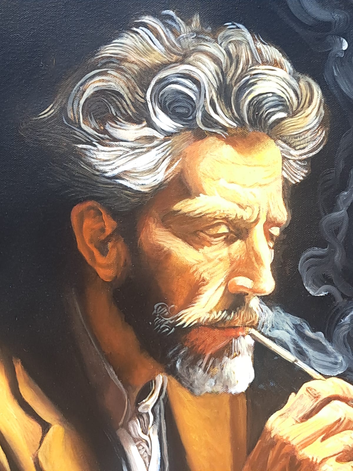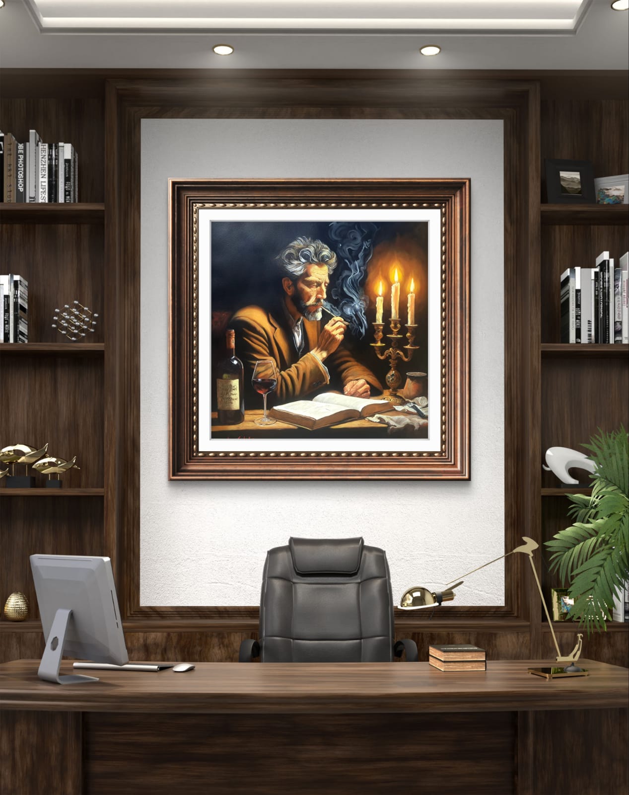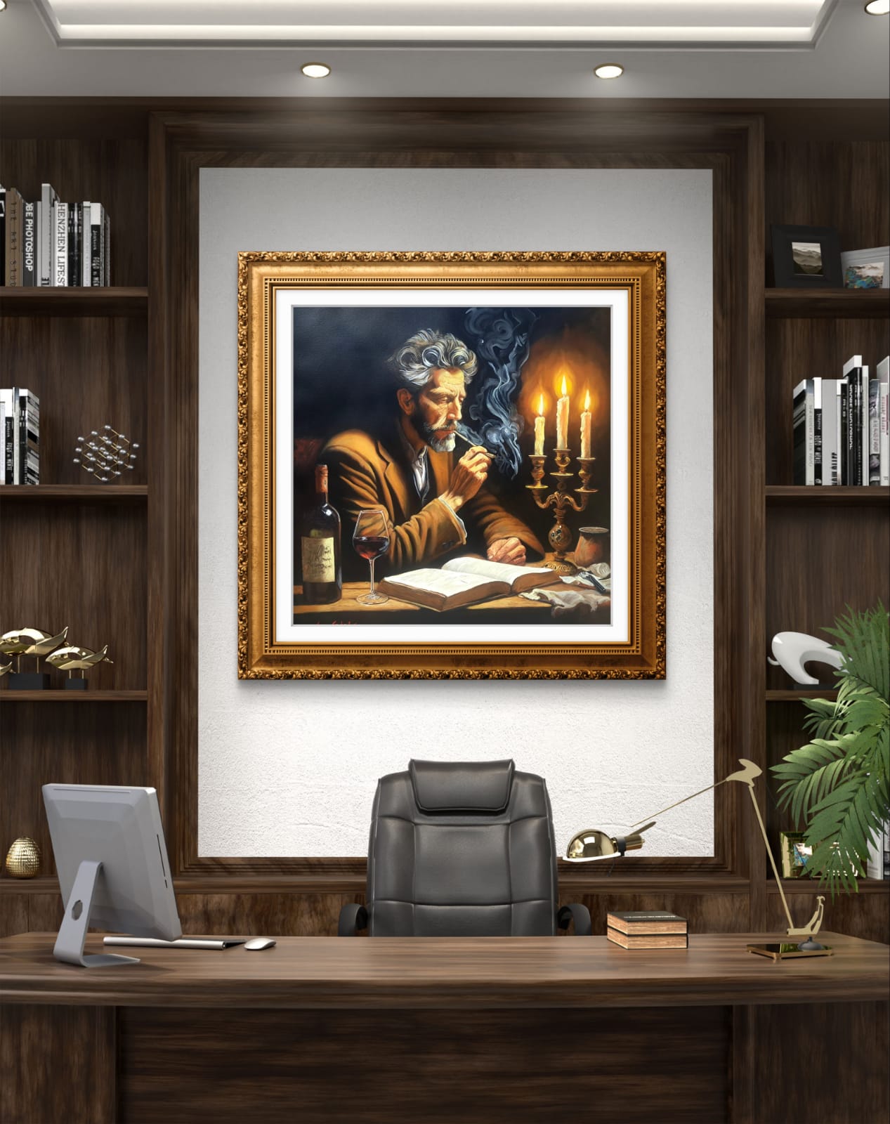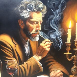 ​L’uomo è seduto di fronte a un libro aperto, simbolo della conoscenza e della ricerca continua. La sua espressione tesa suggerisce il peso del pensiero, mentre il gesto di fumare si trasforma in un rituale: il fumo che si innalza dalle labbra non è solo tabacco, ma la metafora visiva dei pensieri che si dissipano o si concretizzano. Il bicchiere di vino e la bottiglia completano la scena, introducendo un elemento di piacere terreno o di aiuto alla contemplazione.