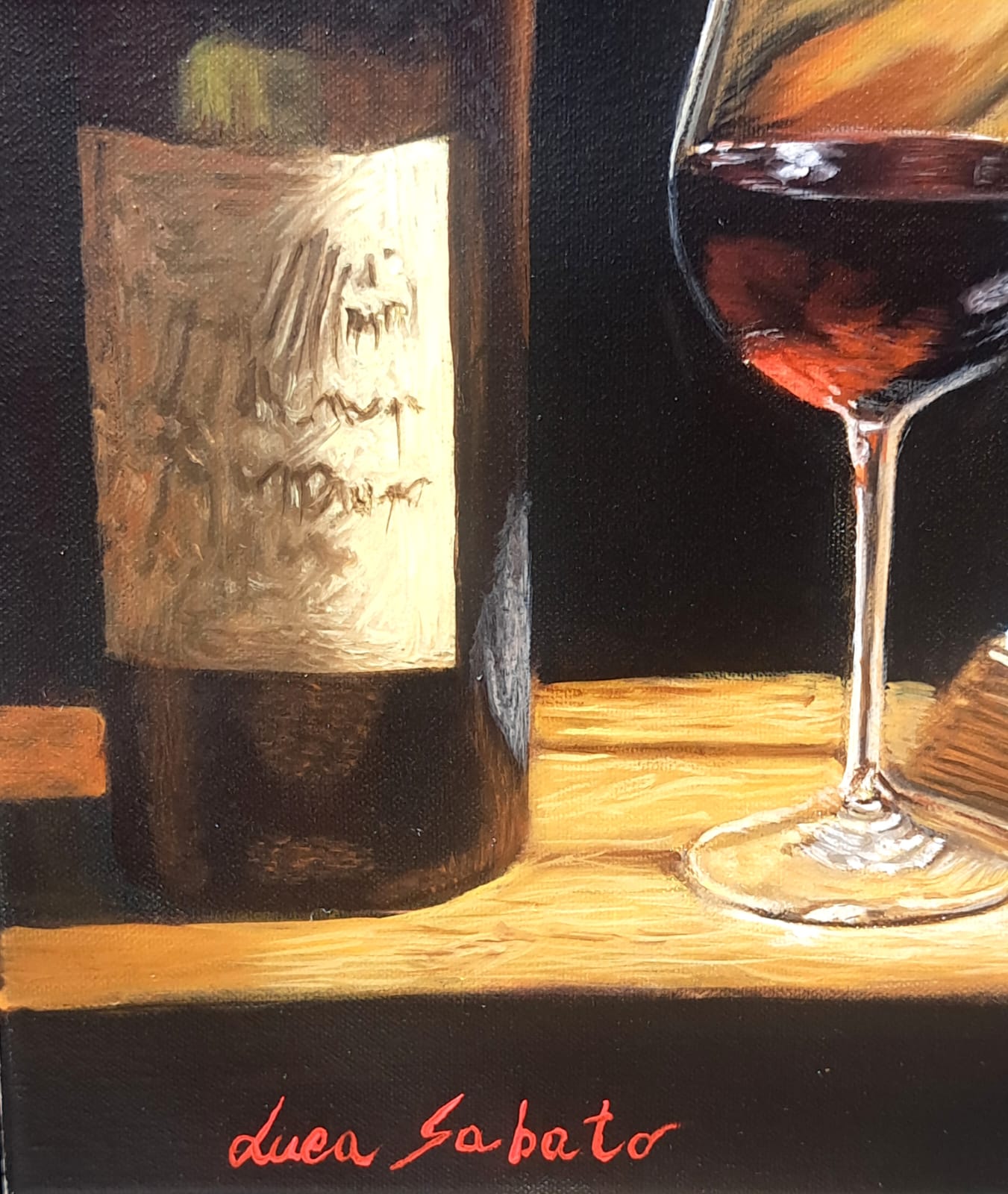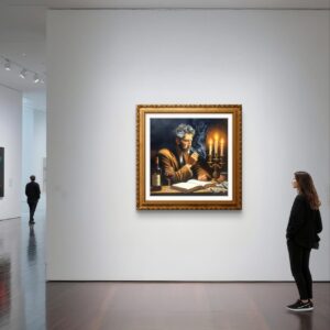 ​In quest’opera, ho scelto di immortalare un uomo in un profondo stato di introspezione. La luce flebile e calda delle candele su candelabro illumina solo parzialmente il volto e l’ambiente, richiamando la tecnica del Seicento e la tensione tra il buio che avvolge e la saggezza che si cerca.