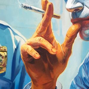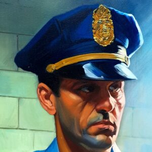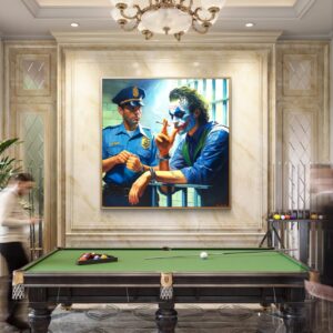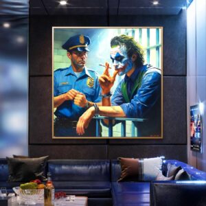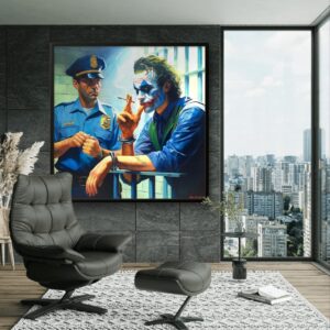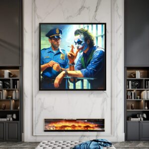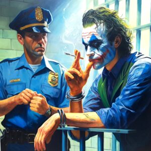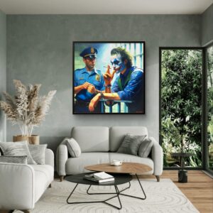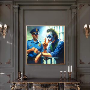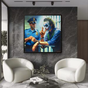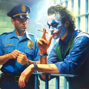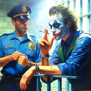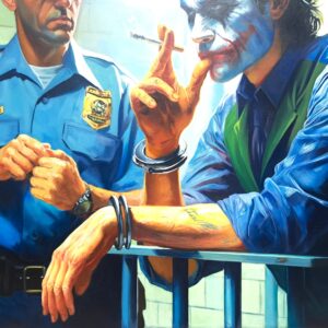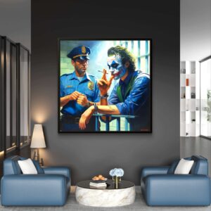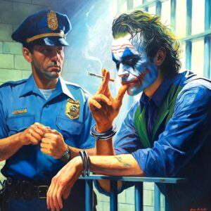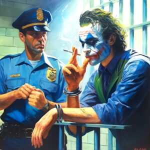 ​In quest’opera, ho scelto di immortalare un momento cruciale: l’agente di polizia, l’incarnazione dell’Ordine e della Legge, osserva intensamente il Joker, figura del Caos e dell’irrazionalità, ammanettato ma in totale controllo della scena. Non è un semplice ritratto di personaggi pop; è un’analisi psicologica della lotta per la supremazia morale.