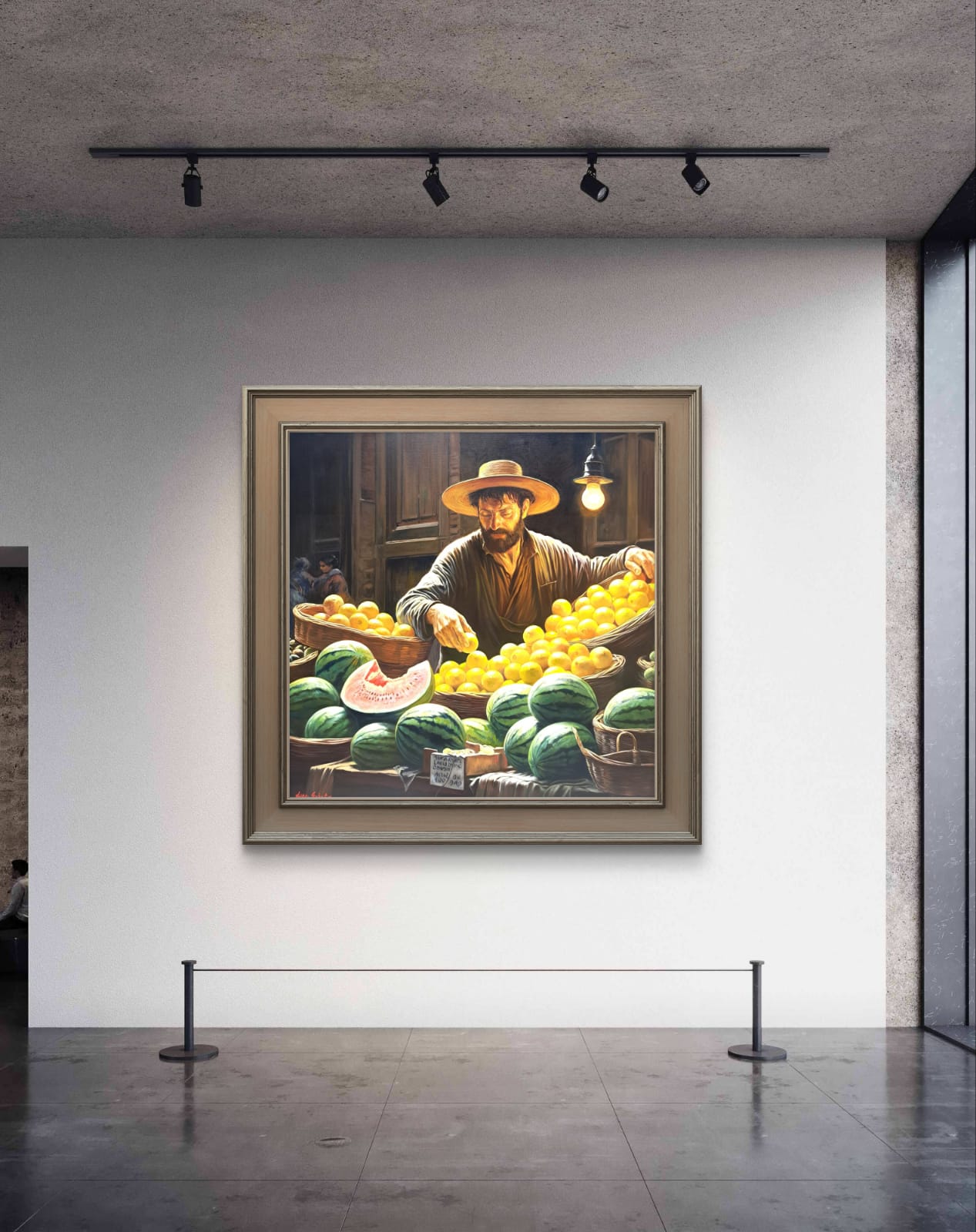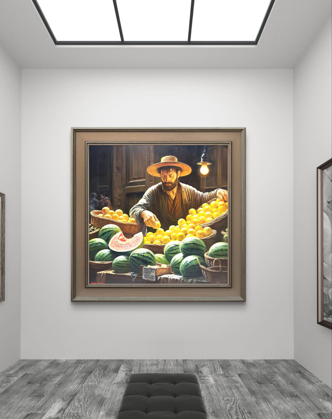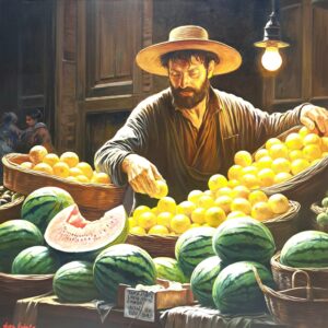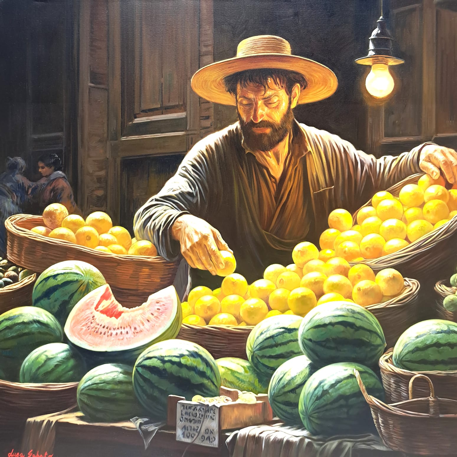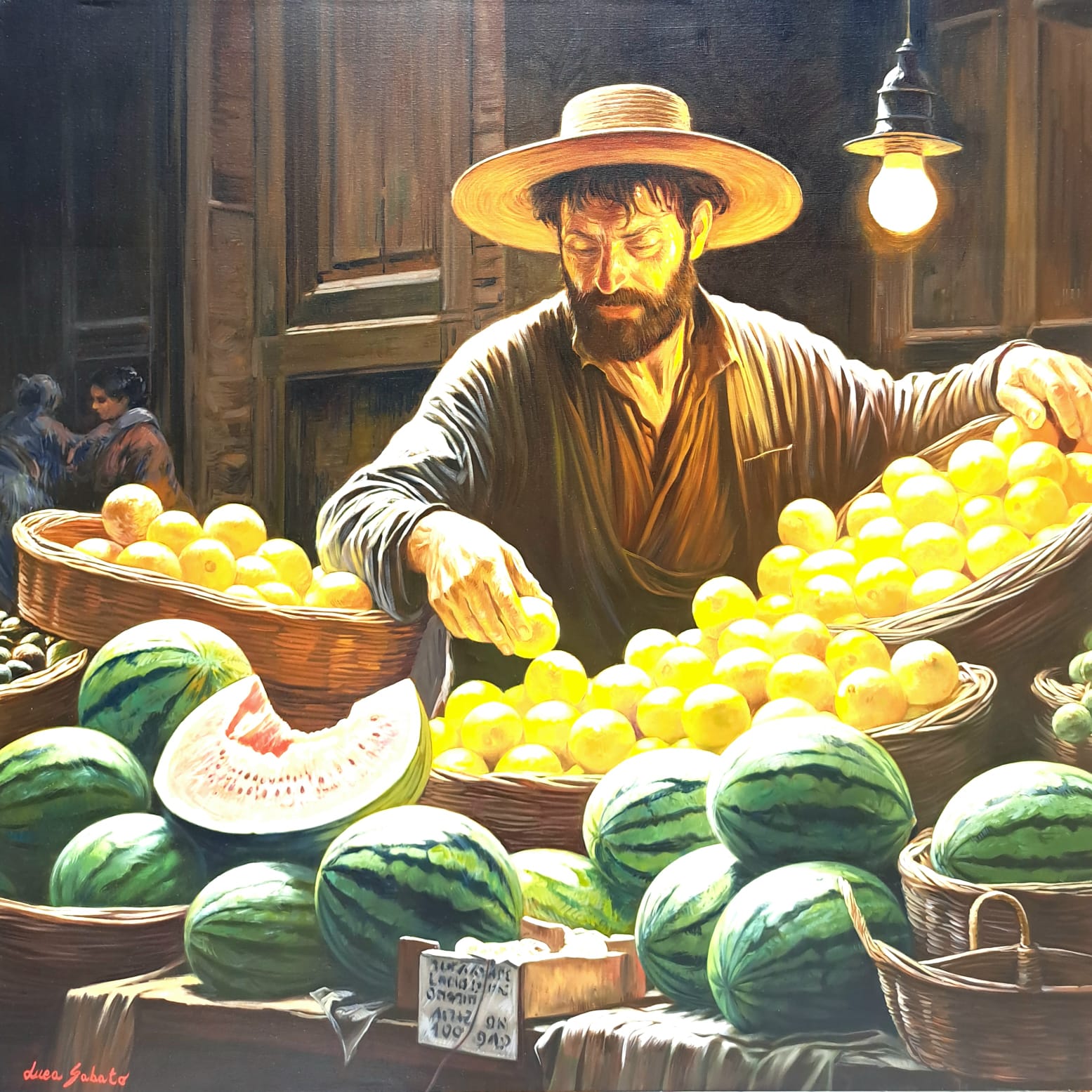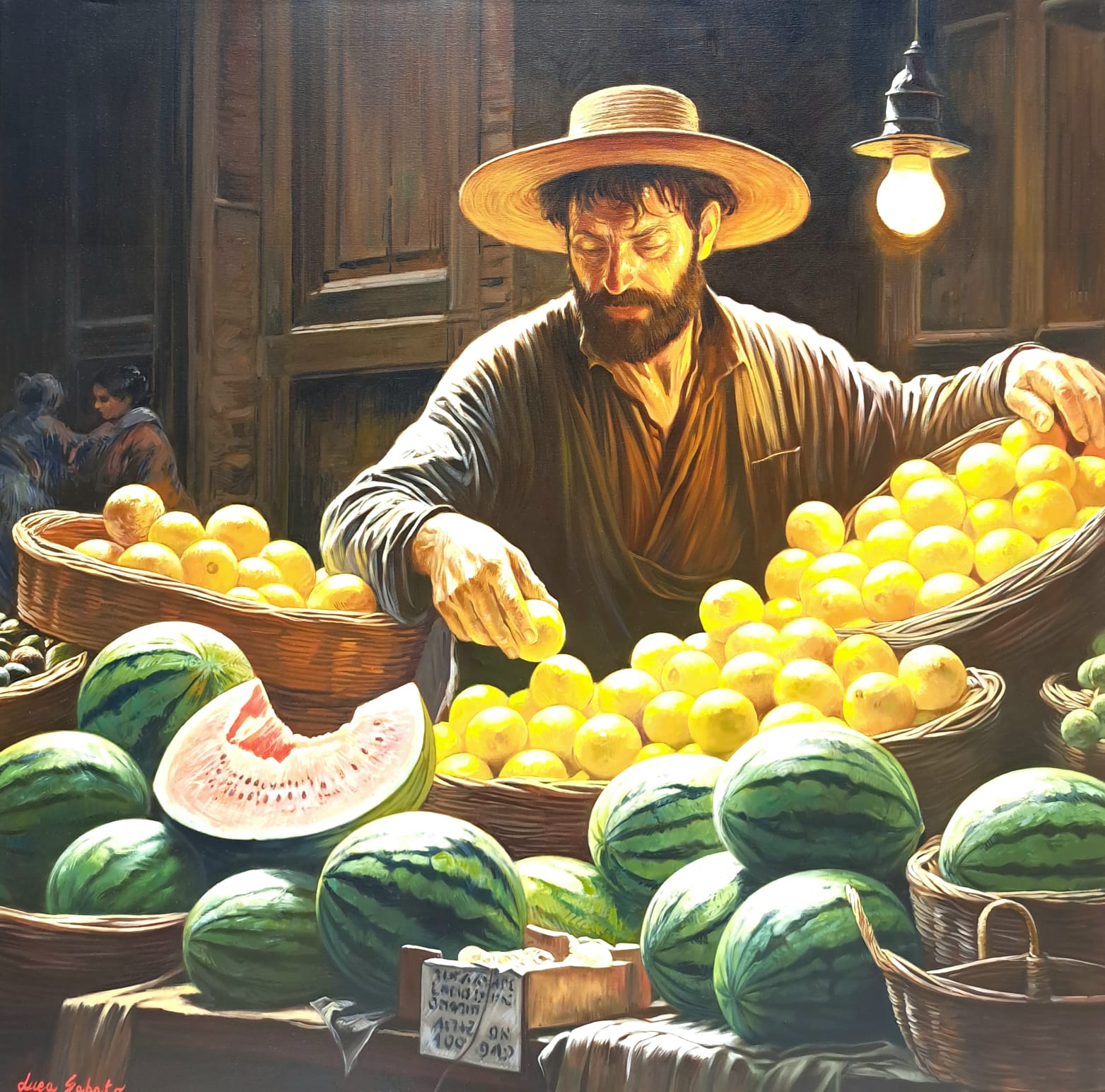 In quest’opera, ho cercato di immortalare l’intimità del lavoro e del raccolto sotto una luce artificiale che diventa quasi mistica. Il venditore, figura solida e radicata, è circondato dall’Oro vibrante dei limoni e dal verde profondo delle angurie, una delle quali ho voluto squarciare per rivelare la polpa rossa e carnosa: un inno alla fertilità e all’abbondanza.