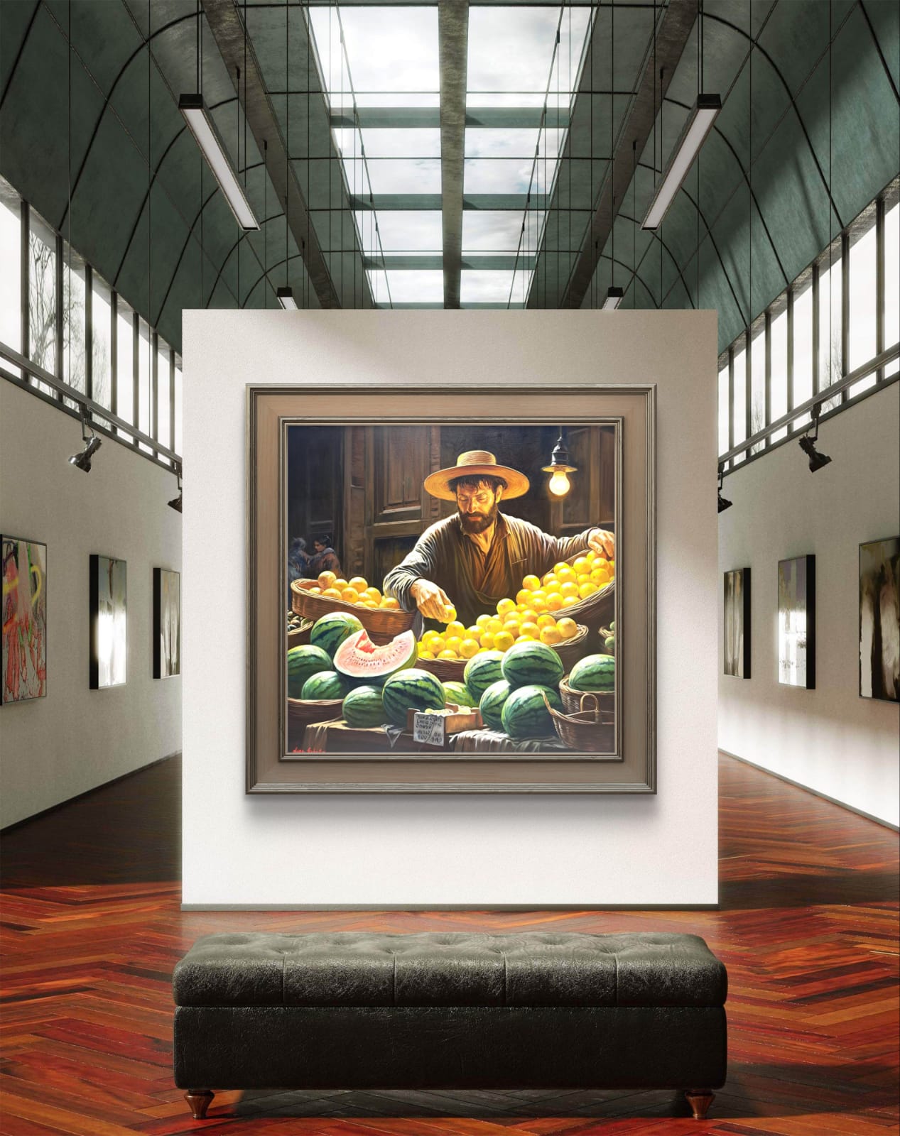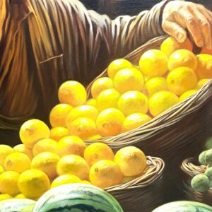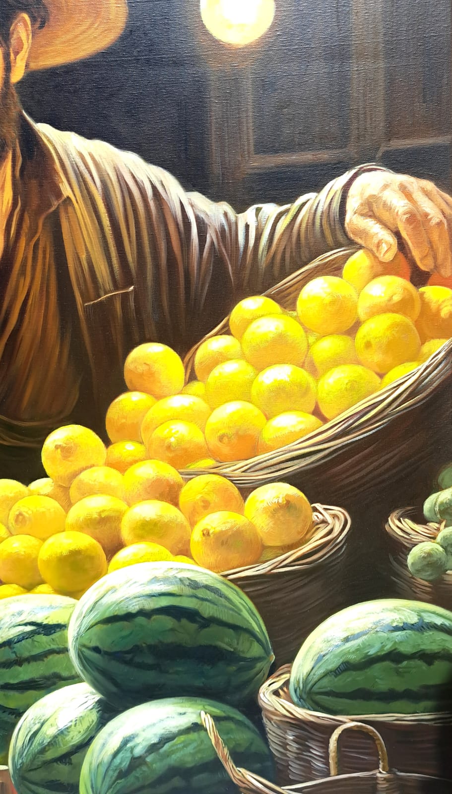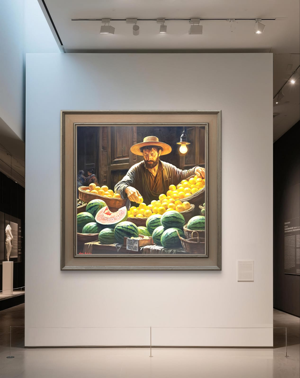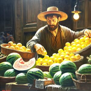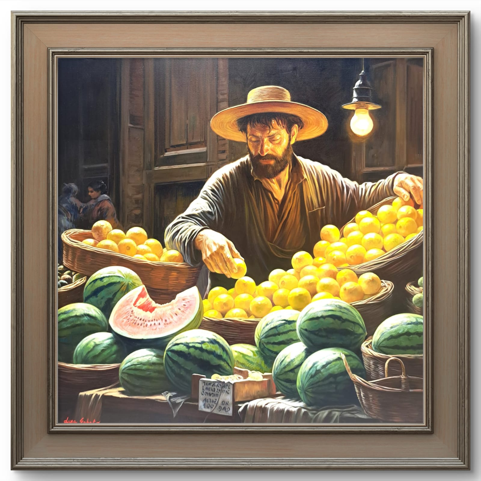 In quest’opera, ho cercato di immortalare l’intimità del lavoro e del raccolto sotto una luce artificiale che diventa quasi mistica. Il venditore, figura solida e radicata, è circondato dall’Oro vibrante dei limoni e dal verde profondo delle angurie, una delle quali ho voluto squarciare per rivelare la polpa rossa e carnosa: un inno alla fertilità e all’abbondanza.