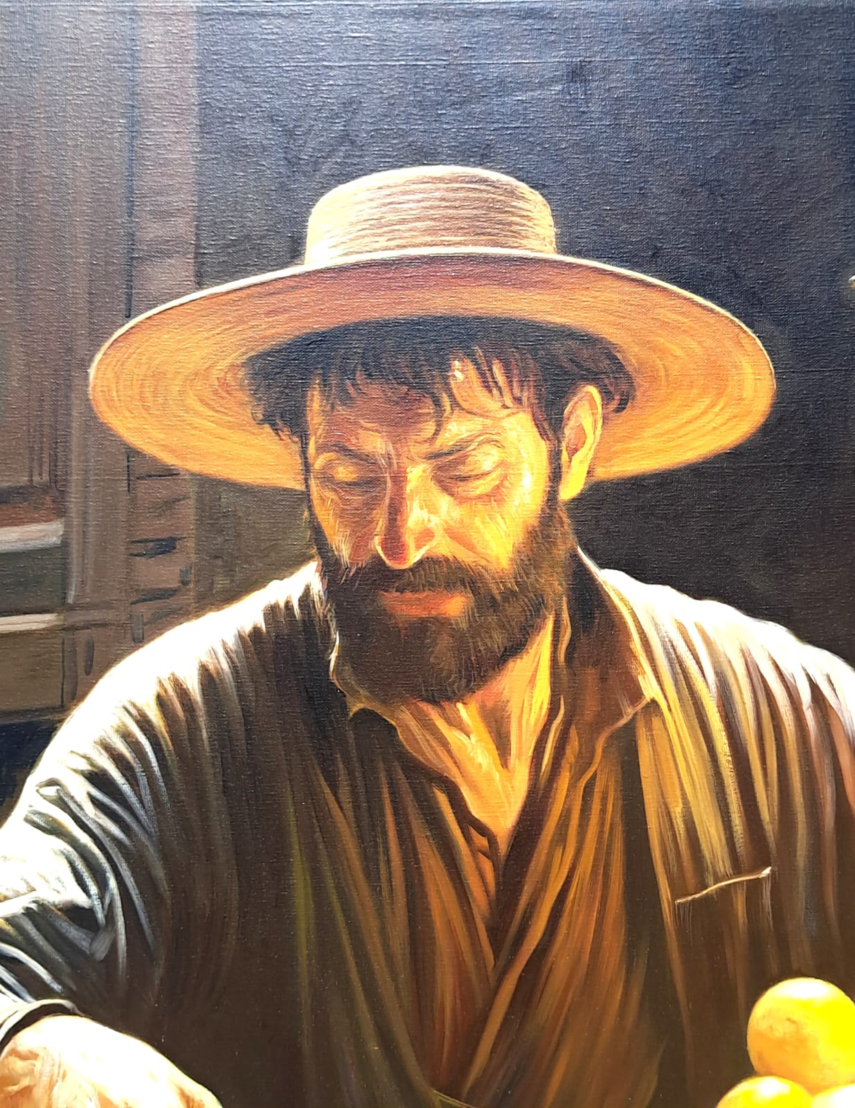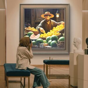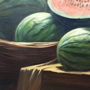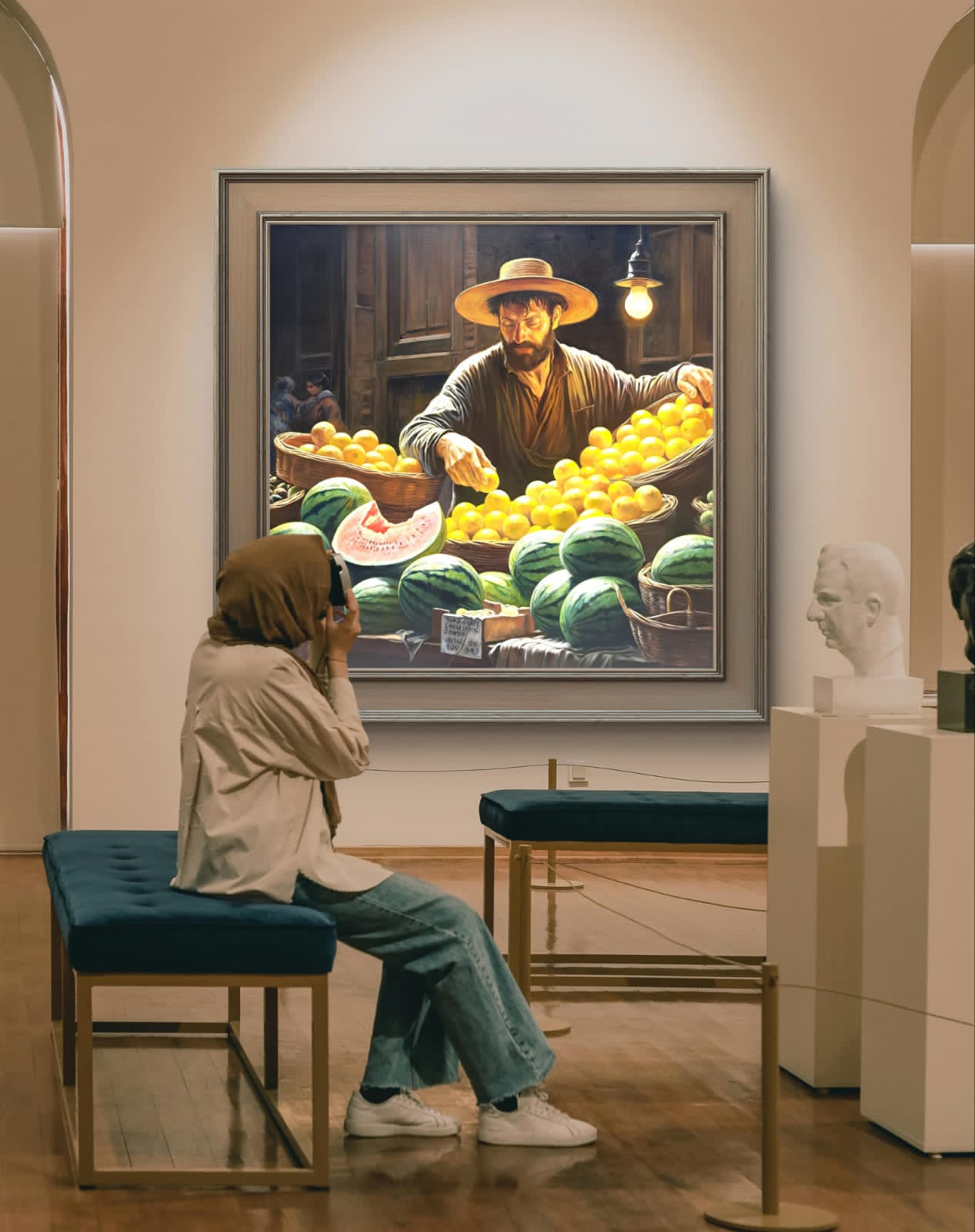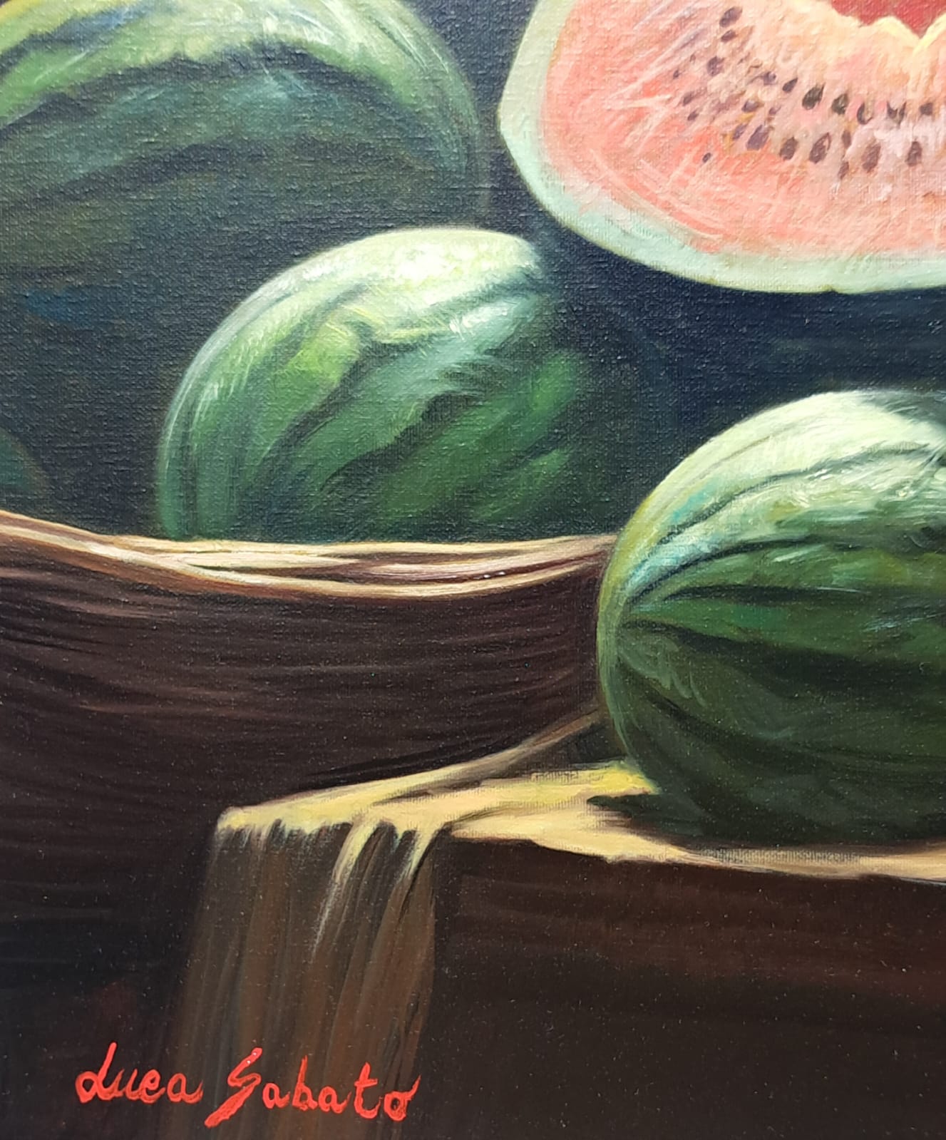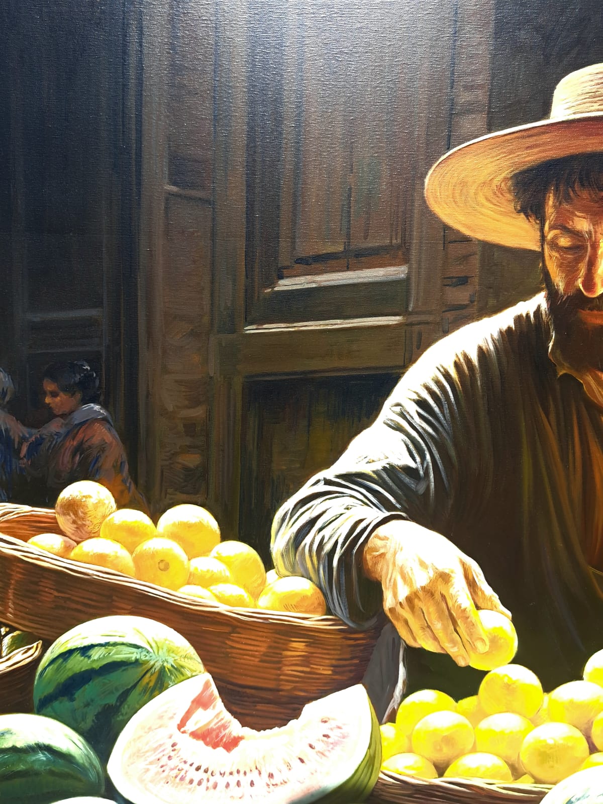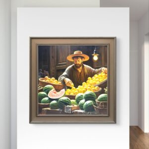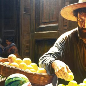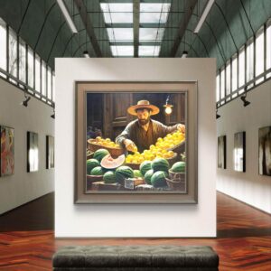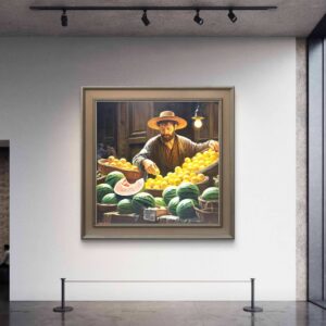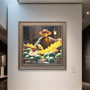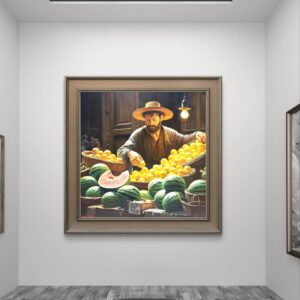 In quest’opera, ho cercato di immortalare l’intimità del lavoro e del raccolto sotto una luce artificiale che diventa quasi mistica. Il venditore, figura solida e radicata, è circondato dall’Oro vibrante dei limoni e dal verde profondo delle angurie, una delle quali ho voluto squarciare per rivelare la polpa rossa e carnosa: un inno alla fertilità e all’abbondanza.
