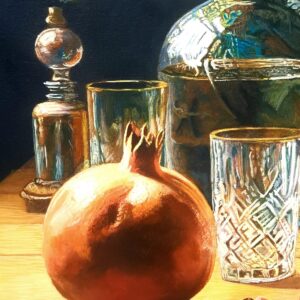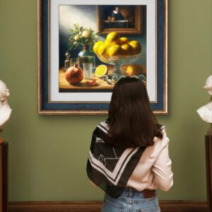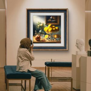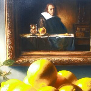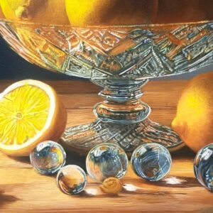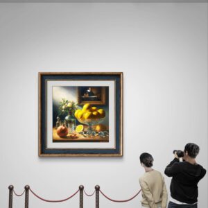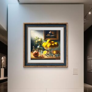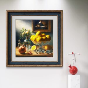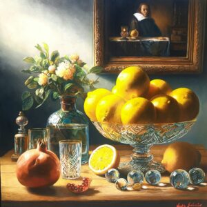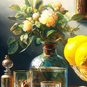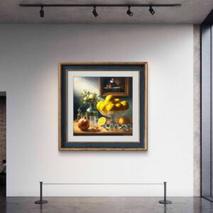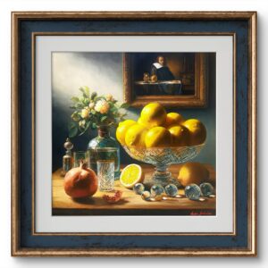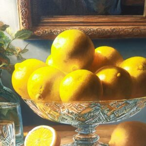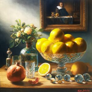 ​In questa composizione, ho cercato di rendere omaggio alla pittura seicentesca fiamminga, utilizzando una luce che filtra dall’esterno e modella ogni oggetto. L’intera scena è un trionfo di Sapori e materia: l’opulenza della fruttiera è enfatizzata dai limoni che straripano, celebrando la ricchezza terrena.