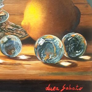 ​Accanto a questa abbondanza, ho inserito bicchieri di cristallo sfaccettati e un vaso con fiori gialli, simboli della bellezza effimera e dell’inevitabile caducità. Il gioco continua sul tavolo con le biglie di vetro, che riflettono la luce e distorcono la realtà, invitandoci a chiederci quanto sia reale ciò che possediamo.