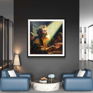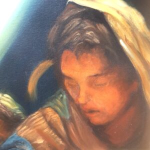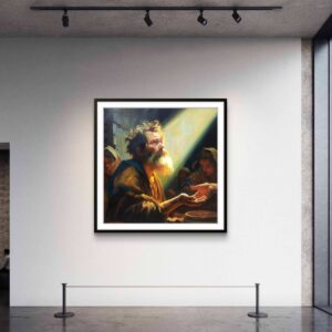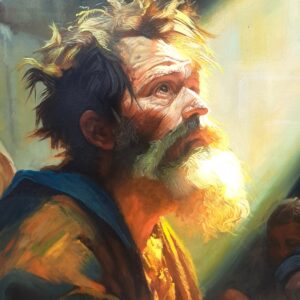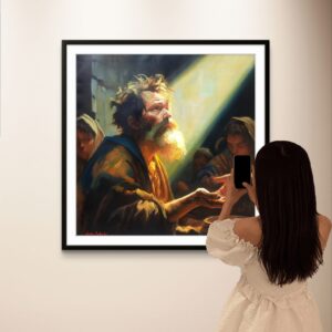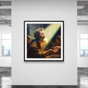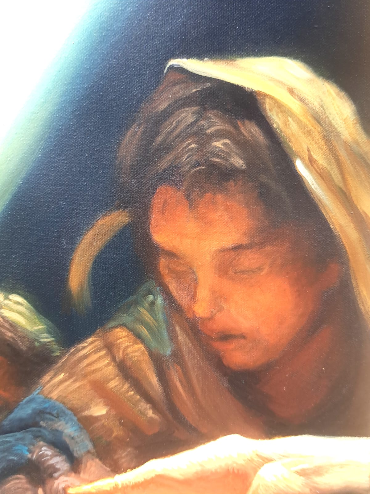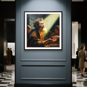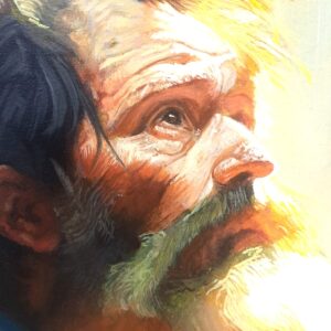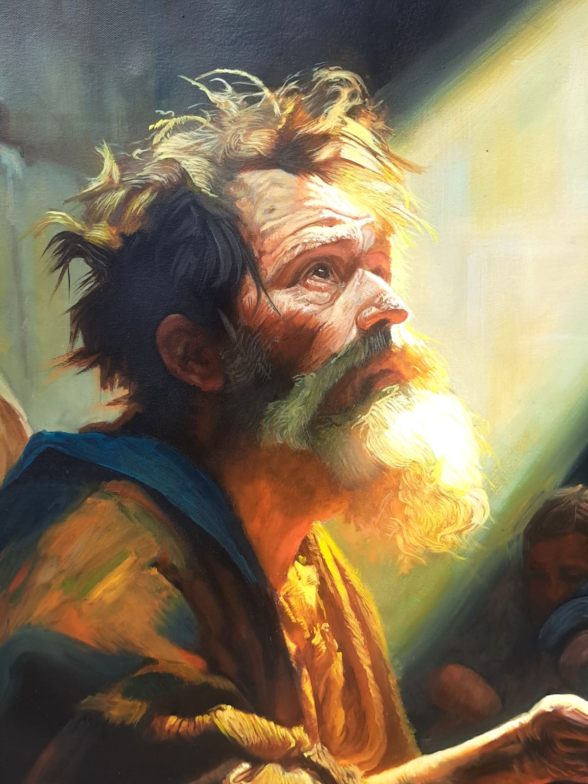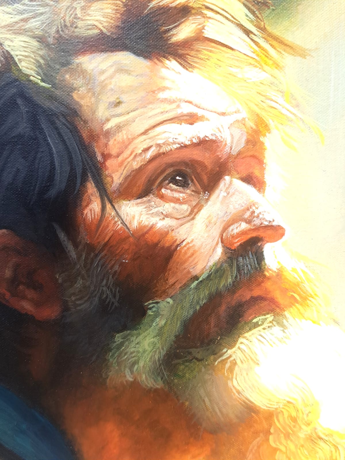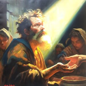 ​Il fulcro emotivo e tecnico della tela è il raggio di luce diagonale che irrompe dall’alto. Ho utilizzato il chiaroscuro per far sì che questa luce non sia solo illuminazione, ma diventi un simbolo di Speranza e di Grazia divina che squarcia il buio della miseria. Il contrasto è fortissimo: la luce accarezza la barba e i capelli dell’uomo, trasformando l’ordinario in trascendente e conferendo una nobiltà quasi sacra al suo bisogno.