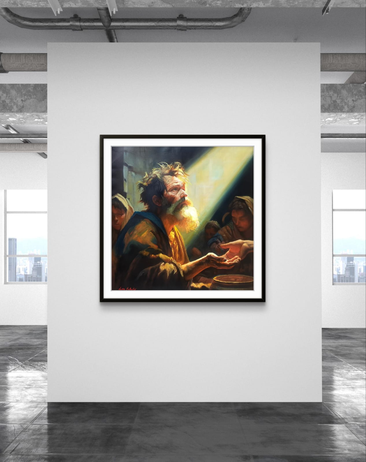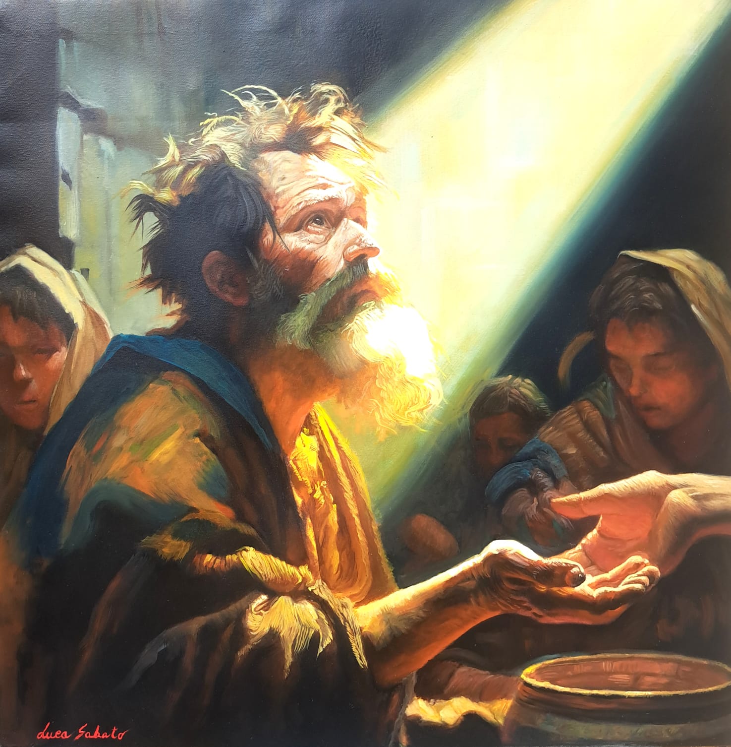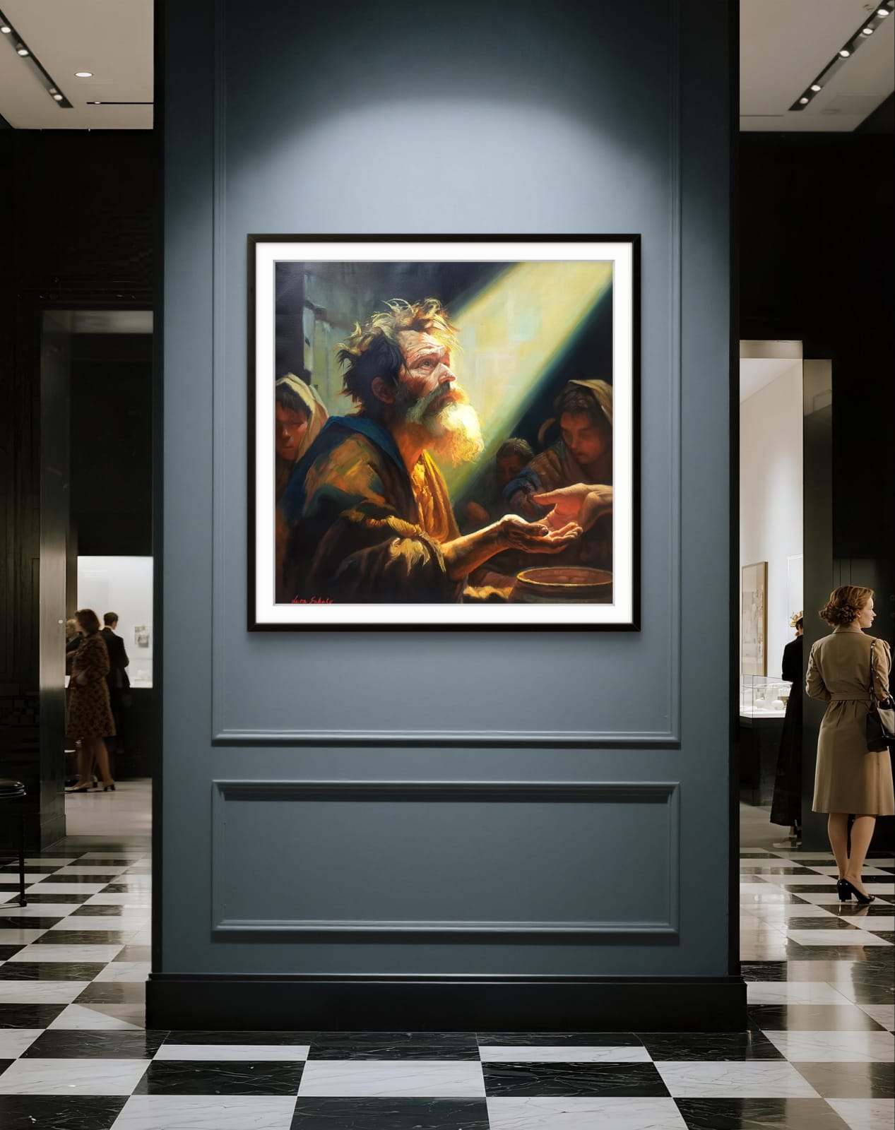 ​In questa scena intensa, ho scelto di immortalare la figura di un uomo anziano e povero. Nonostante la sua condizione e la presenza di figure anonime che si ritirano nell’ombra, il protagonista innalza lo sguardo in un atto di pura fede o disperata attesa. La sua mano è tesa e aperta, pronta a ricevere un piccolo gesto di carità, mentre un’altra mano si protende dall’ombra per porgergli qualcosa, un’offerta che si intravede appena.