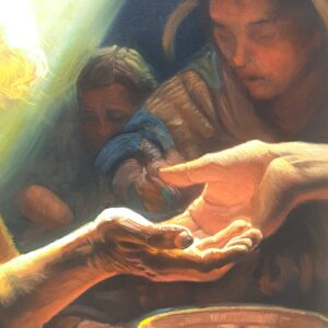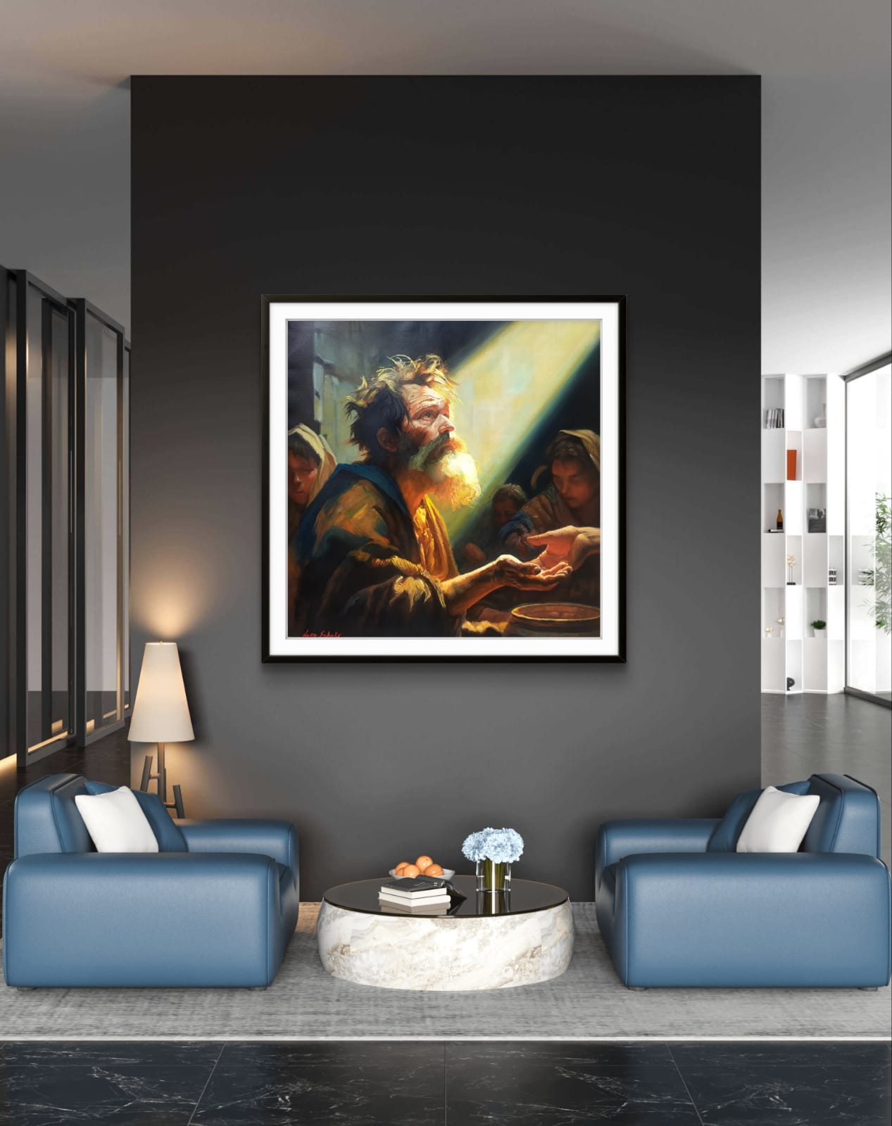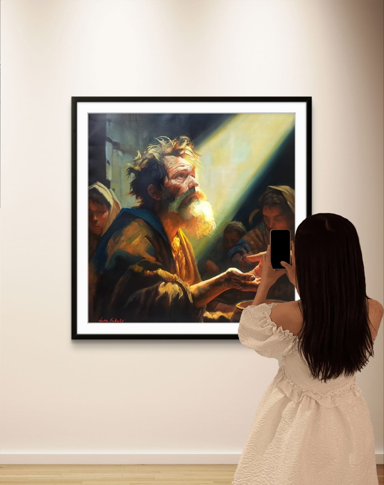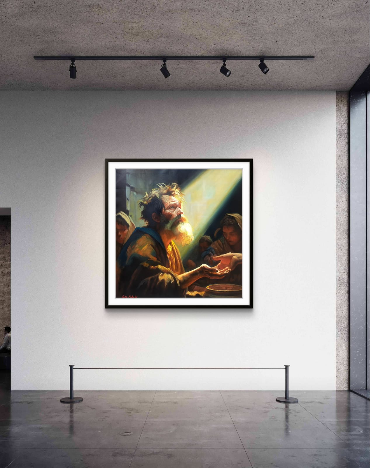 ​In questa scena intensa, ho scelto di immortalare la figura di un uomo anziano e povero. Nonostante la sua condizione e la presenza di figure anonime che si ritirano nell’ombra, il protagonista innalza lo sguardo in un atto di pura fede o disperata attesa. La sua mano è tesa e aperta, pronta a ricevere un piccolo gesto di carità, mentre un’altra mano si protende dall’ombra per porgergli qualcosa, un’offerta che si intravede appena.