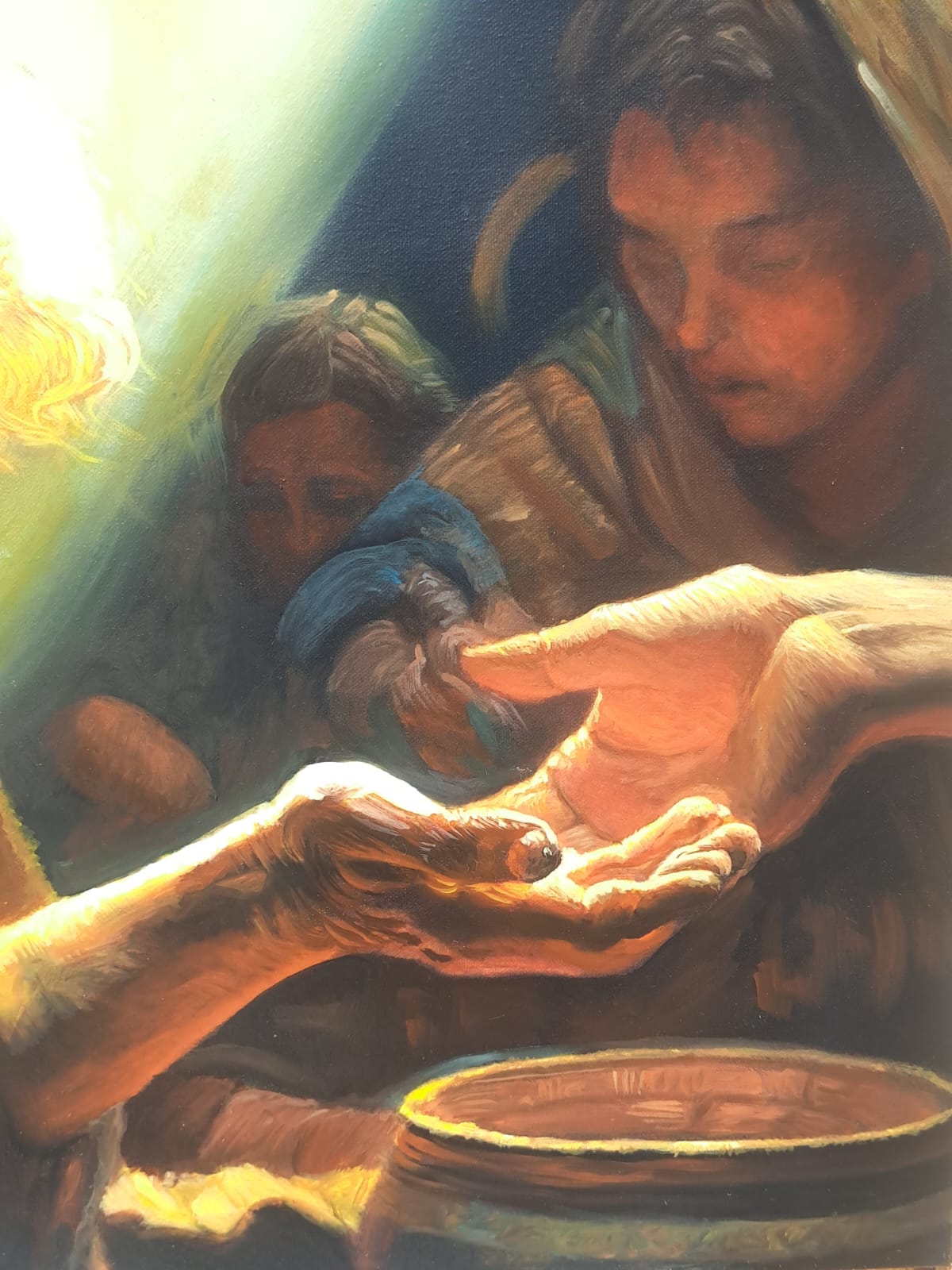 ​​Ho voluto creare un’opera che fosse un inno alla dignità umana di fronte al bisogno, attraverso l’uso drammatico della luce, mutuato dalla grande tradizione pittorica.