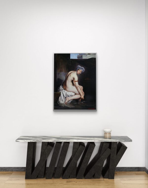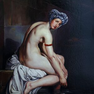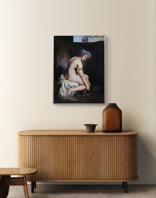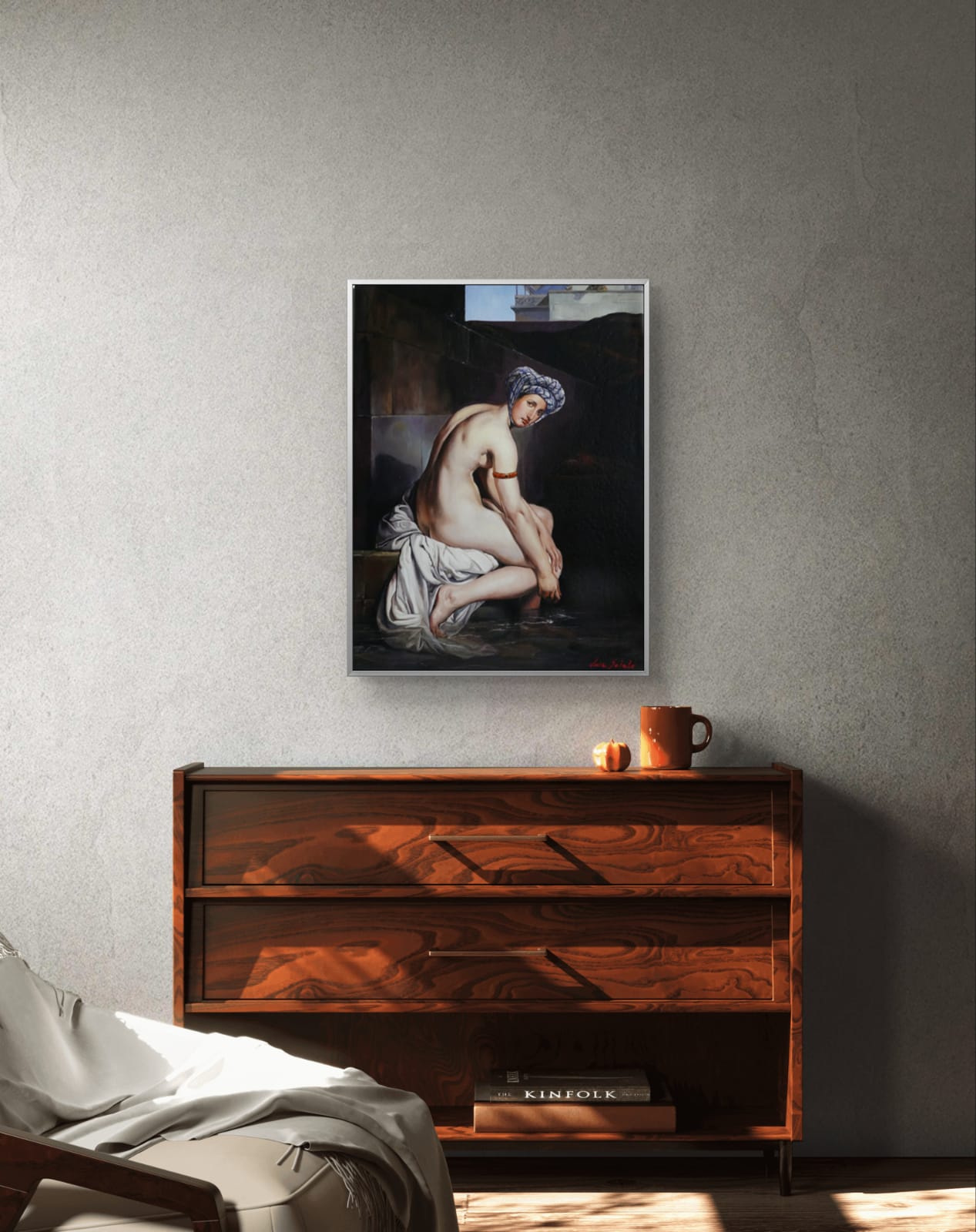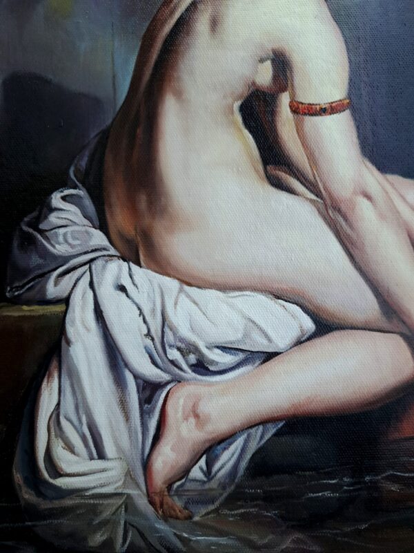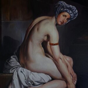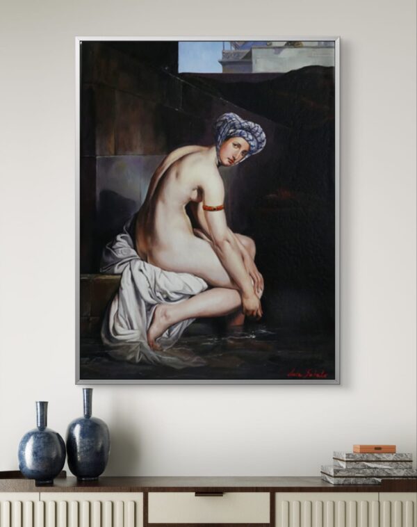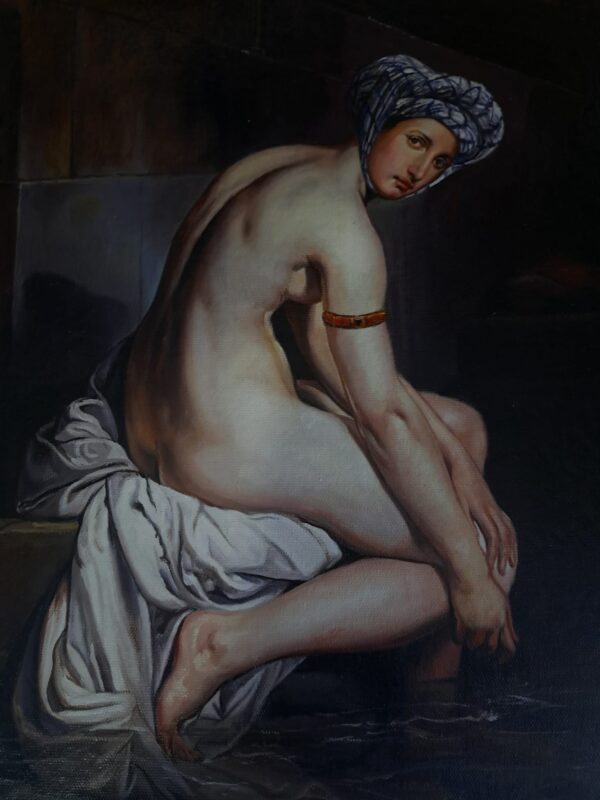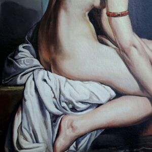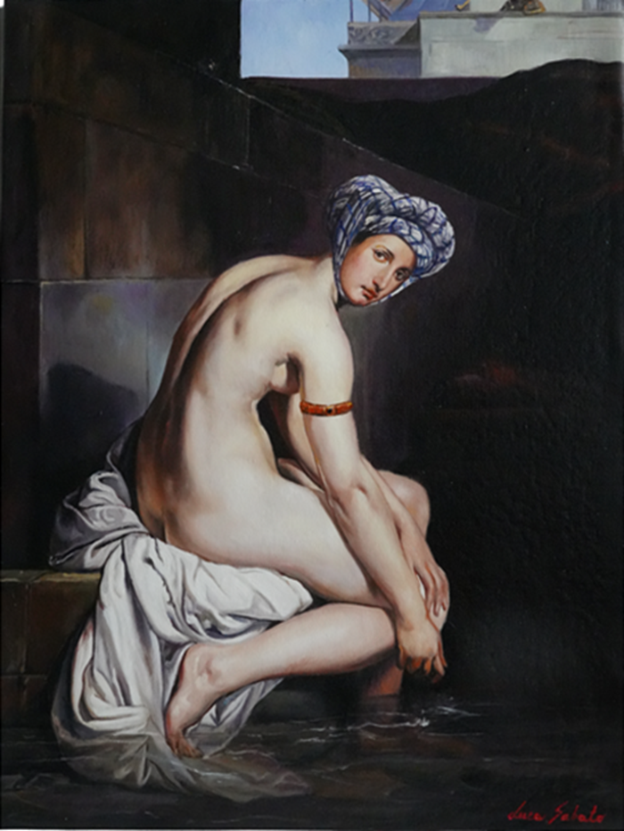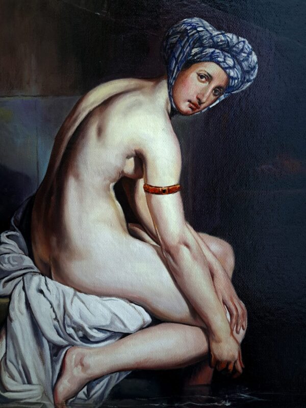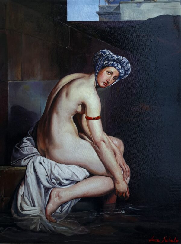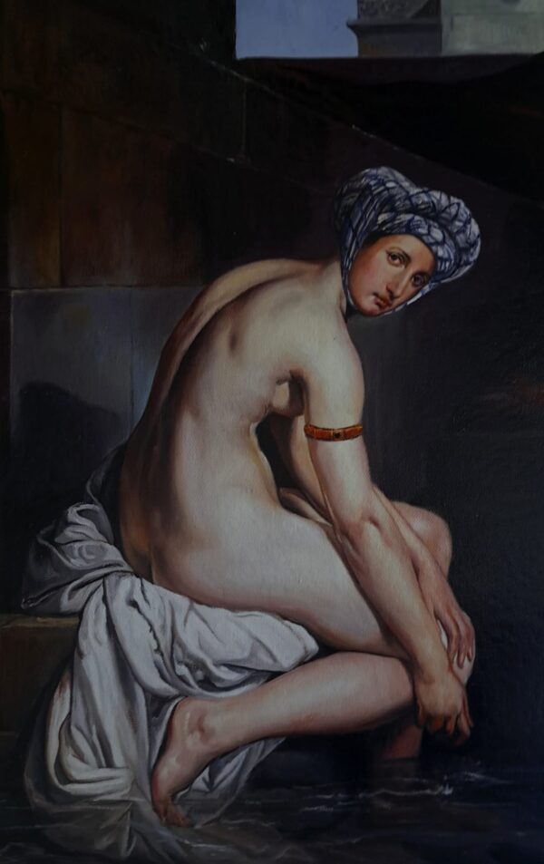 ” Con Tra il velo e la pelle”, ho cercato di avvicinarmi, con grande rispetto, al linguaggio lirico e delicato che Francesco Hayez ha saputo donare alla figura di Bathsheba. Quella sua capacità di fondere grazia femminile e introspezione mi ha colpito profondamente, spingendomi a riflettere su come la bellezza possa esprimere una dimensione interiore senza clamore, quasi in silenzio.