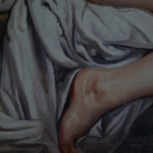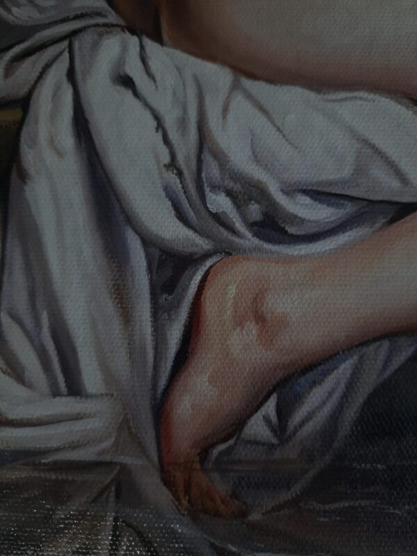 Ho lavorato con attenzione ai passaggi tonali dell’incarnato, affinché ogni variazione suggerisse una vibrazione emotiva. Anche i drappeggi non sono solo un esercizio formale: li ho pensati come parte del respiro della scena, in dialogo costante con il corpo, con la luce e con l’aria che lo circonda.