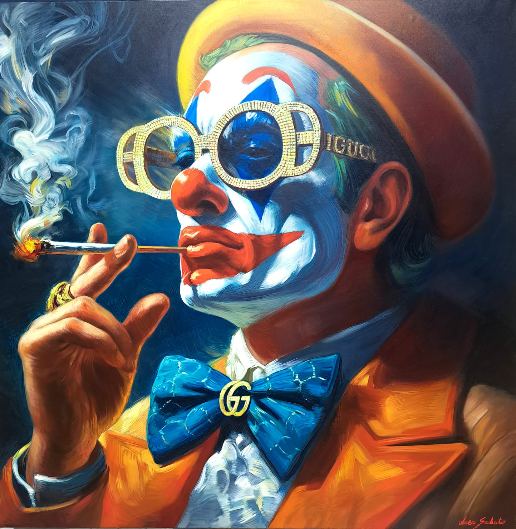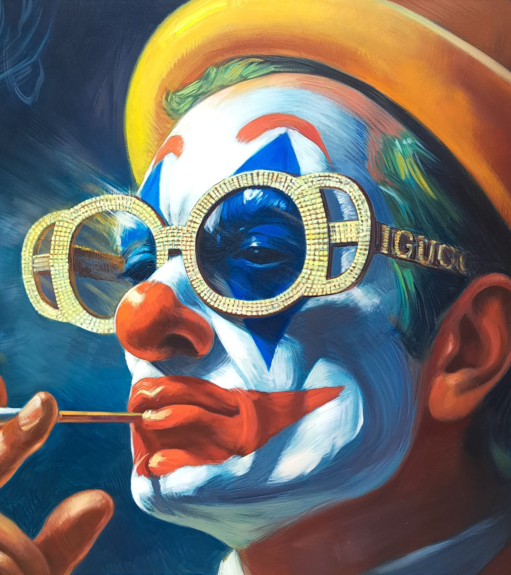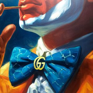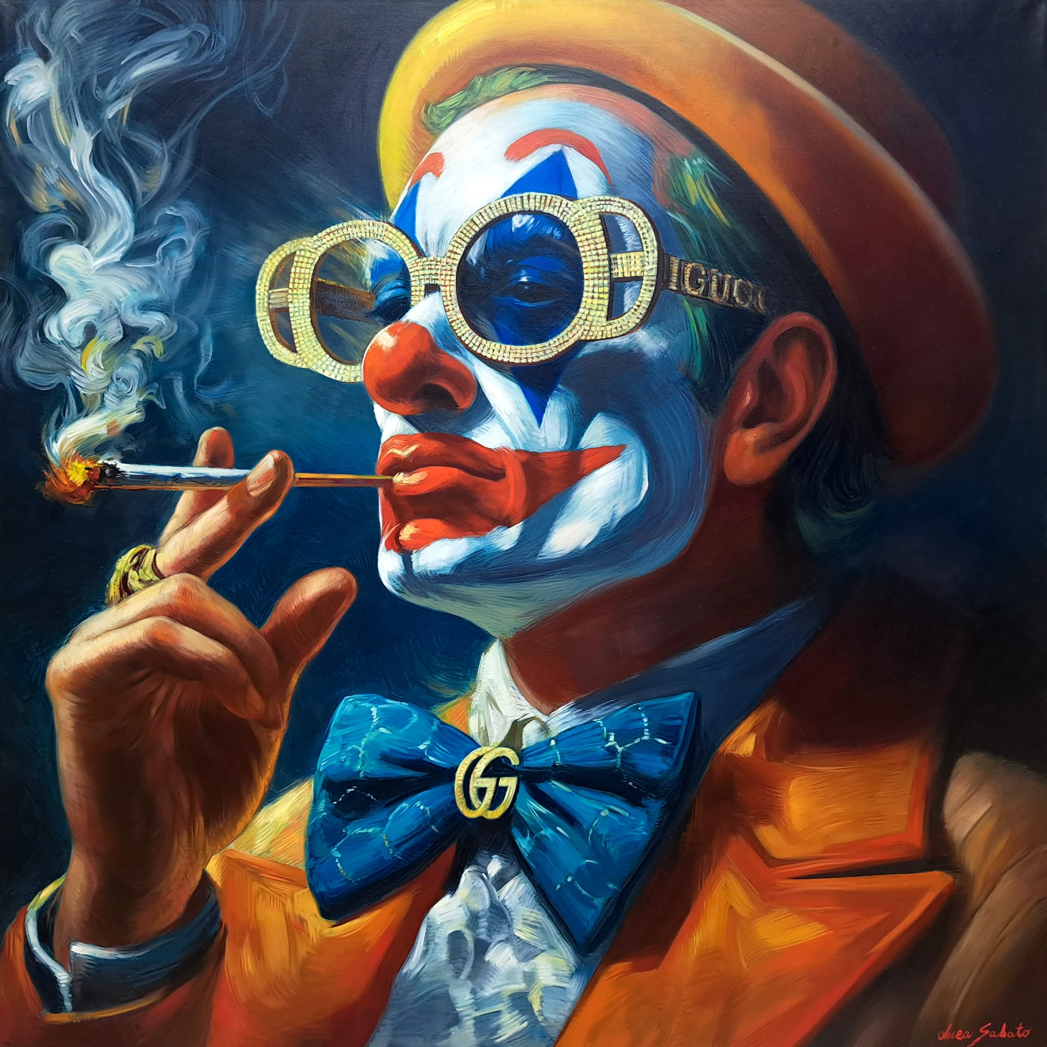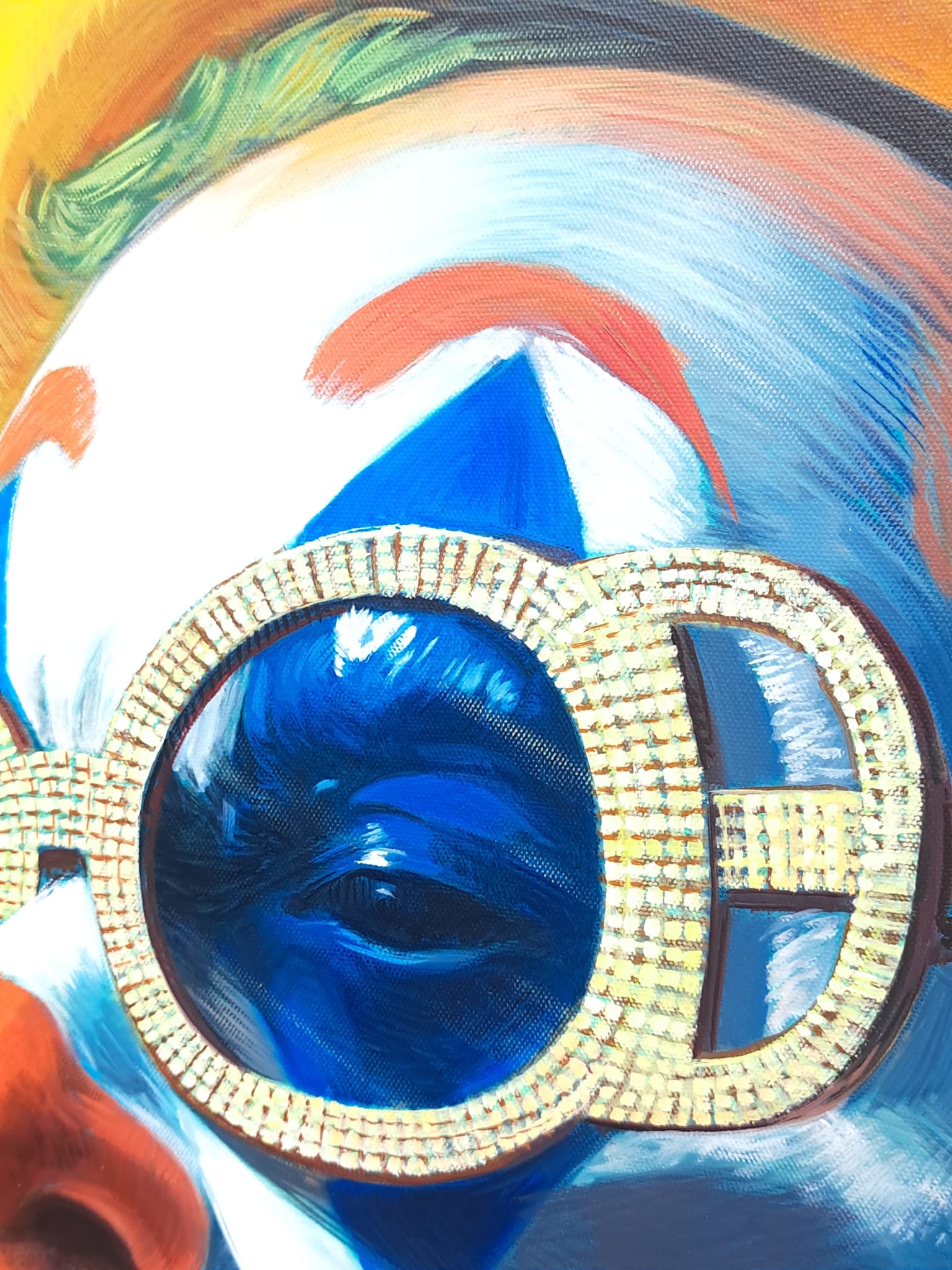 In questa tela, ho scelto di reinventare l’iconografia classica del Clown, figura che tradizionalmente incarna gioia e malinconia autentica, rivestendola di simboli del lusso contemporaneo. Il trucco iconico sul volto, che dovrebbe evocare un’emozione pura, viene immediatamente filtrato e amplificato da un paio di sfolgoranti occhiali da sole Gucci tempestati di strass, affiancati da un altrettanto vistoso papillon blu Gucci. Il cappello a falda larga e il gesto di fumare una sigaretta completano l’immagine di una sofisticazione beffarda.