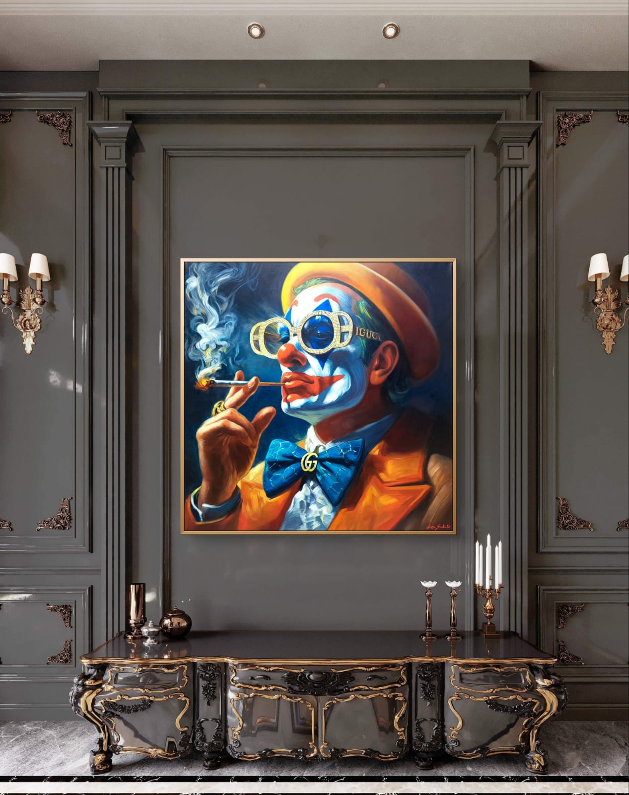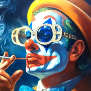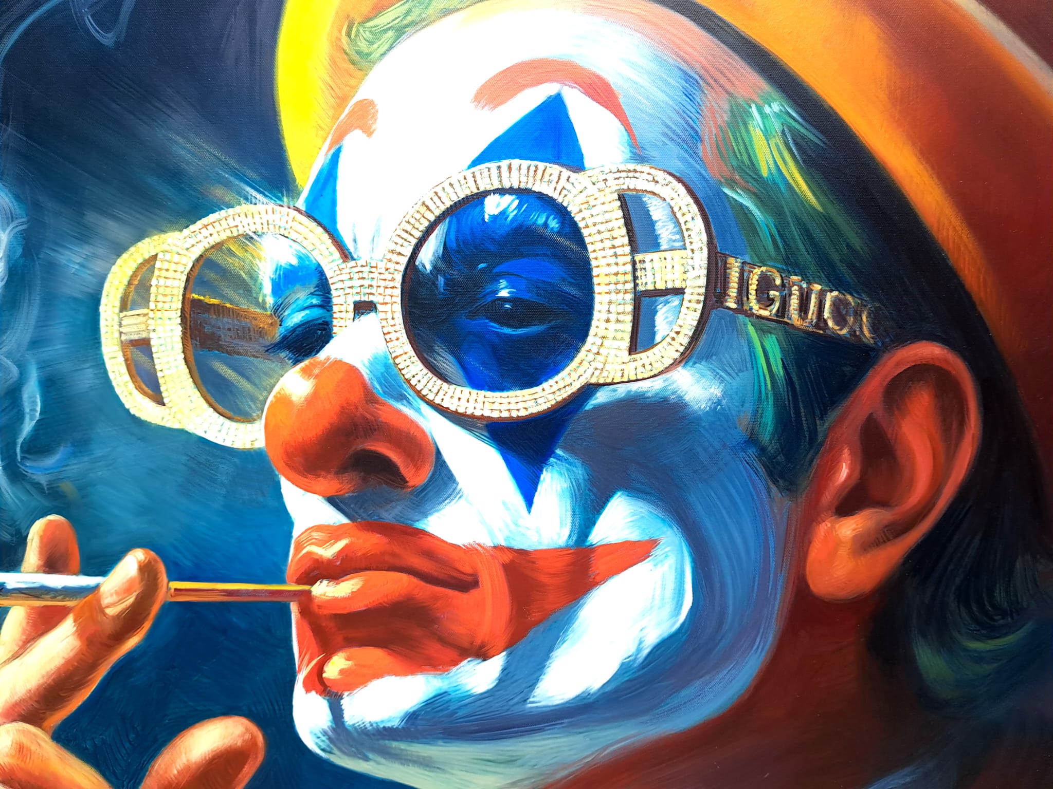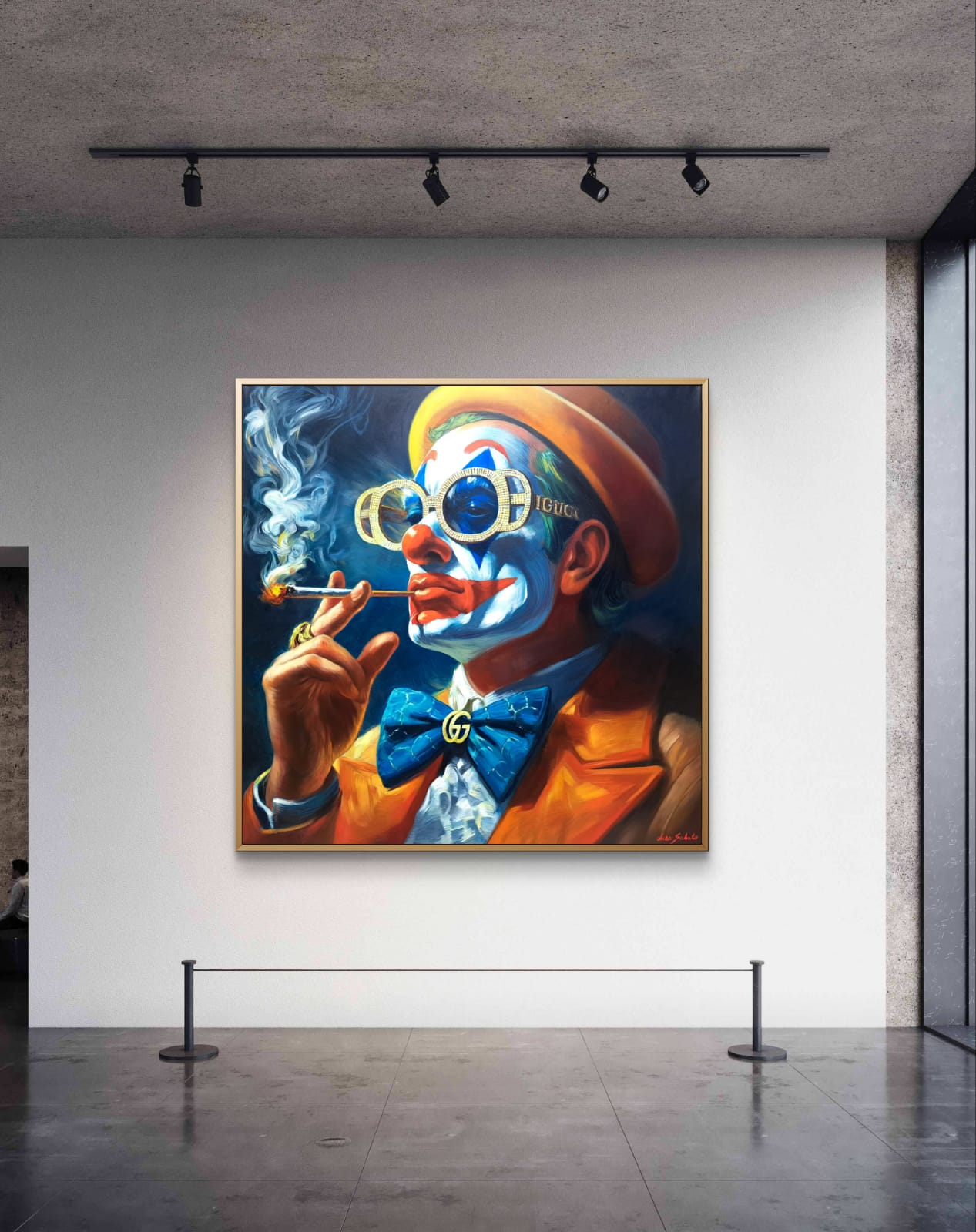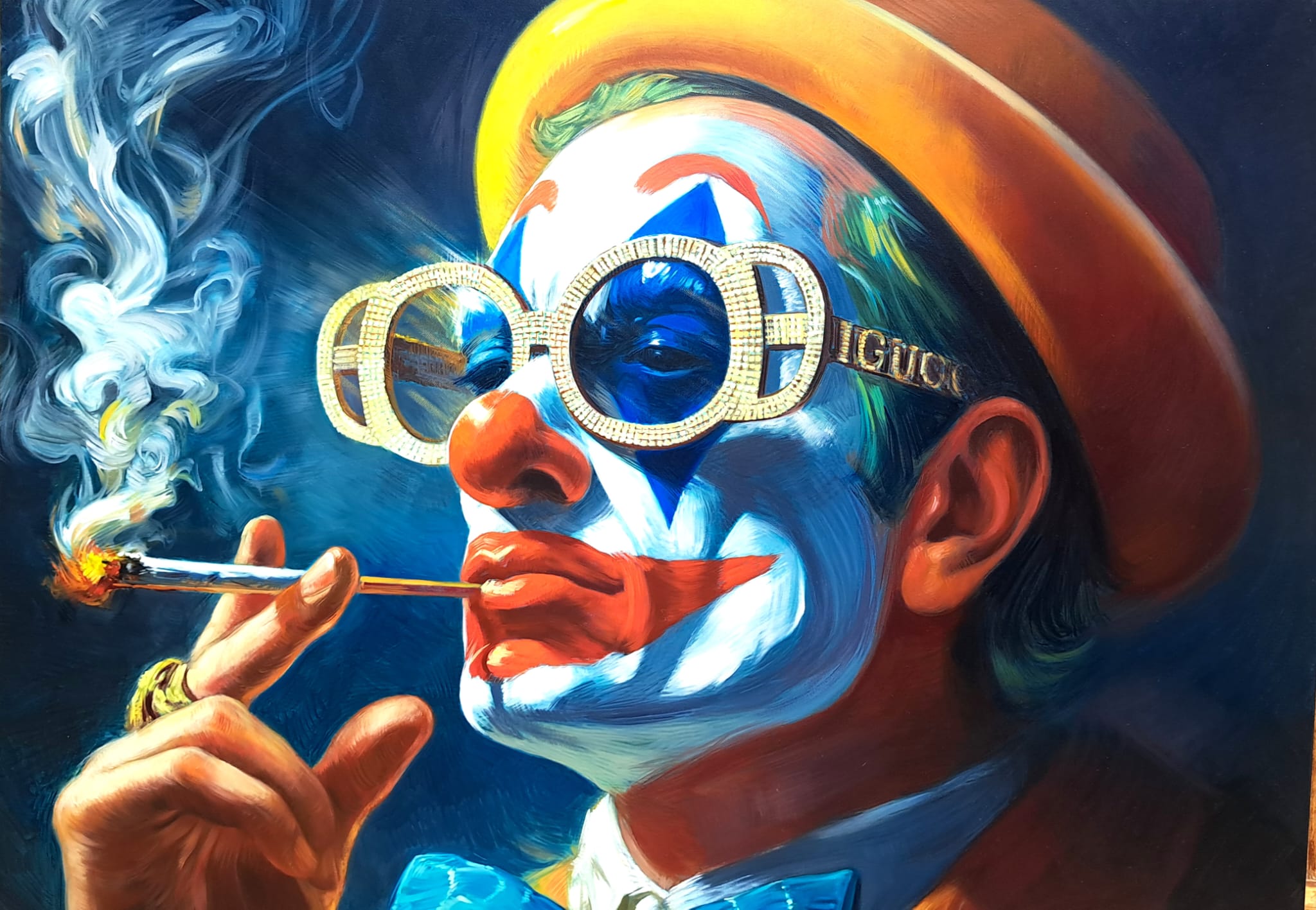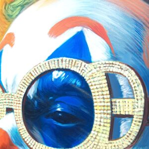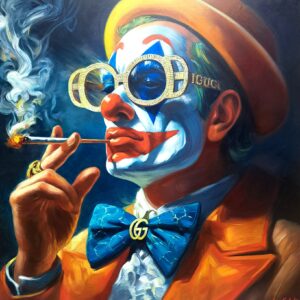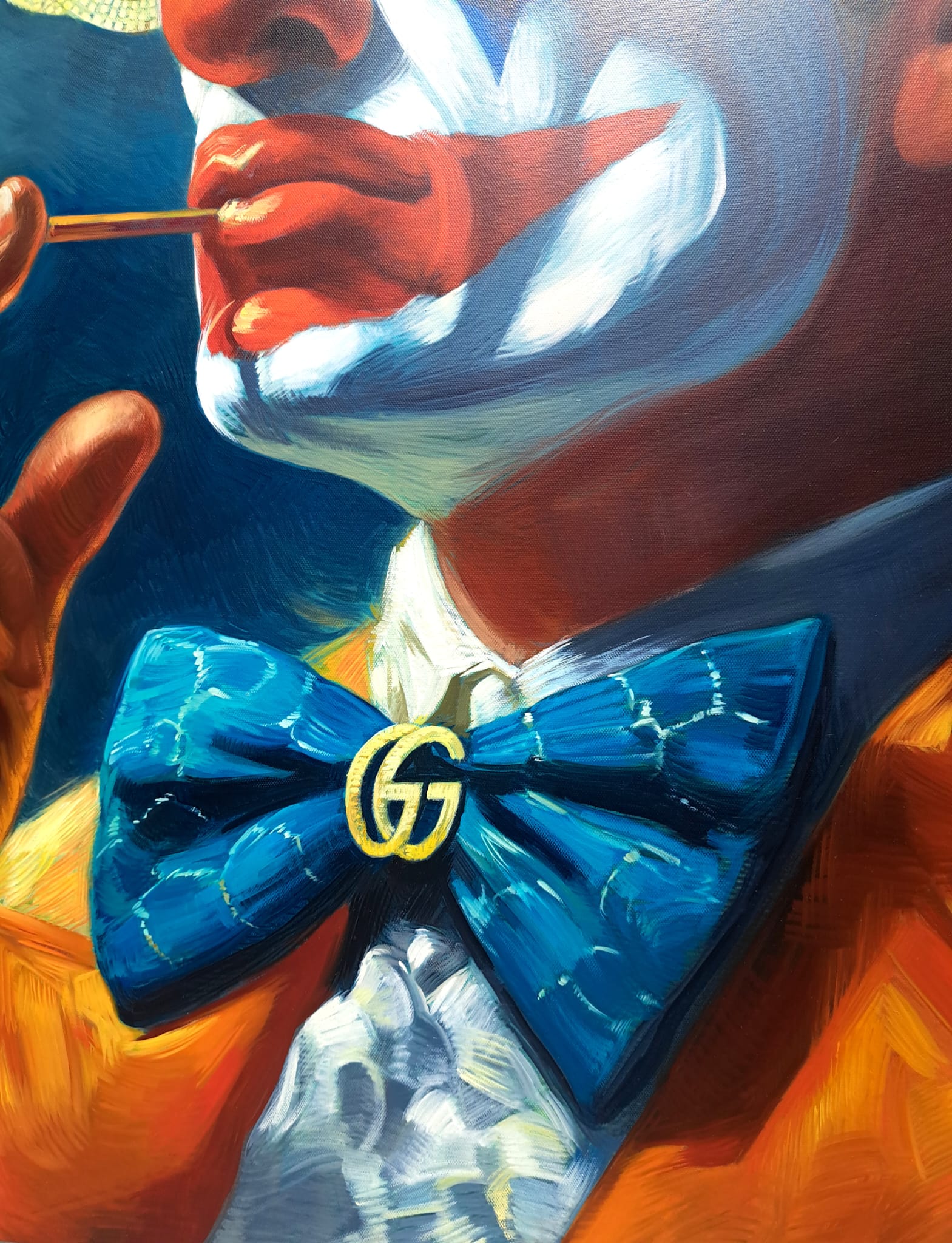 In questa tela, ho scelto di reinventare l’iconografia classica del Clown, figura che tradizionalmente incarna gioia e malinconia autentica, rivestendola di simboli del lusso contemporaneo. Il trucco iconico sul volto, che dovrebbe evocare un’emozione pura, viene immediatamente filtrato e amplificato da un paio di sfolgoranti occhiali da sole Gucci tempestati di strass, affiancati da un altrettanto vistoso papillon blu Gucci. Il cappello a falda larga e il gesto di fumare una sigaretta completano l’immagine di una sofisticazione beffarda.