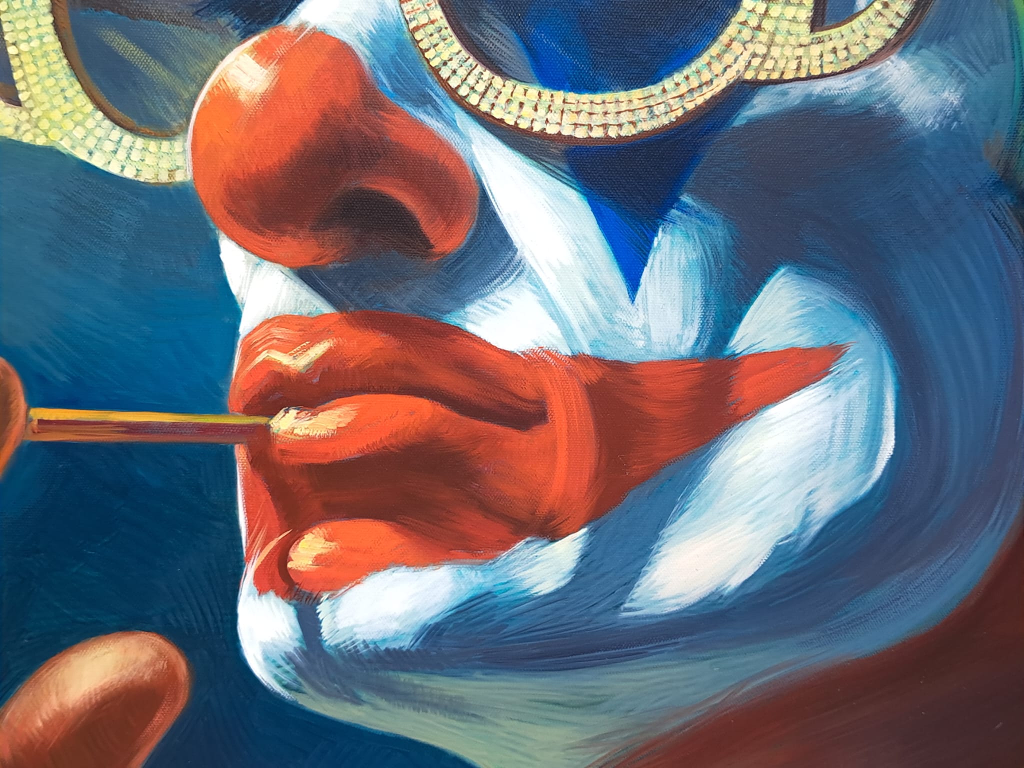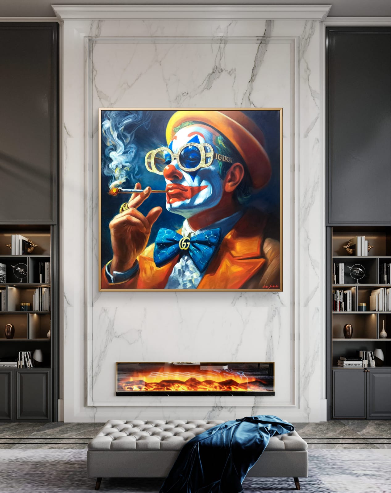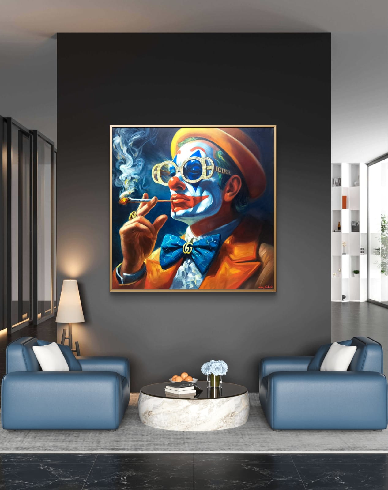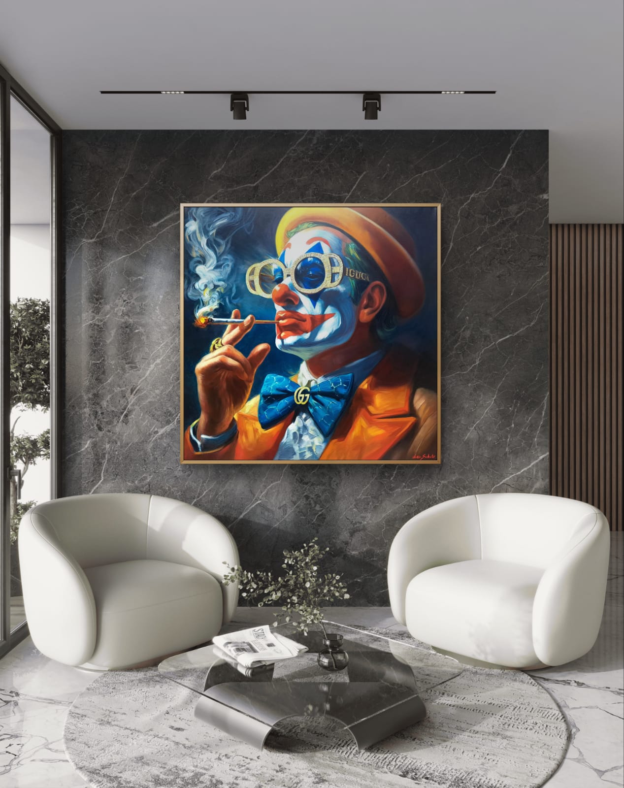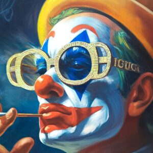 In questa tela, ho scelto di reinventare l’iconografia classica del Clown, figura che tradizionalmente incarna gioia e malinconia autentica, rivestendola di simboli del lusso contemporaneo. Il trucco iconico sul volto, che dovrebbe evocare un’emozione pura, viene immediatamente filtrato e amplificato da un paio di sfolgoranti occhiali da sole Gucci tempestati di strass, affiancati da un altrettanto vistoso papillon blu Gucci. Il cappello a falda larga e il gesto di fumare una sigaretta completano l’immagine di una sofisticazione beffarda.